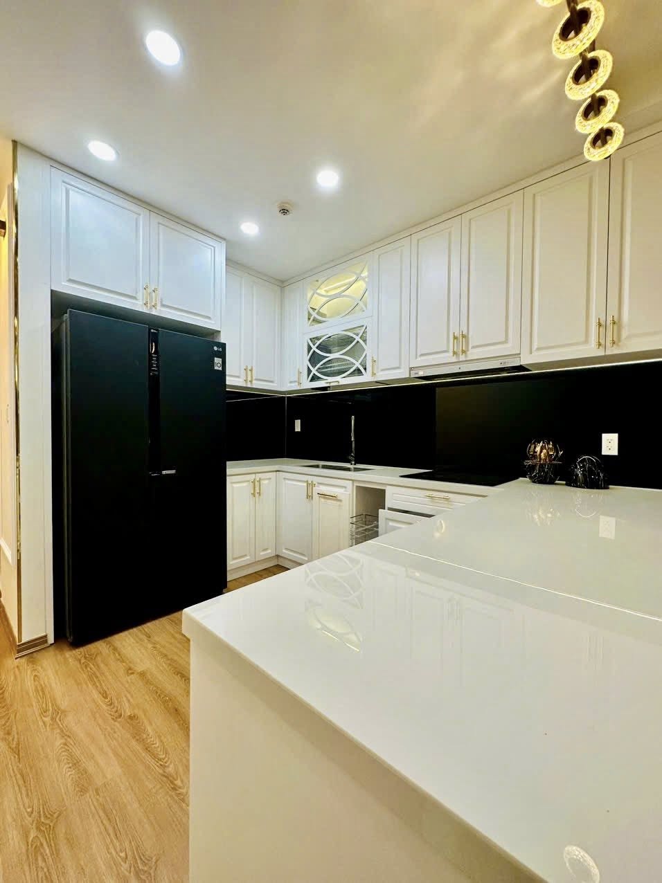 Vật liệu: Gỗ Ba Thanh chống ẩm, cánh CNC, phụ kiện bếp cao cấp, giấy dán tường, rèm chống nắng, tranh treo tường