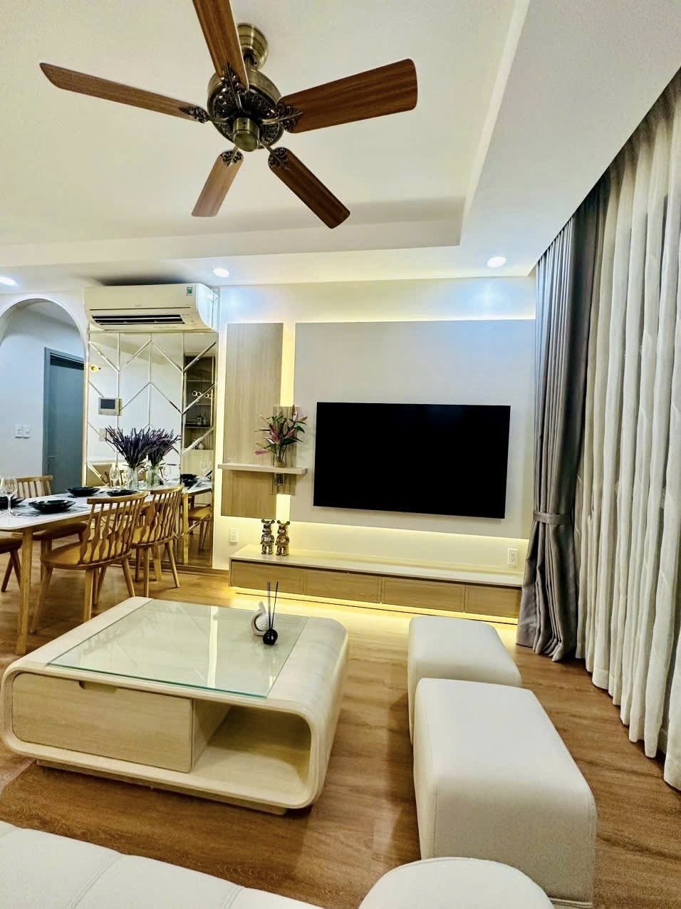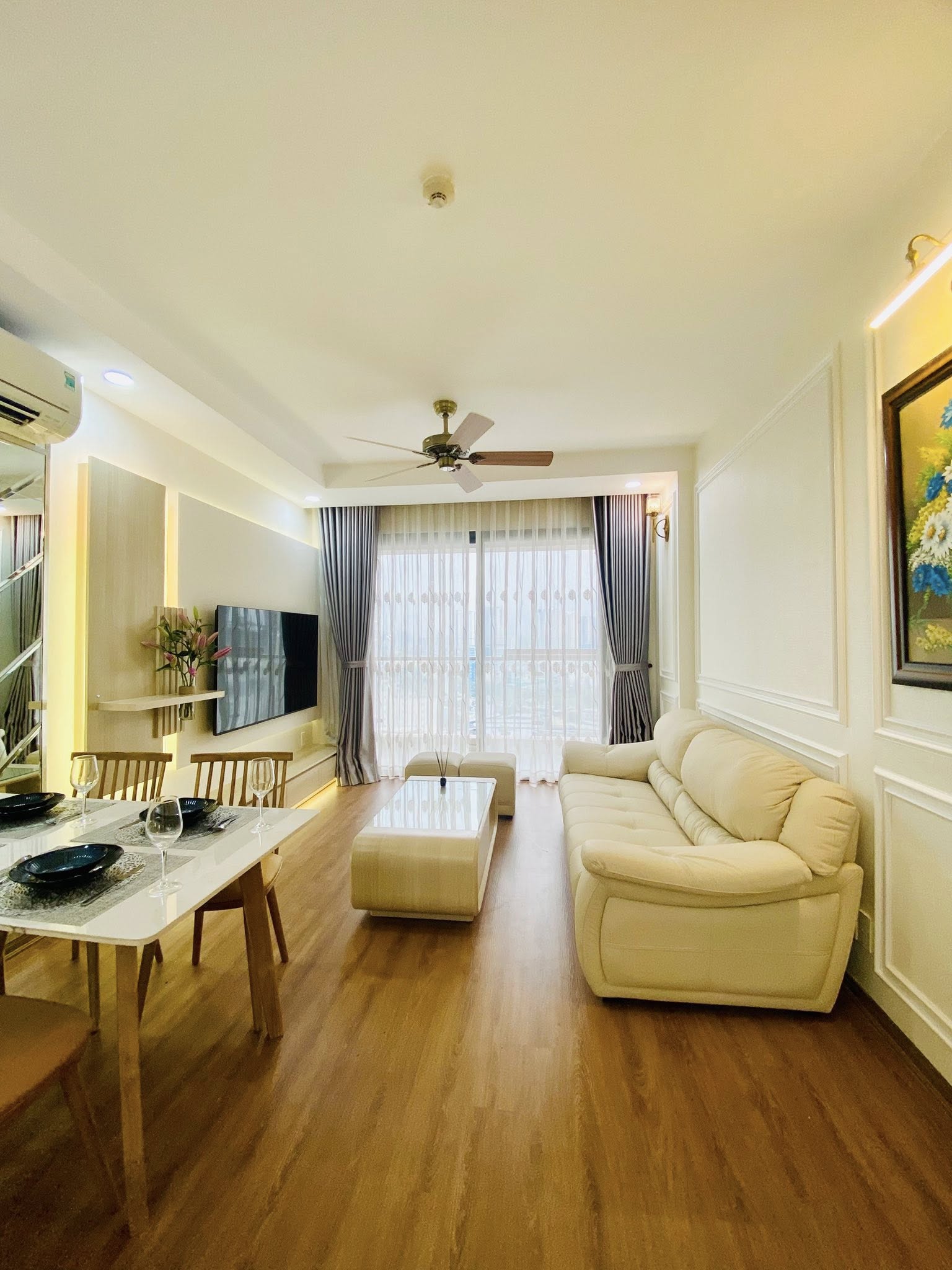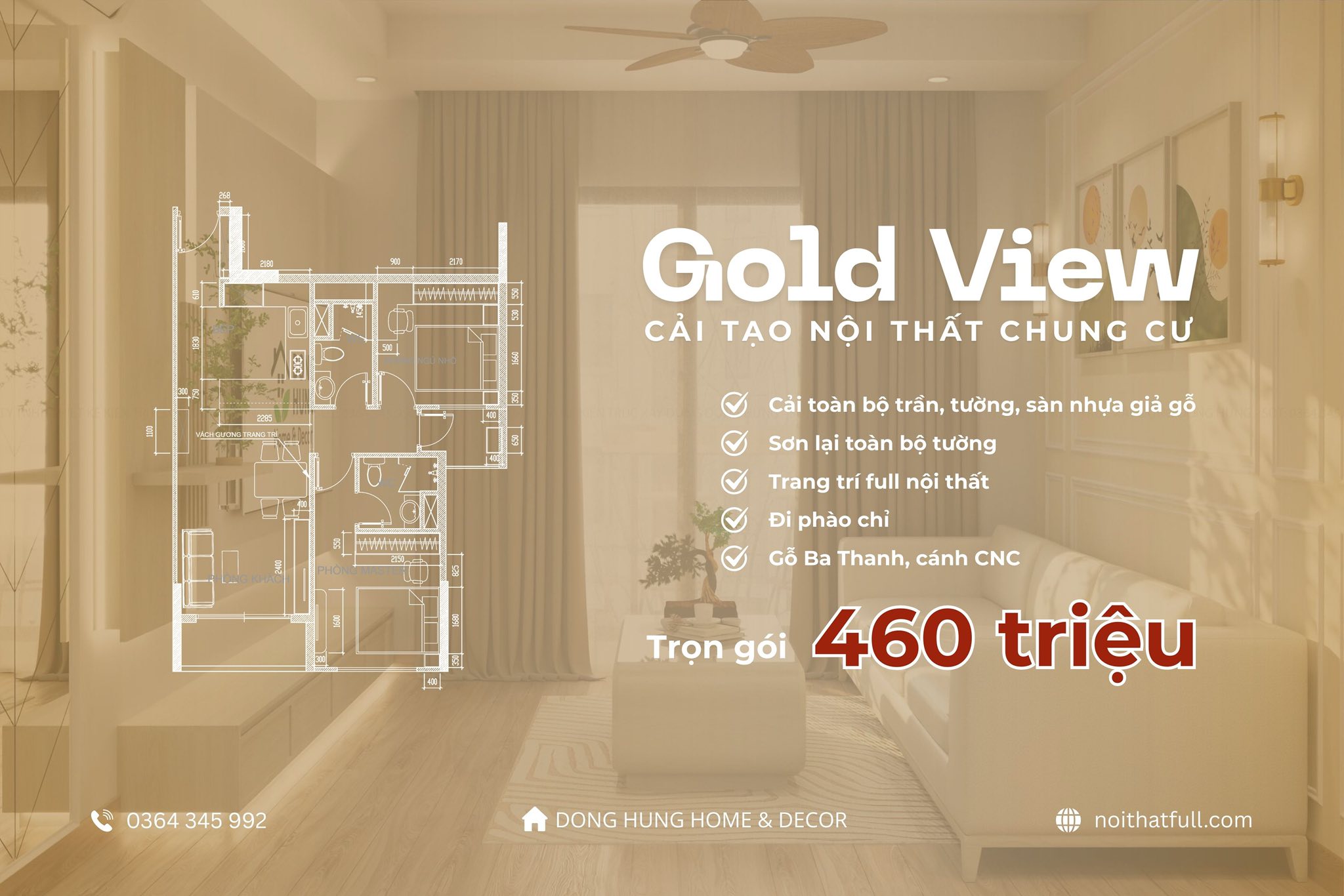 Hạng mục cải tạo: Trần, tường, sàn nhựa giả gỗ, sơn toàn bộ, full nội thất (bàn ghế, quạt, đèn vách…), phào chỉ, giấy dán tường, tranh treo tường, rèm chống nắng