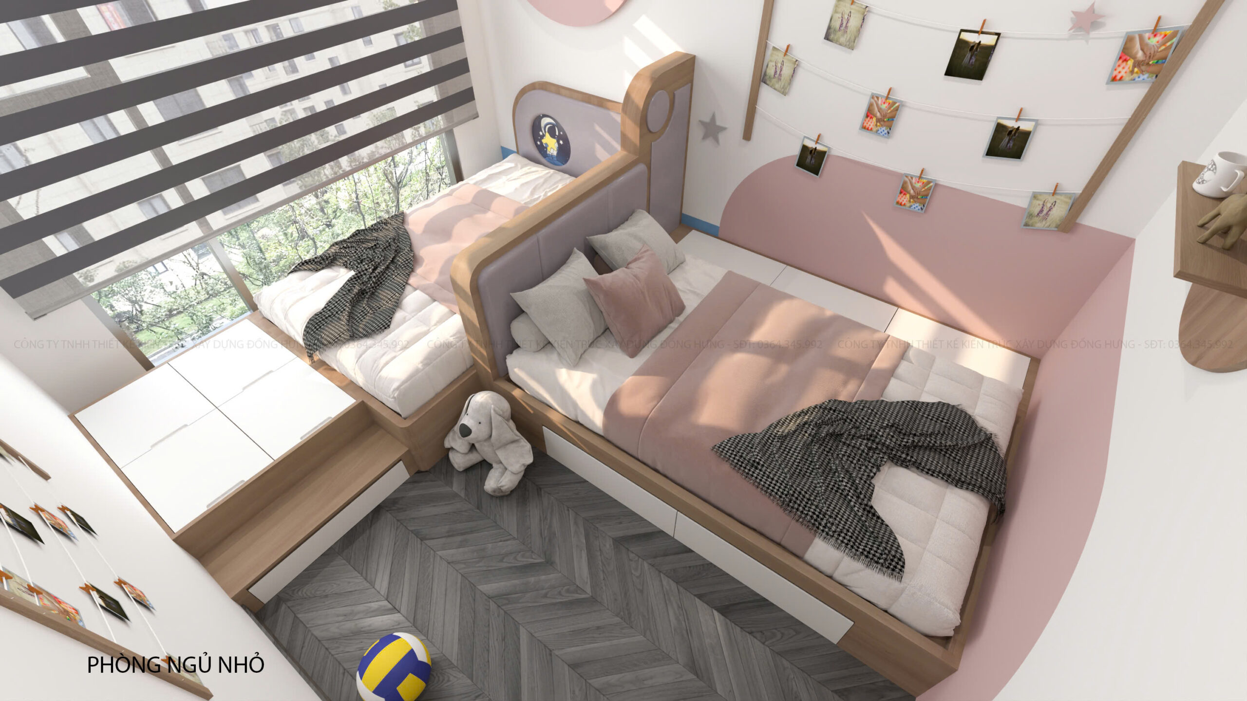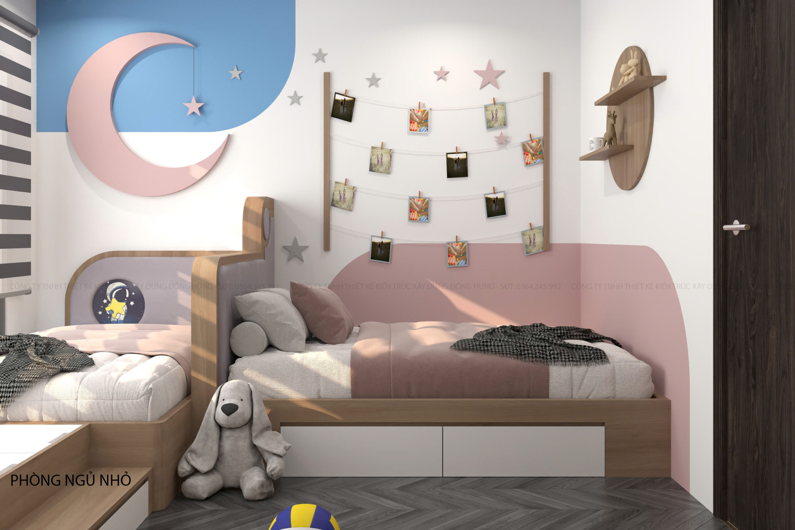 Điểm đặc biệt là phong cách trang trí dễ thương, sử dụng các gam màu tươi sáng như hồng pastel điểm nhẹ ở góc tường, kết hợp cùng những chi tiết ngộ nghĩnh như họa tiết mặt trăng, ngôi sao, góc treo ảnh kỷ niệm… mang lại cảm giác vui tươi và ấm cúng. Đây là không gian lý tưởng cho trẻ em hoặc các bé gái yêu thích sự ngọt ngào và gần gũi.