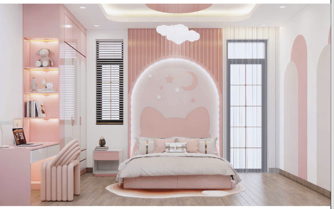 Căn phòng ngủ dành cho bé gái nổi bật với gam hồng pastel nhẹ nhàng. Các chi tiết thiết kế như đầu giường hình tai mèo, đèn mây, tap đầu giường bo cong… tạo nên một không gian vừa dễ thương vừa đầy đủ công năng học tập và nghỉ ngơi.