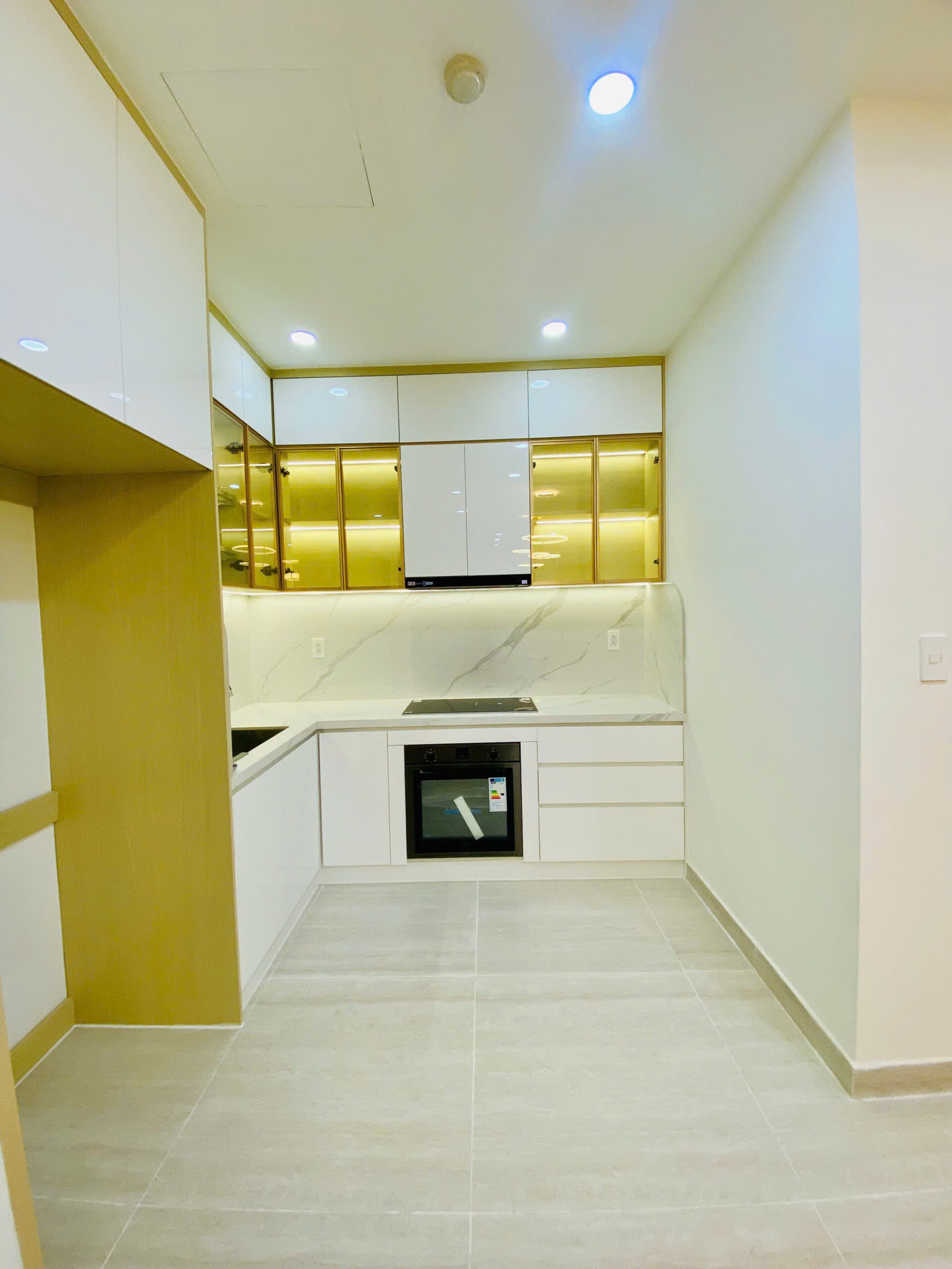 Không gian bếp mang màu trắng chủ đạo – sạch sẽ, hiện đại và tinh gọn. Hệ tủ bếp cánh kính màu gold ánh kim sang trọng, tạo điểm nhấn đắt giá cho gian bếp nhỏ. Các thiết bị bếp như máy hút mùi, bếp âm, chậu rửa đều được bố trí hợp lý, đảm bảo tiện nghi và thẩm mỹ.