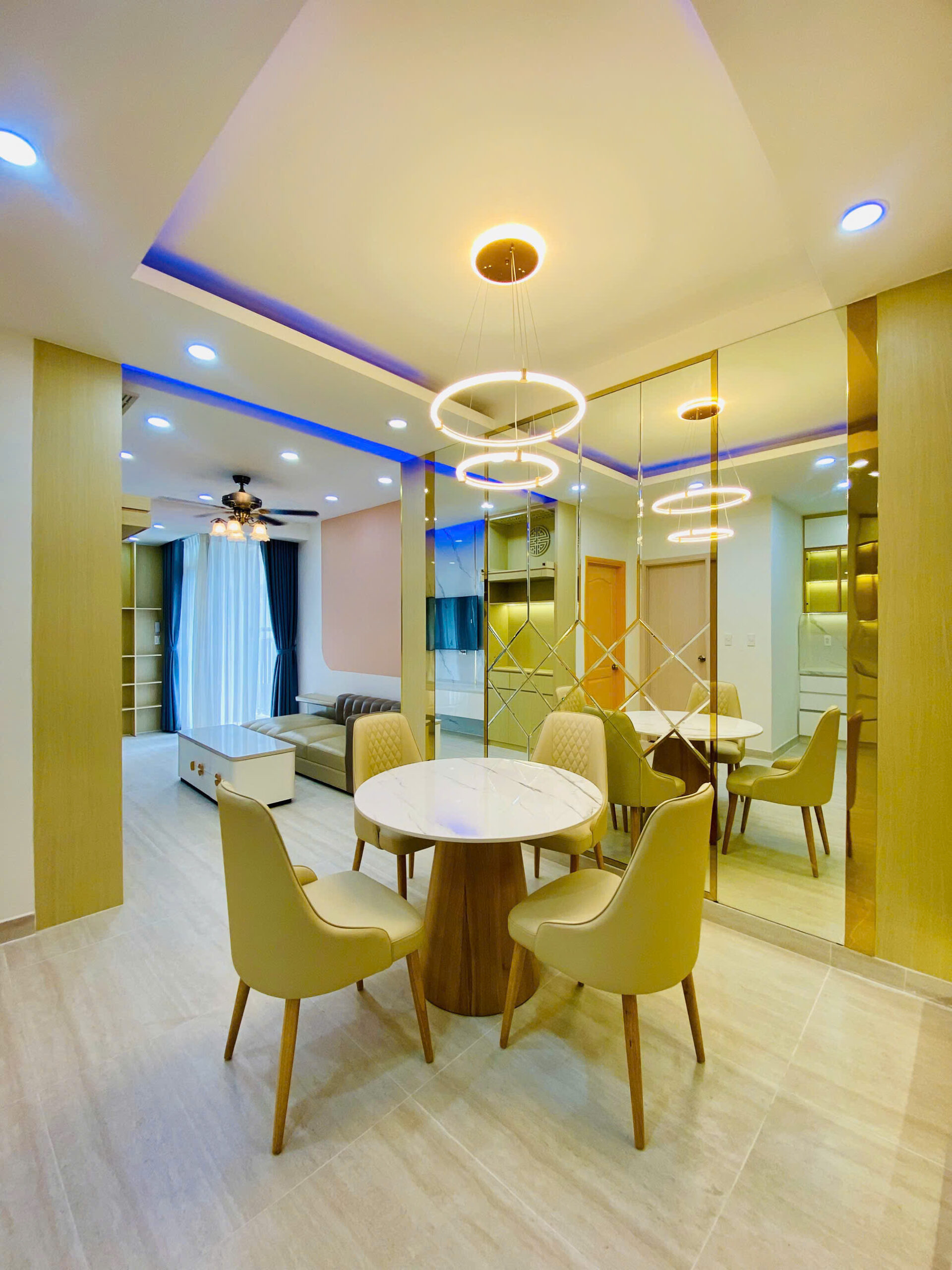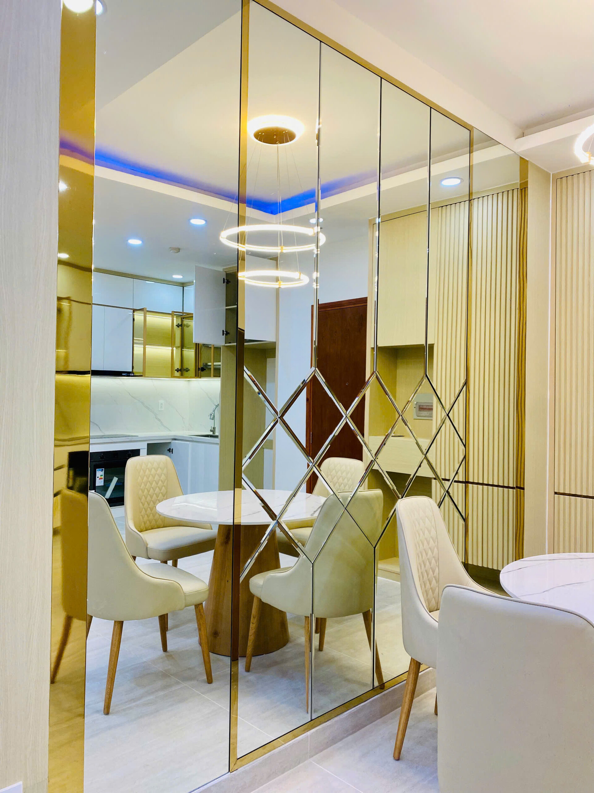 Bước vào căn hộ, phòng khách đón ánh sáng nhẹ nhàng với gương trang trí nghệ thuật được bố trí khéo léo – không chỉ tăng chiều sâu mà còn giúp mở rộng thị giác không gian, khiến căn hộ trở nên rộng rãi và sang trọng hơn.
