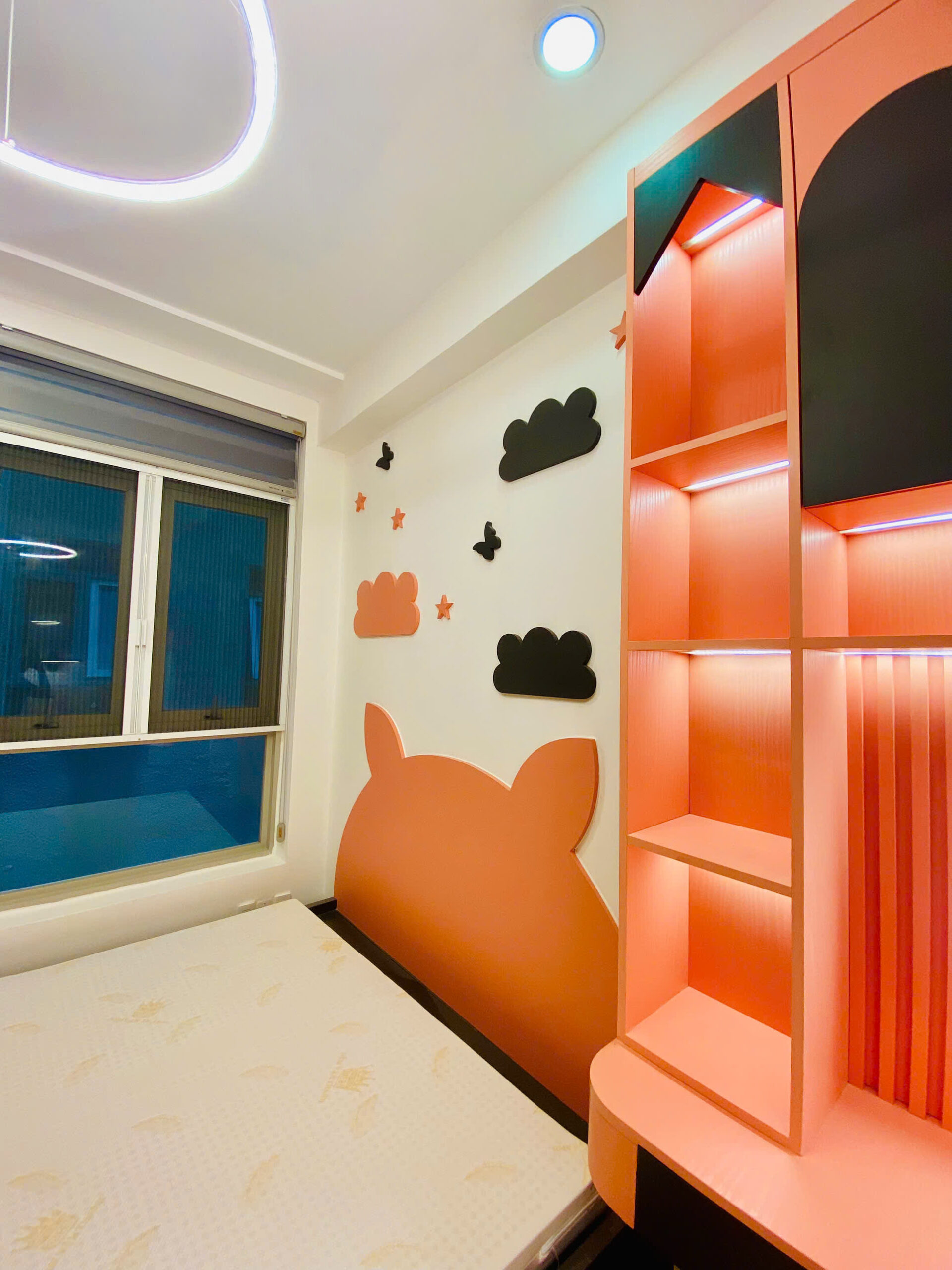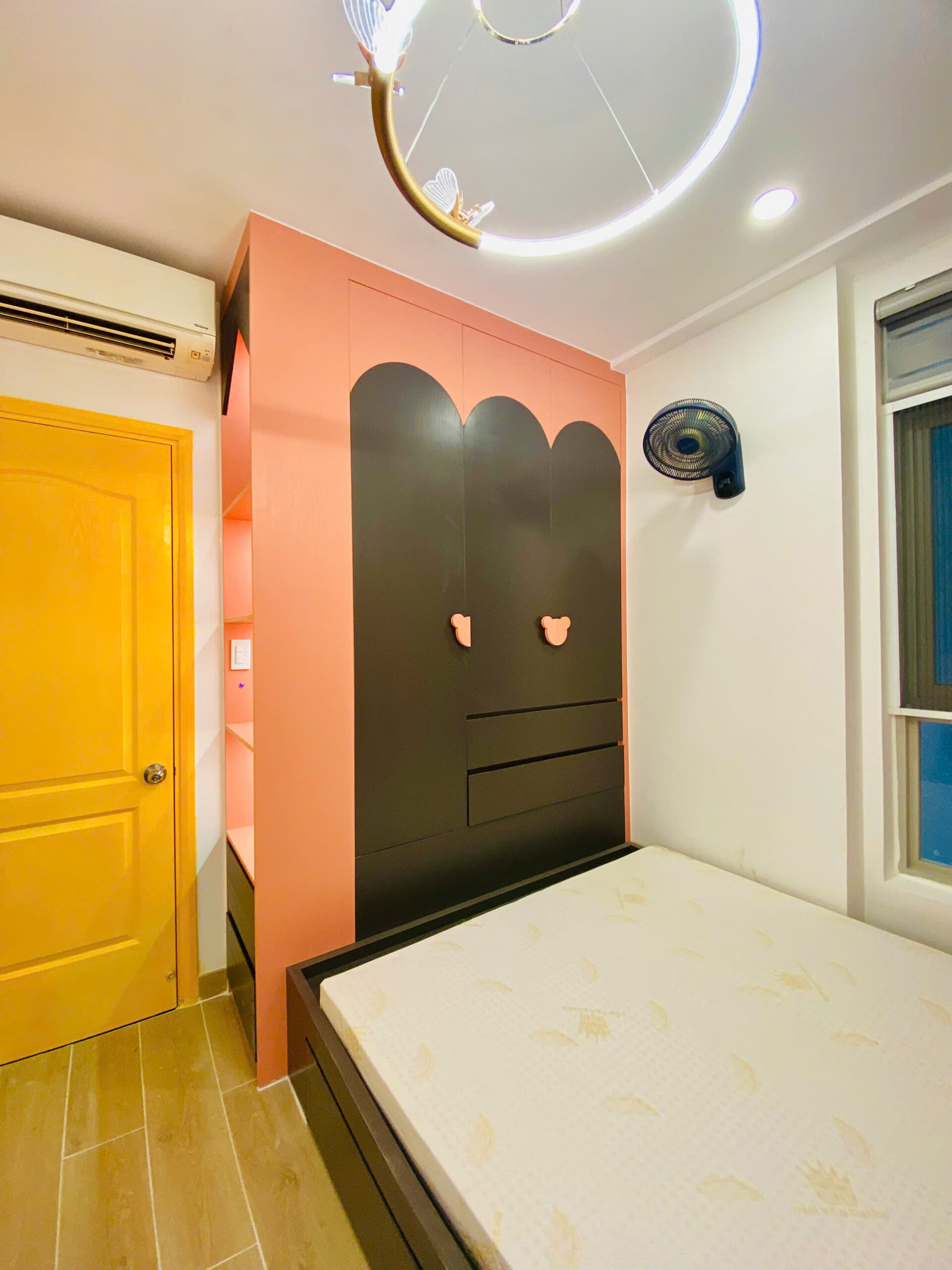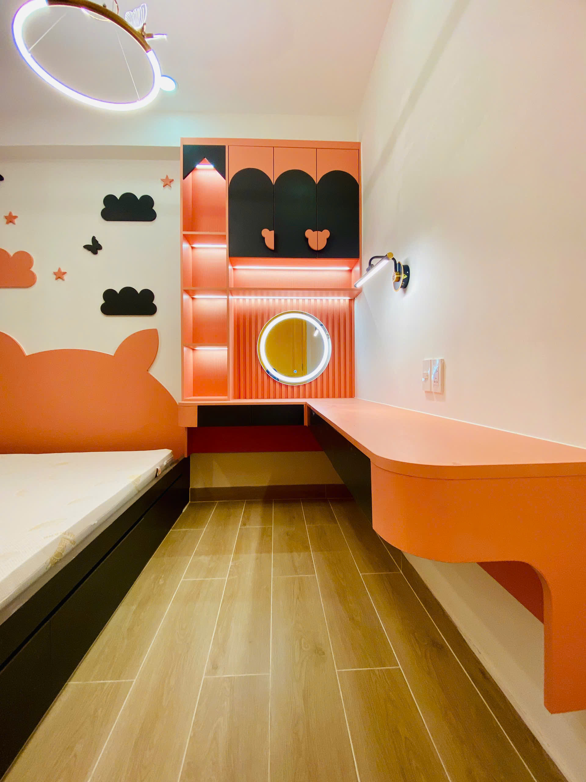 Phòng ngủ thứ hai là thế giới riêng ngập tràn màu hồng dành cho cô con gái nhỏ. Tone hồng pastel chủ đạo mang lại cảm giác dịu dàng, dễ thương nhưng không quá rực rỡ. Không gian được nhấn nhá bằng các chi tiết trang trí ngộ nghĩnh, như tranh treo tường, đèn ngủ hình thú và đồ decor nhỏ xinh. Nội thất trong phòng được bo tròn góc, thiết kế thấp vừa tầm sử dụng của bé – đảm bảo an toàn, thẩm mỹ và phát triển sự tự lập cho trẻ.