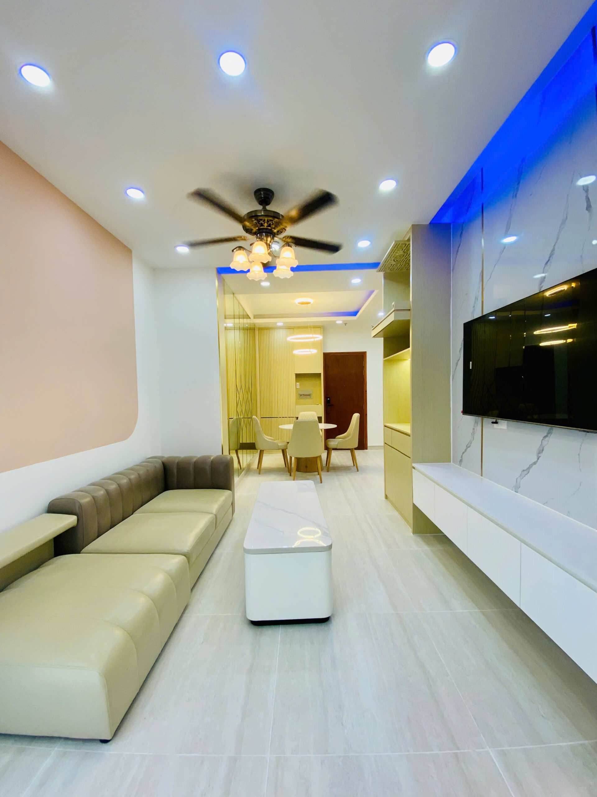 Bộ sofa tone trung tính được chọn lựa vừa vặn với diện tích, kết hợp cùng kệ tivi thiết kế đơn giản mà hiện đại, mang lại cảm giác gọn gàng, tinh tế. kết hợp tủ nhiều ngăn kết hợp lam sóng trang trí và vách tủ giày được thiết kế thông minh, vừa đảm bảo công năng lưu trữ, vừa tạo điểm nhấn nhẹ nhàng cho không gian sinh hoạt chung.