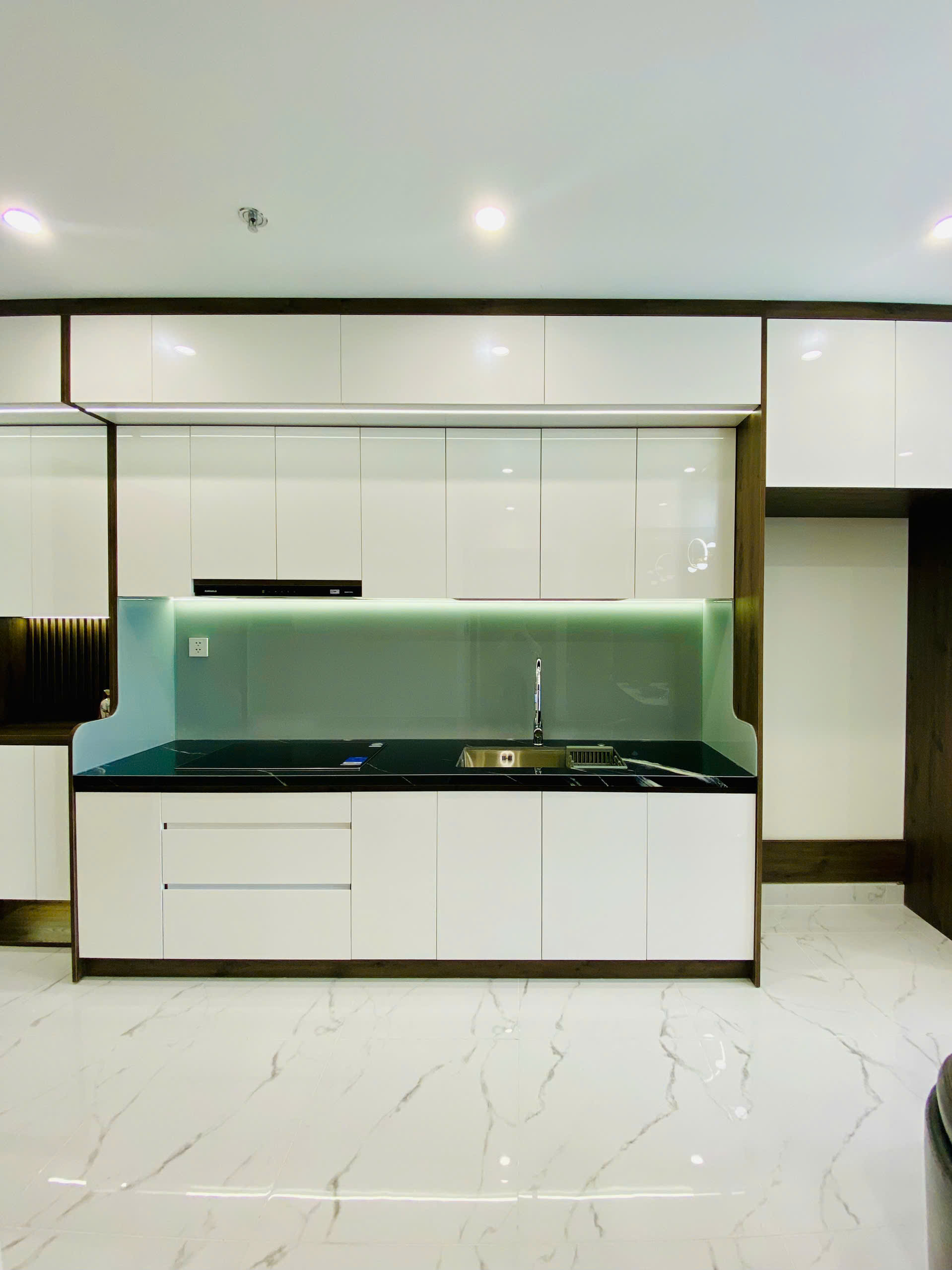 Căn hộ được thiết kế và thi công trọn gói bởi CÔNG TY TNHH THIẾT KẾ KIẾN TRÚC XÂY DỰNG ĐỒNG HƯNG, sử dụng 100% gỗ công nghiệp An Cường, cánh tủ phủ Acrylic bóng gương cao cấp, kết hợp nhiều vật liệu chất lượng như đá nhân tạo, da bọc Elise, tay nắm mạ vàng, đèn pha lê… Tất cả hòa quyện trong một tổng thể tối giản nhưng đầy cá tính.
