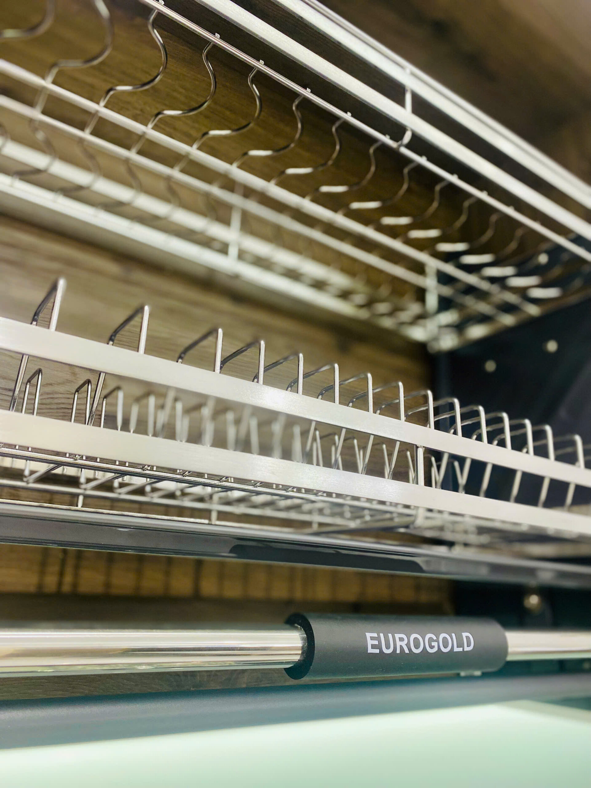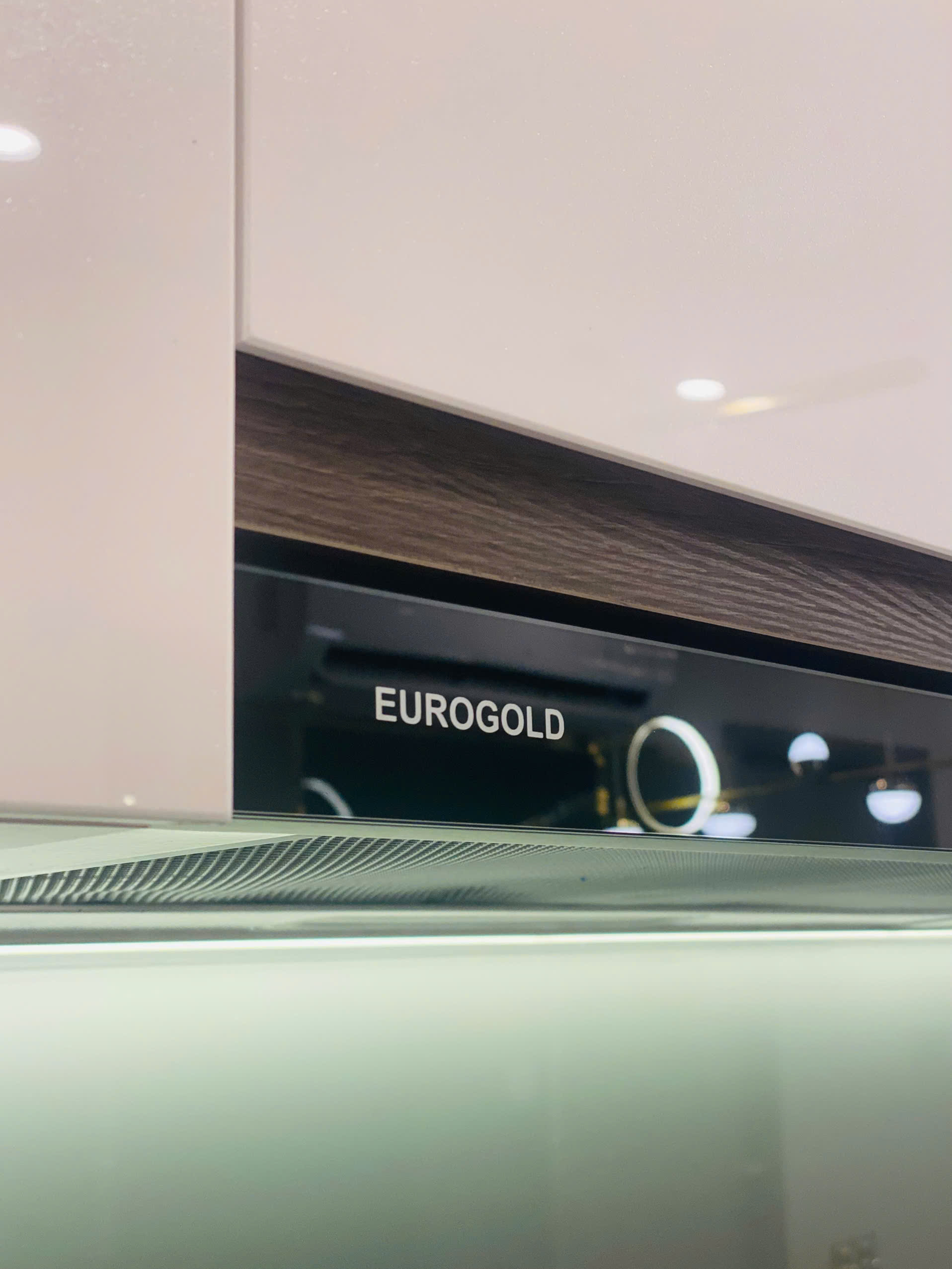 Gọn gàng, tiện nghi và hiện đại với hệ tủ bếp gỗ An Cường phủ Acrylic, tường bếp ốp Acrylic bóng gương, đèn LED âm sang trọng cùng thiết bị bếp Eurogold cao cấp.