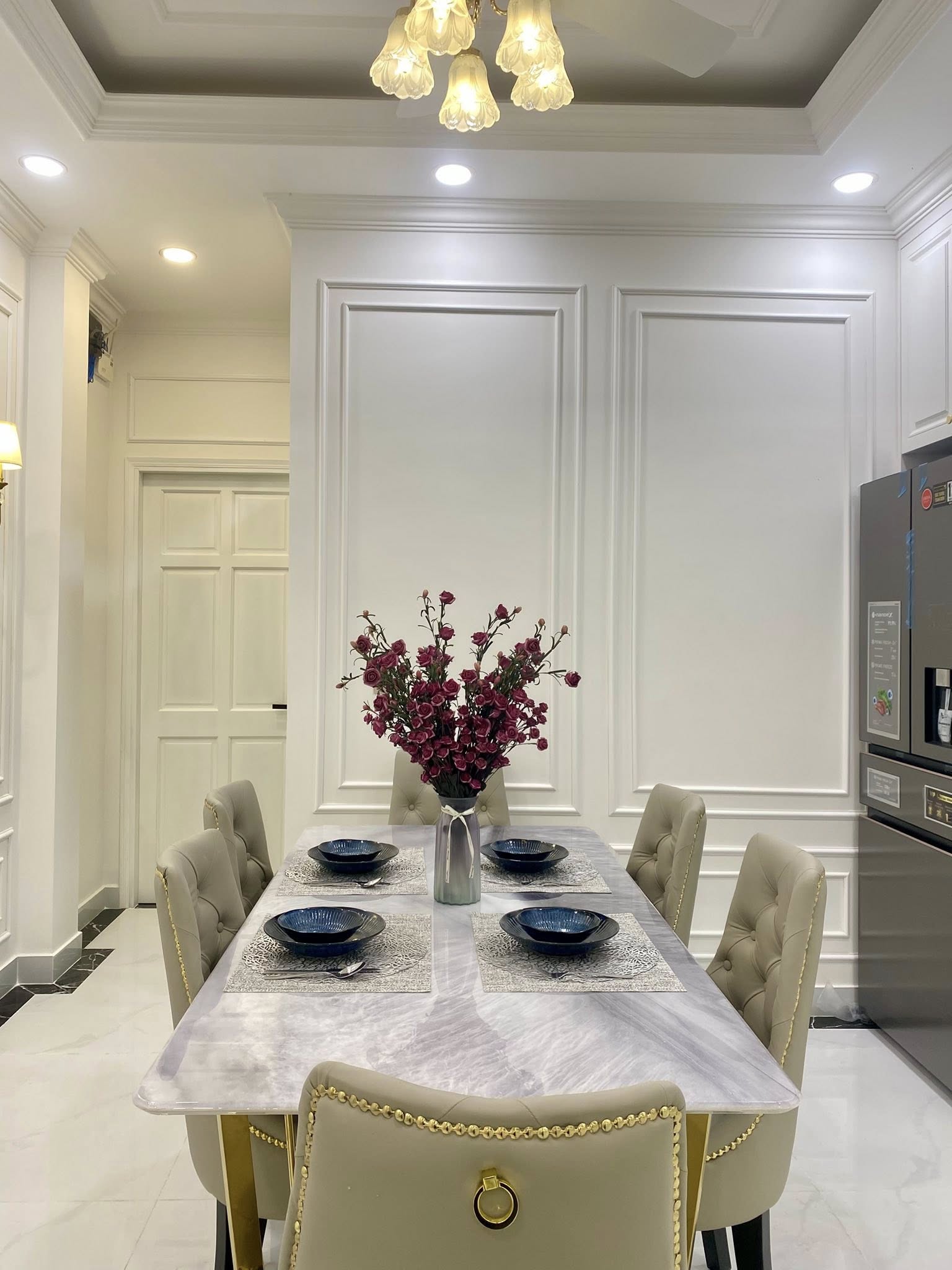 • Bộ bàn ăn cắt CNC tinh xảo, kết hợp chân inox mạ vàng