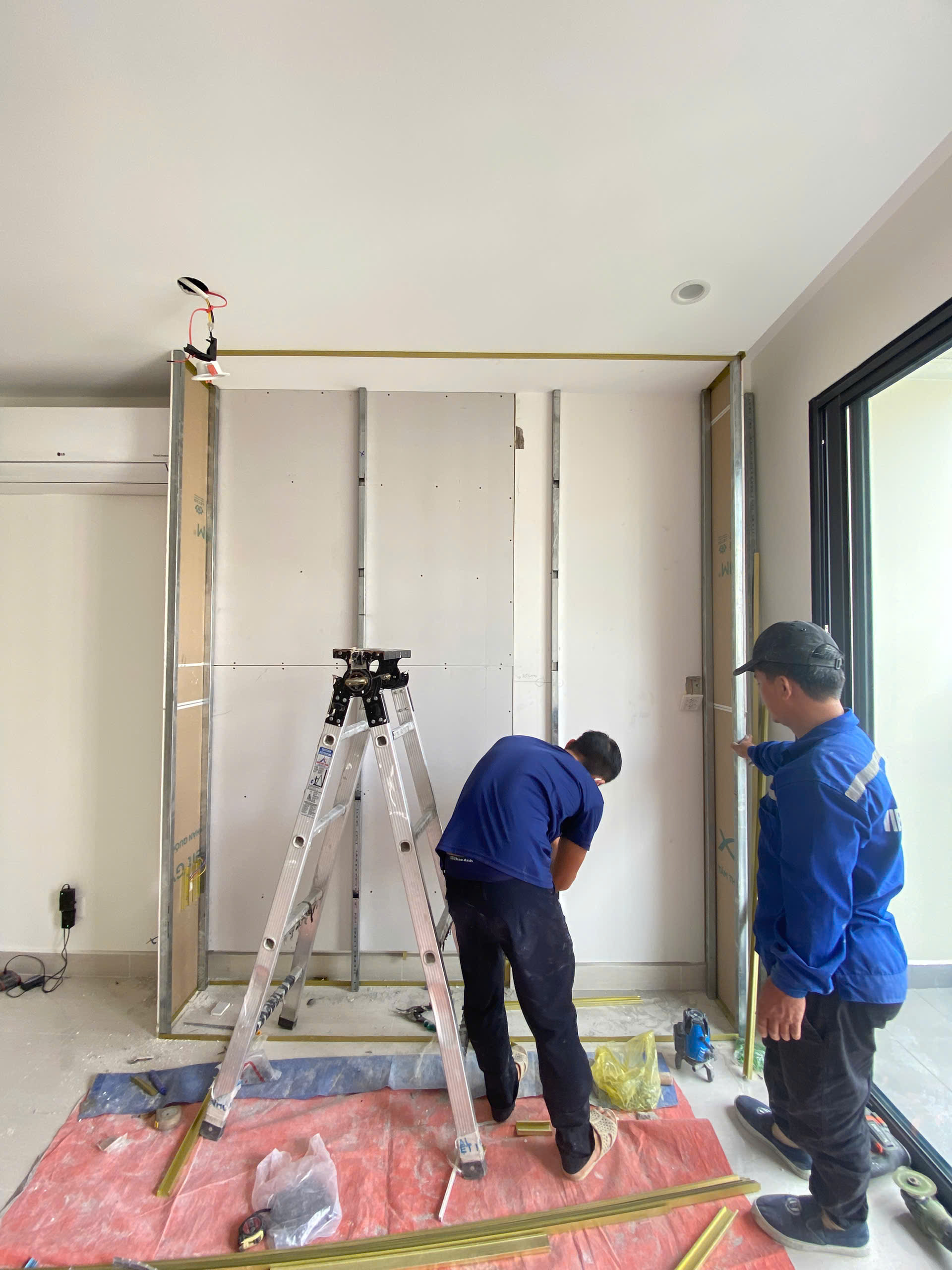 Trước khi thi công, đội ngũ tiến hành đo đạc thực tế, kiểm tra mặt bằng và xác định vị trí vách thạch cao theo bản vẽ thiết kế. Các vị trí phòng ngủ cộng, khu sinh hoạt chung và khu chức năng được đánh dấu chính xác để đảm bảo đúng kích thước và tỷ lệ không gian.