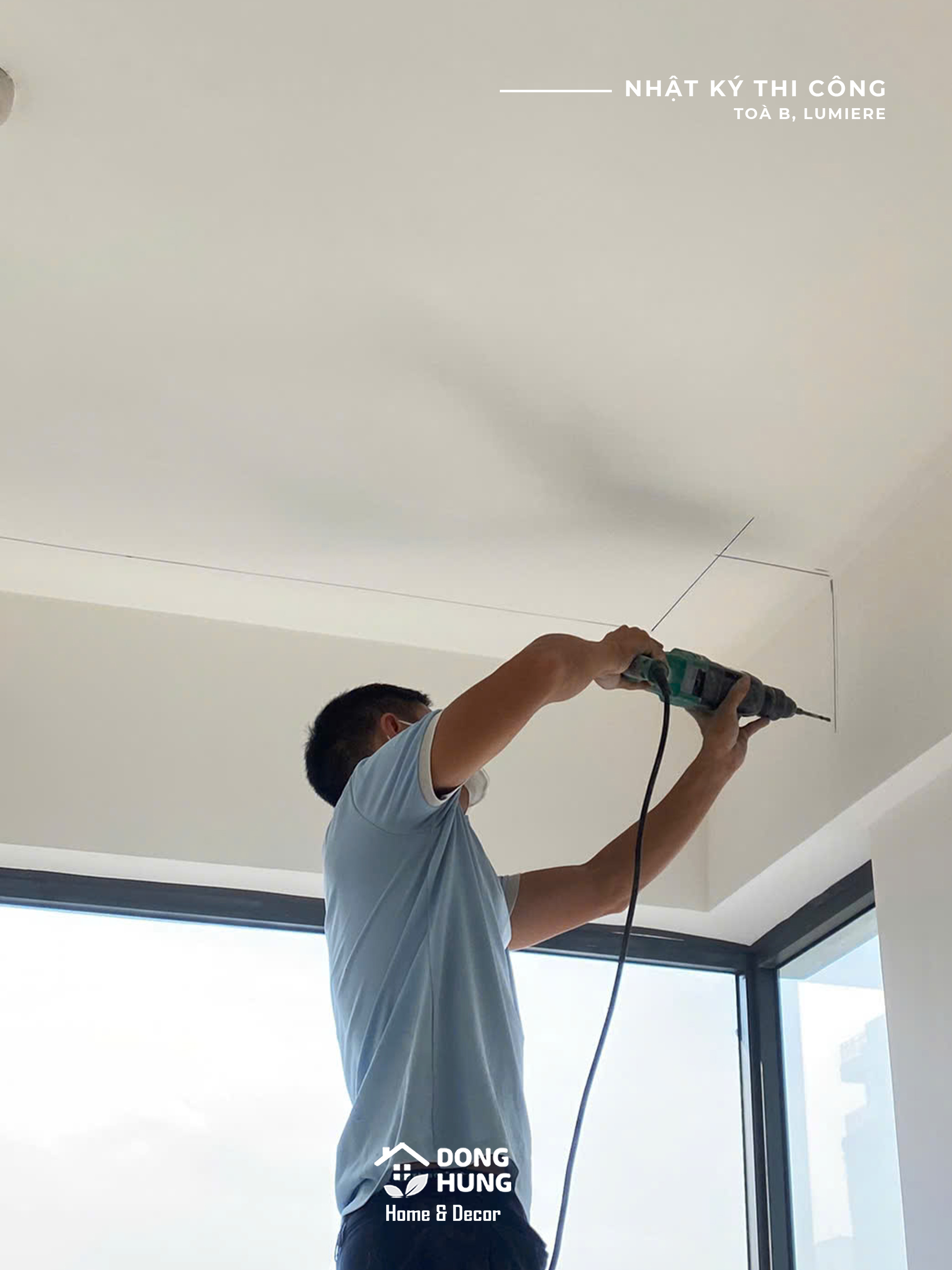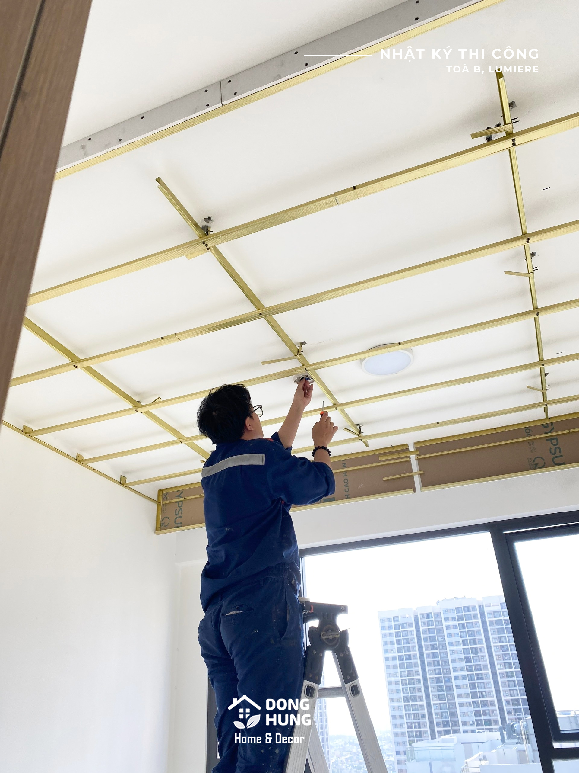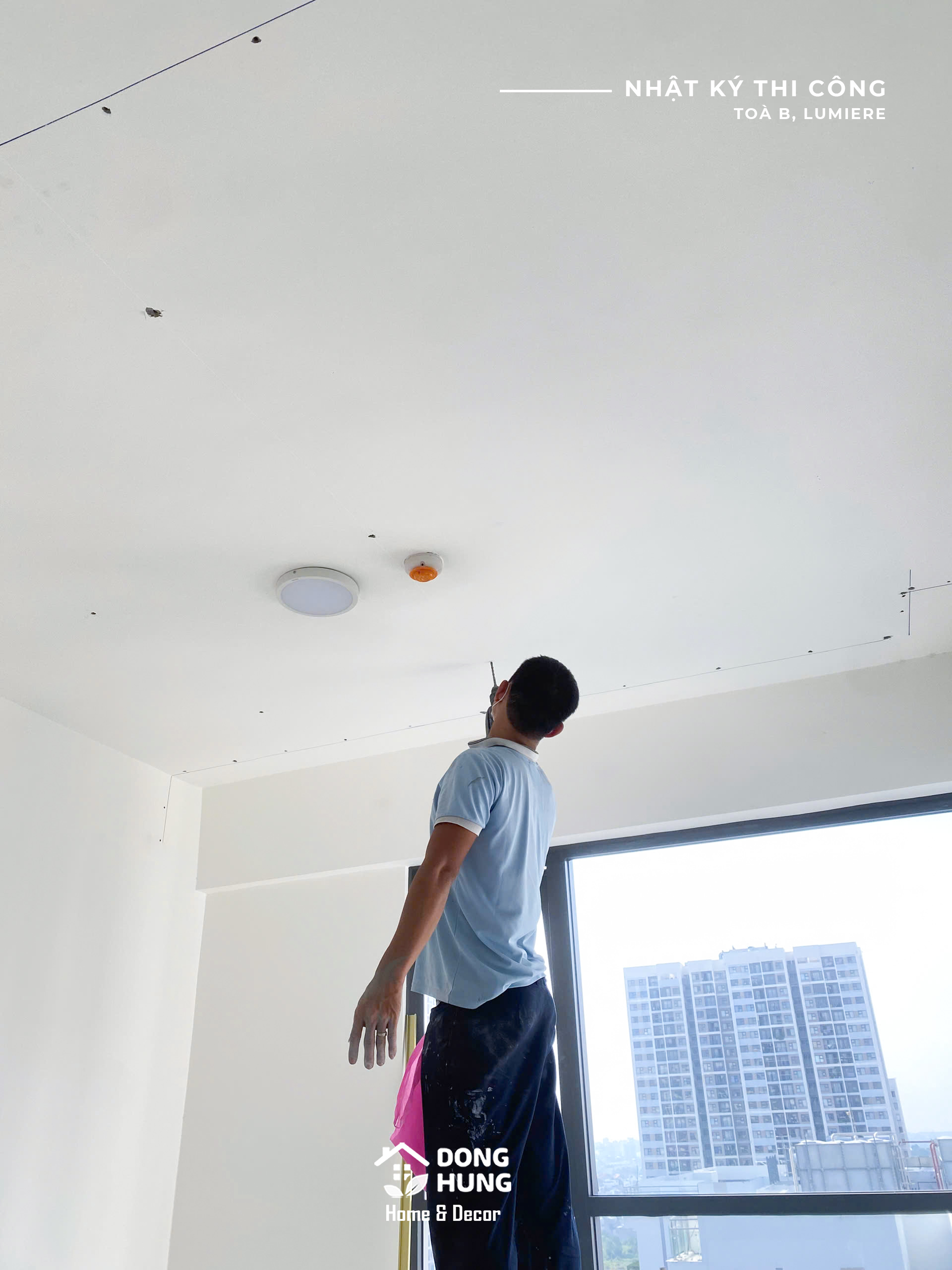 Căn hộ thuộc loại hình 2 phòng ngủ, được tiếp cận từ hiện trạng bàn giao chủ đầu tư. Ngay từ giai đoạn đầu, Đồng Hưng tập trung xử lý phần nền như trần thạch cao, bố trí ánh sáng và định hình không gian tổng thể, tạo tiền đề cho các hạng mục hoàn thiện nội thất phía sau.