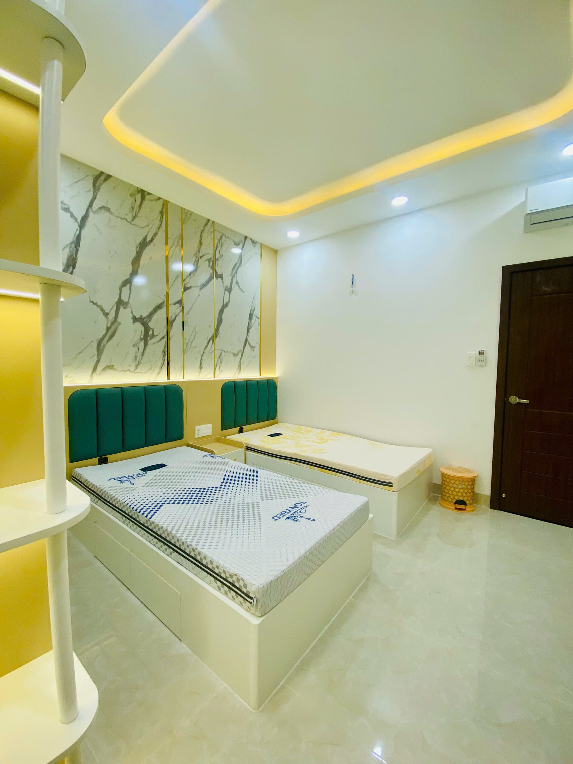 Một căn phòng ngủ đôi với giường đơn riêng biệt và gam màu xanh – vàng trẻ trung là lựa chọn tuyệt vời cho các gia đình có hai bé nhỏ. Thiết kế này không chỉ giúp tối ưu diện tích và công năng, mà còn hỗ trợ sự phát triển tinh thần, cảm xúc và thói quen tốt cho trẻ từ sớm.