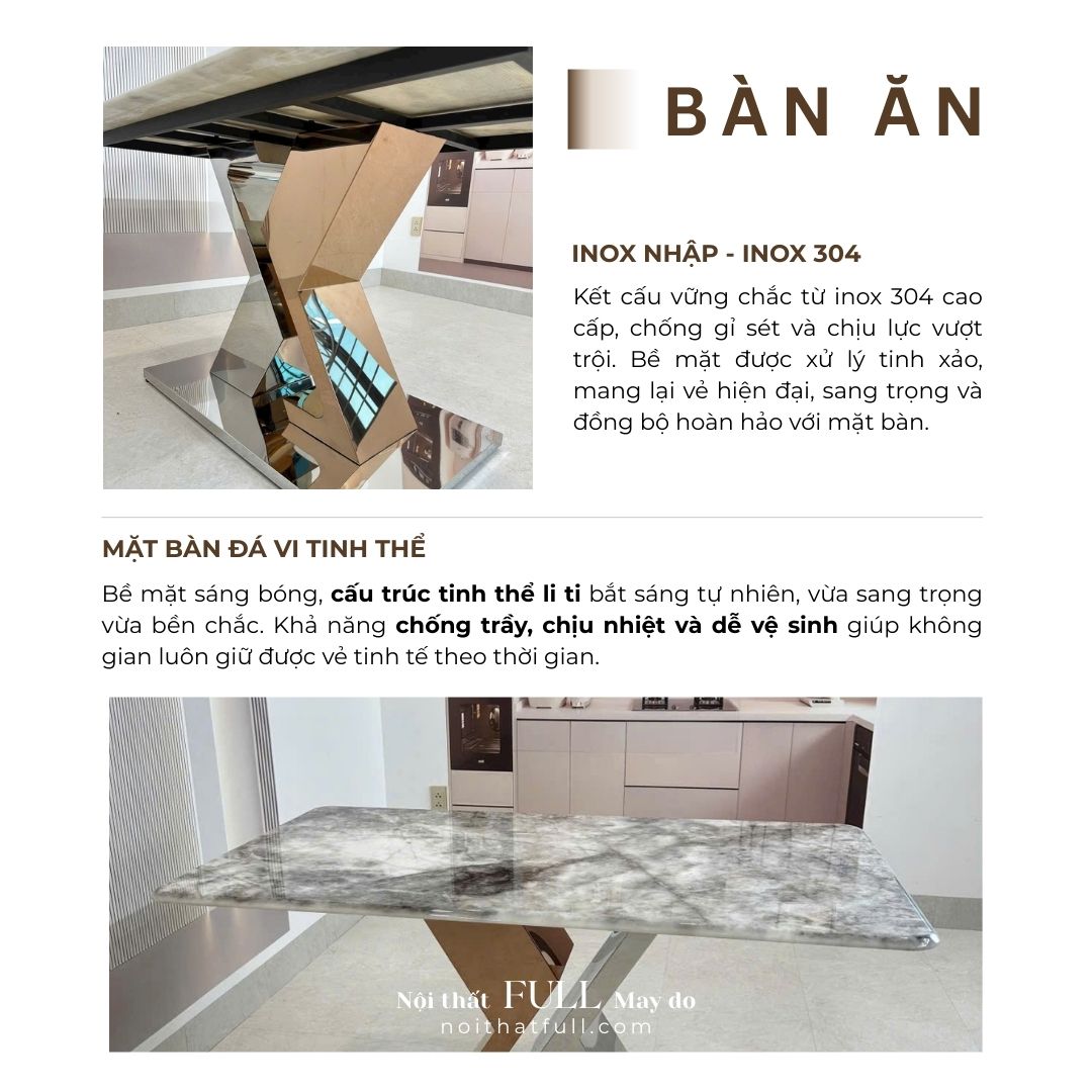 Bàn ăn inox 304 mặt đá vi tinh thể – Sang trọng và bền bỉ cho phòng ăn hiện đại
