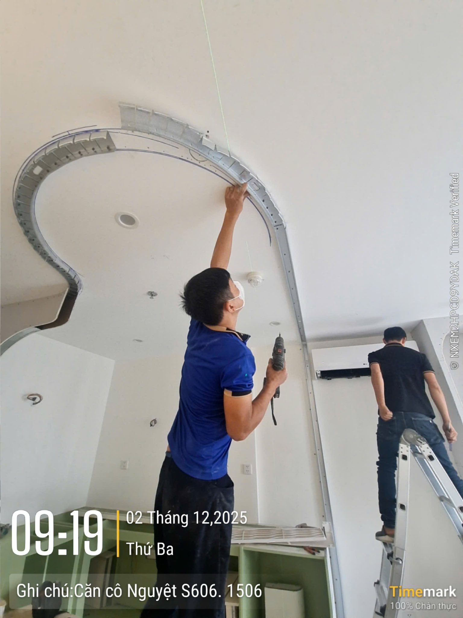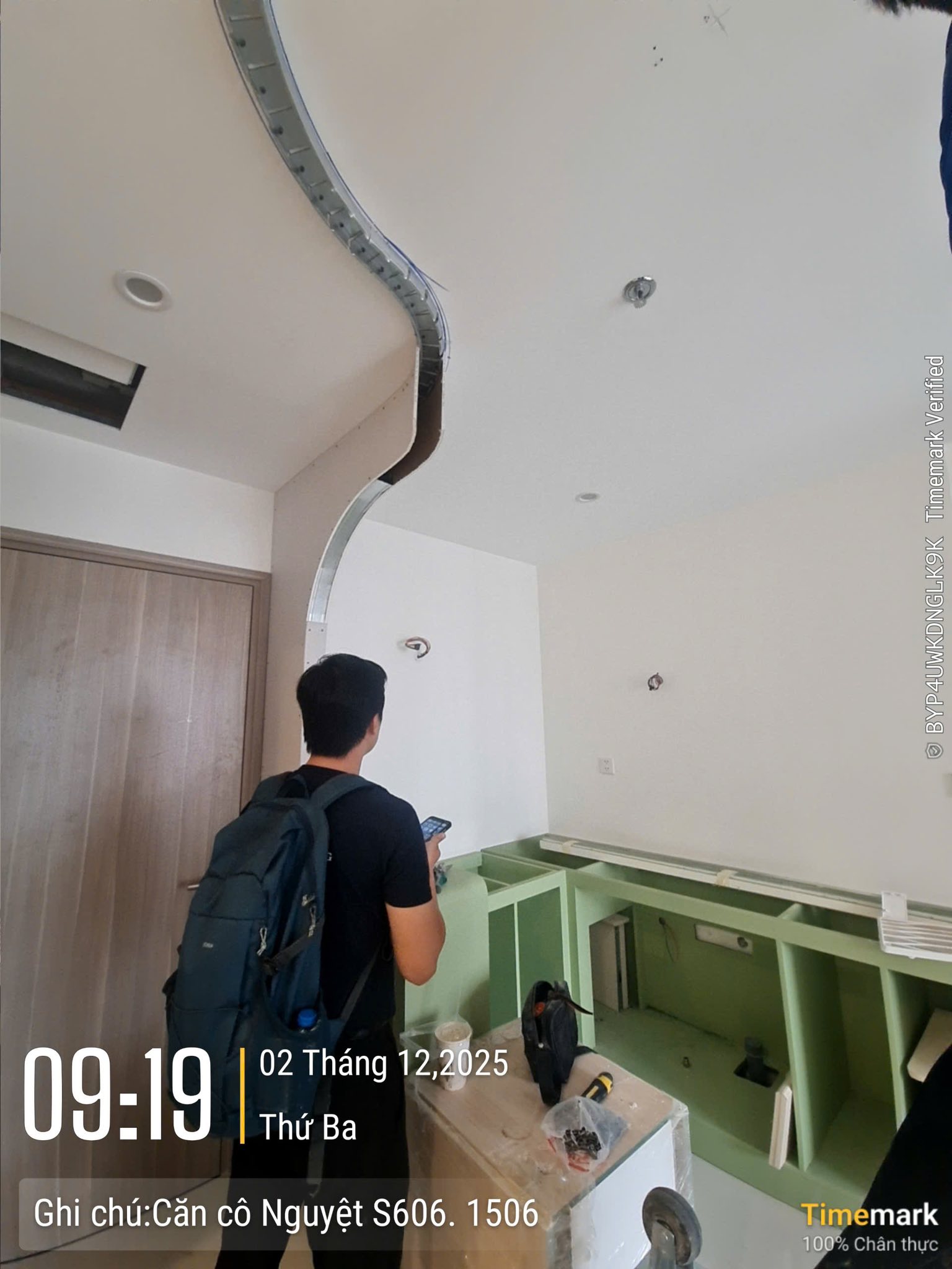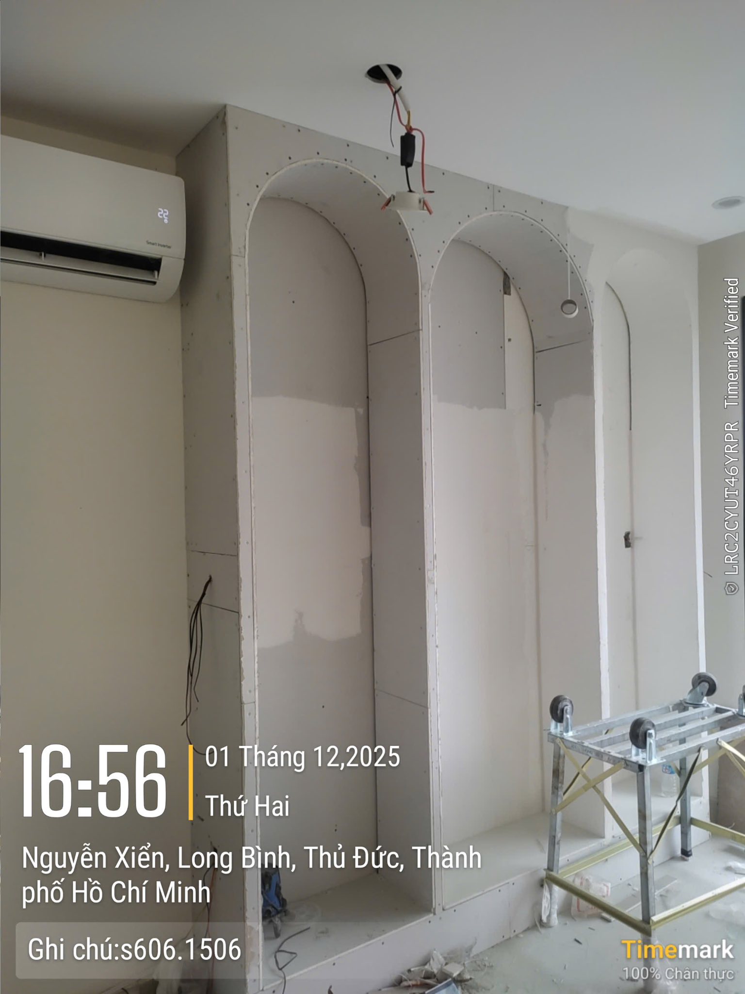 Giai đoạn hiện tại bao gồm thi công trần – vách thạch cao, xử lý mảng tường và lắp đặt nội thất gỗ tự nhiên theo đúng tiêu chuẩn thiết kế.