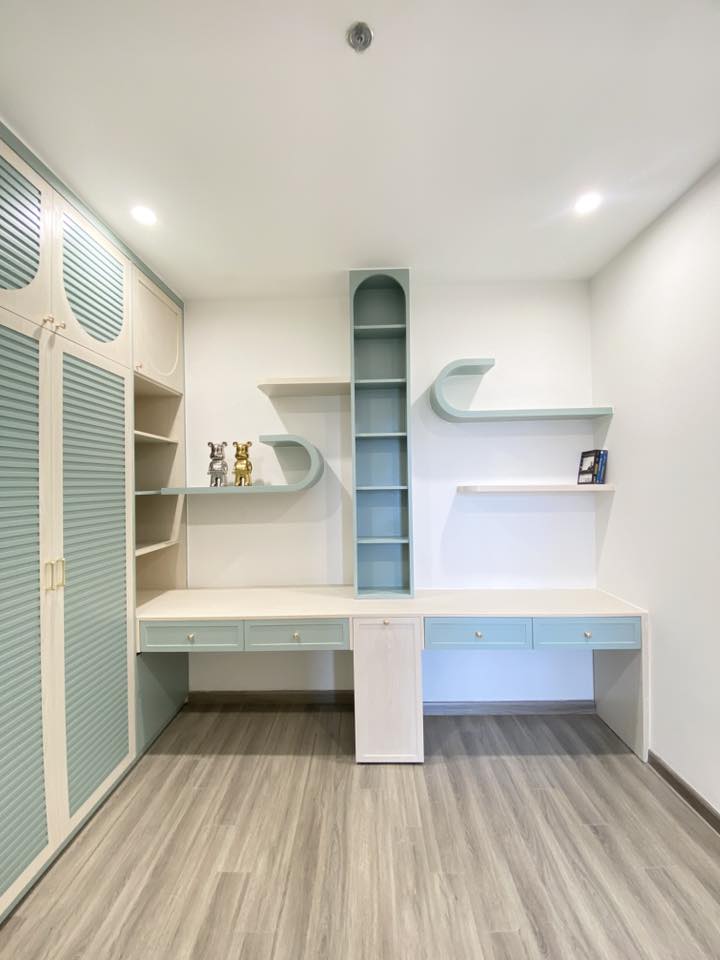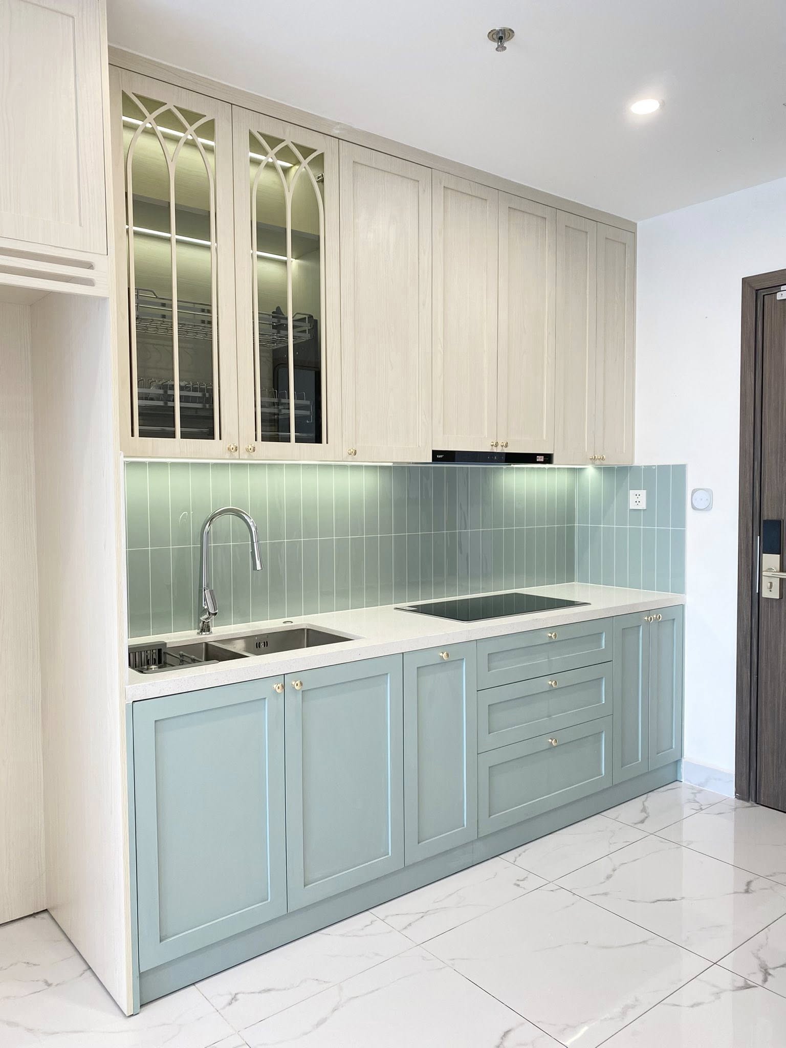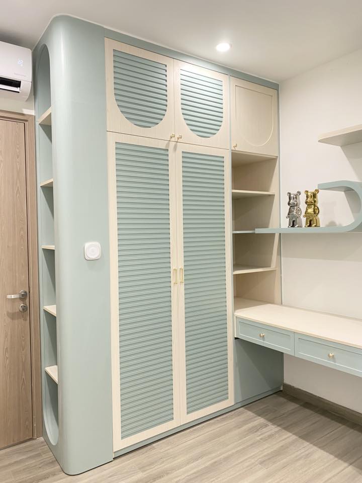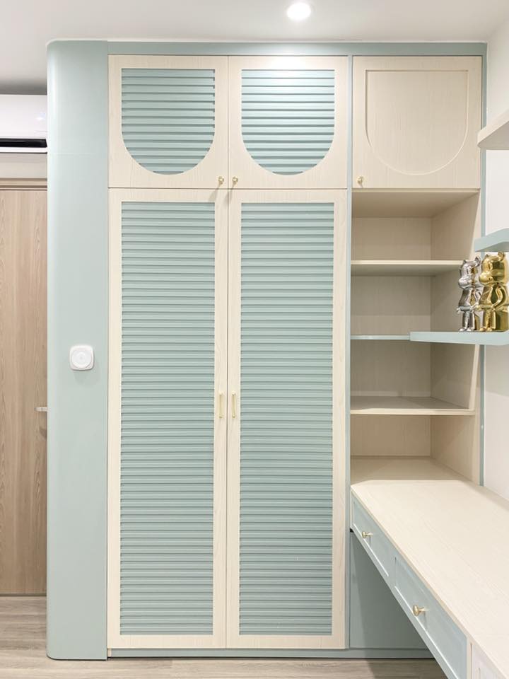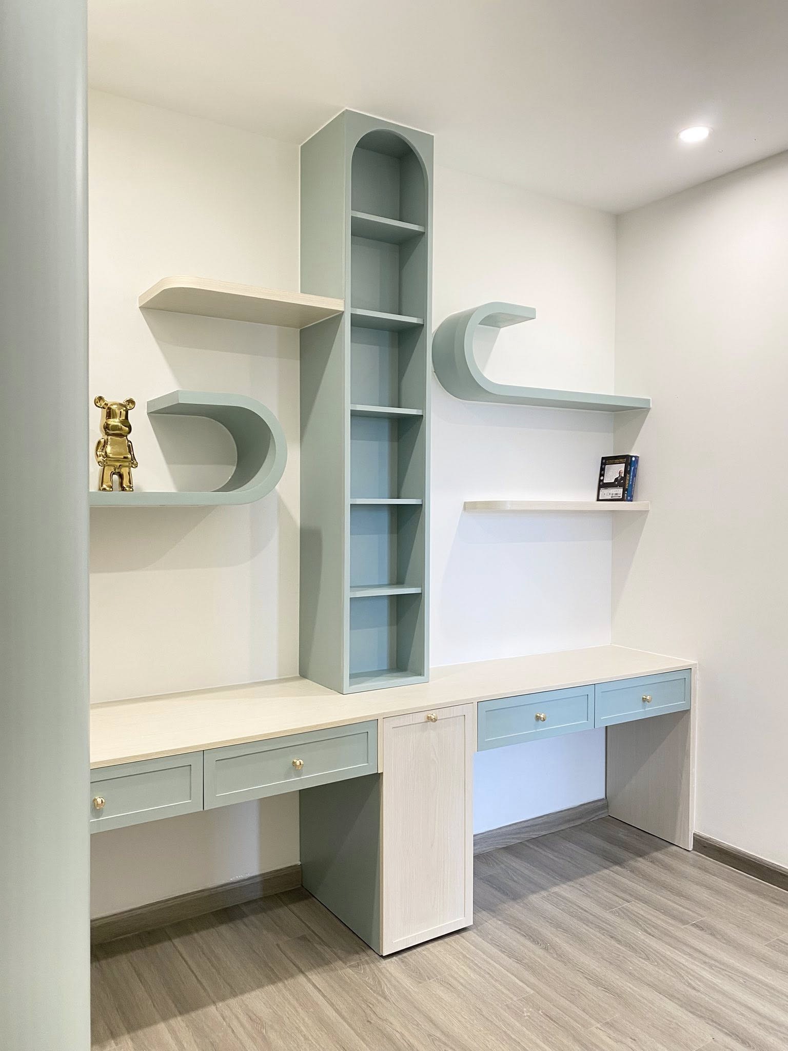 Toàn bộ nội thất sử dụng gỗ melamine Yeongsan với bề mặt sắc nét, dễ vệ sinh và bền bỉ theo thời gian. Tone gỗ sáng giúp mở rộng thị giác, mang lại cảm giác rộng rãi và ấm áp, trong khi sắc xanh đóng vai trò điểm nhấn, tạo chiều sâu thẩm mỹ và sự tươi mới cho không gian sống.