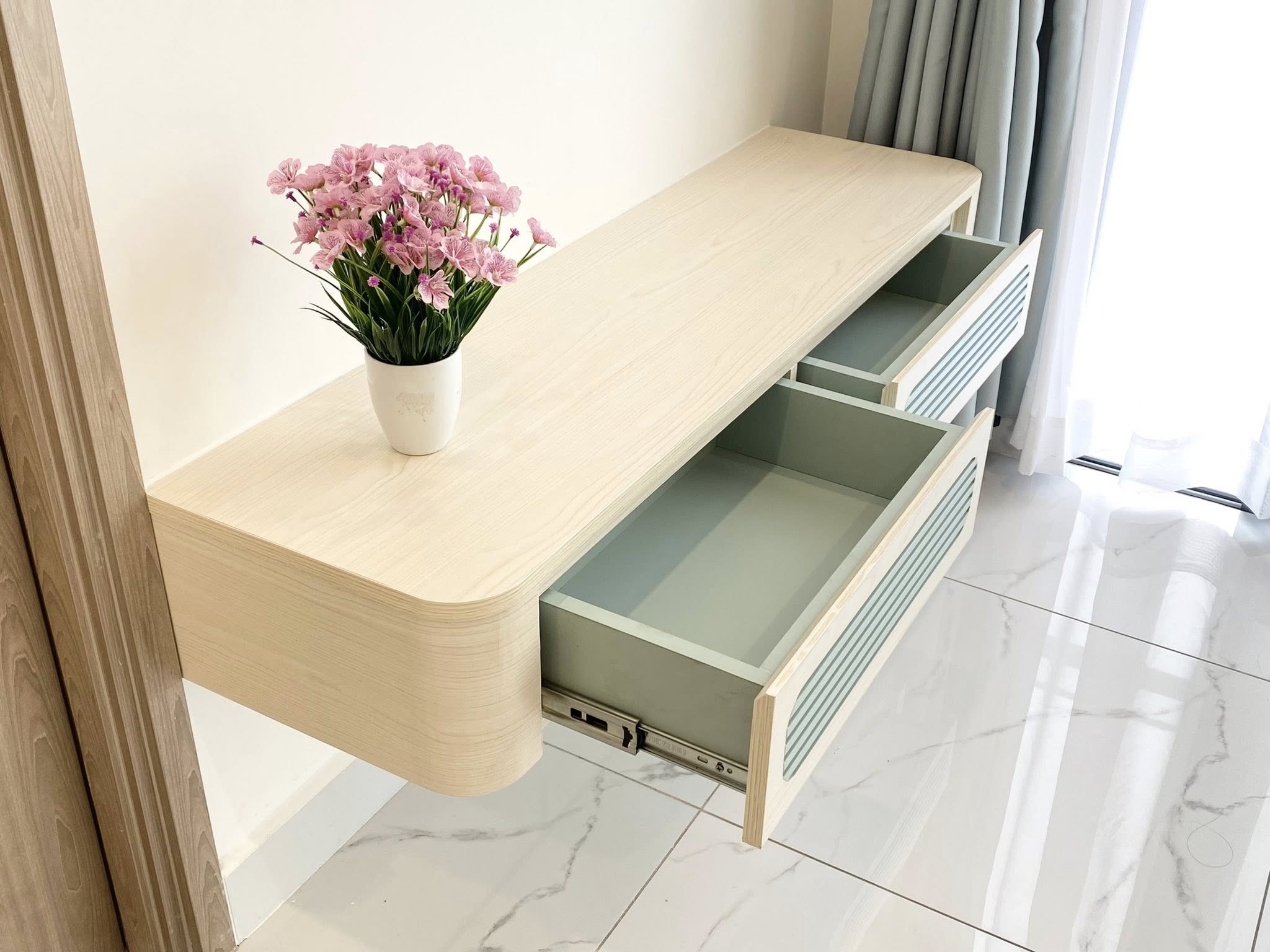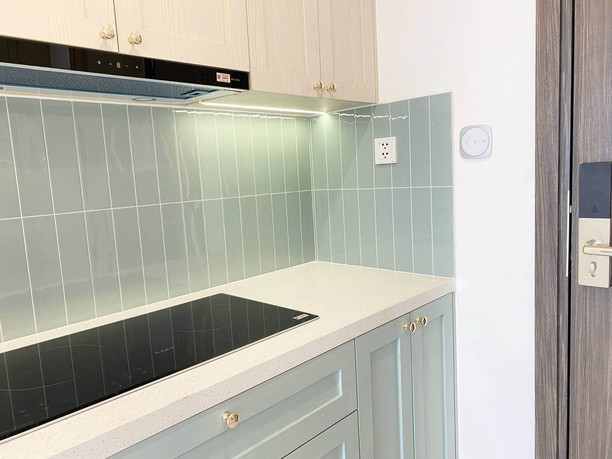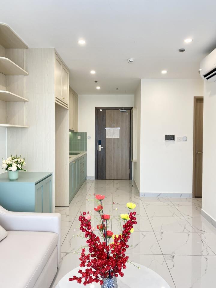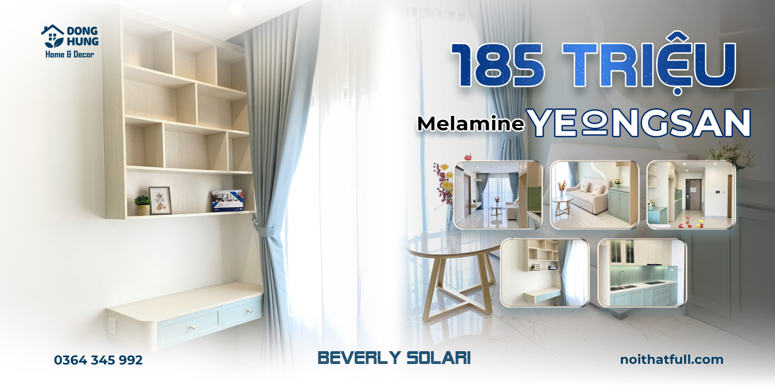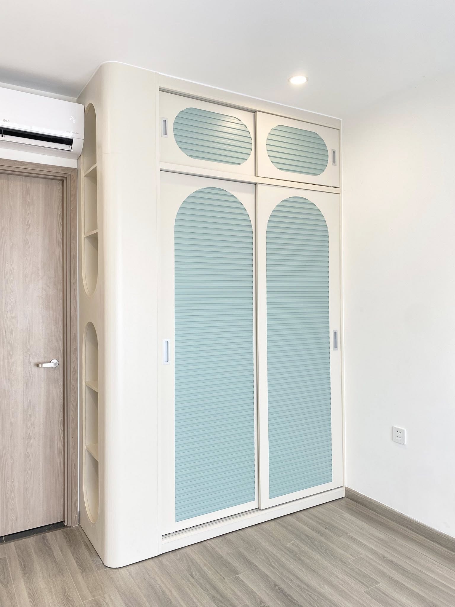 Toàn bộ nội thất sử dụng gỗ melamine Yeongsan với bề mặt sắc nét, dễ vệ sinh và bền bỉ theo thời gian. Tone gỗ sáng giúp mở rộng thị giác, mang lại cảm giác rộng rãi và ấm áp, trong khi sắc xanh đóng vai trò điểm nhấn, tạo chiều sâu thẩm mỹ và sự tươi mới cho không gian sống.