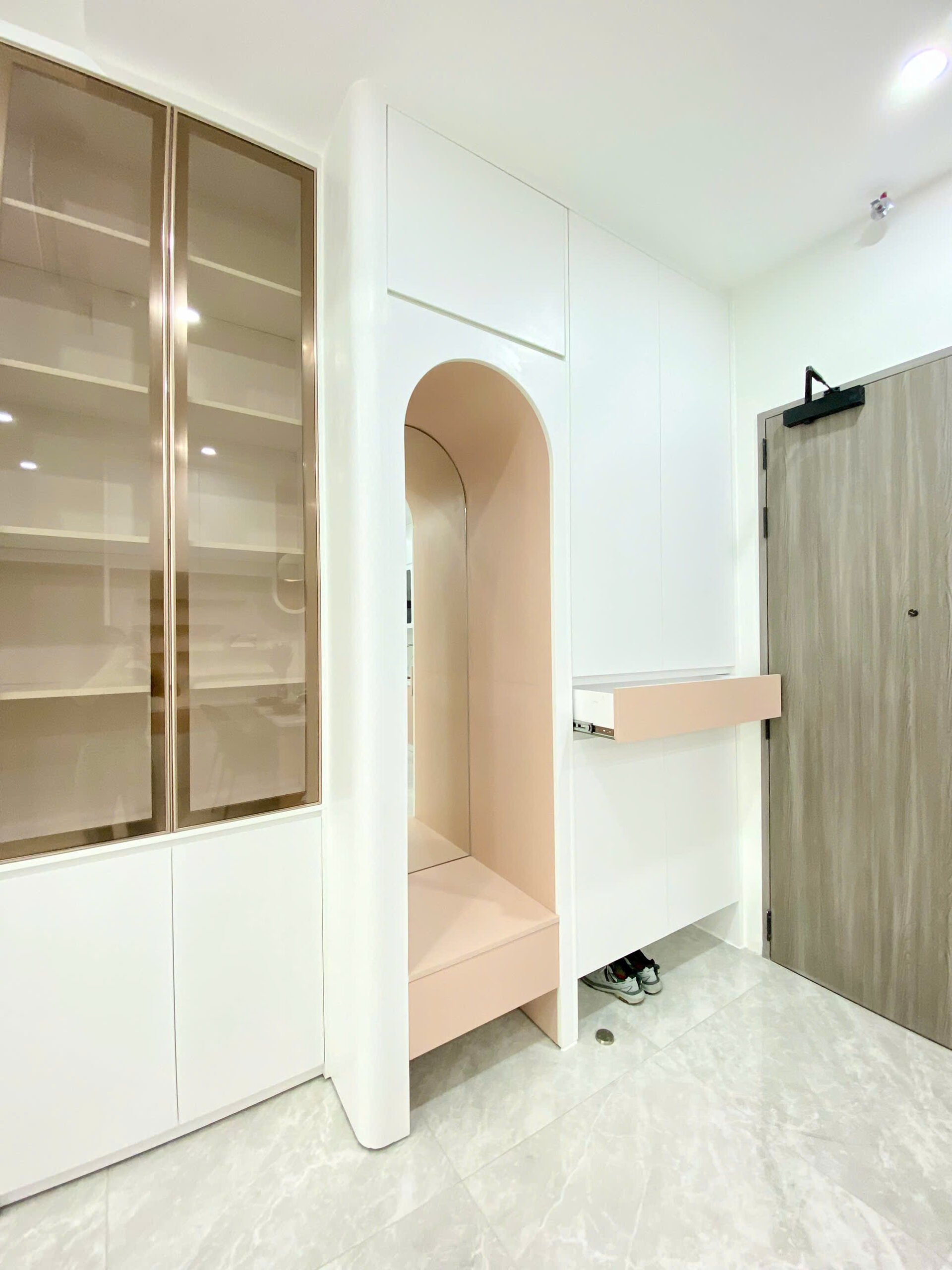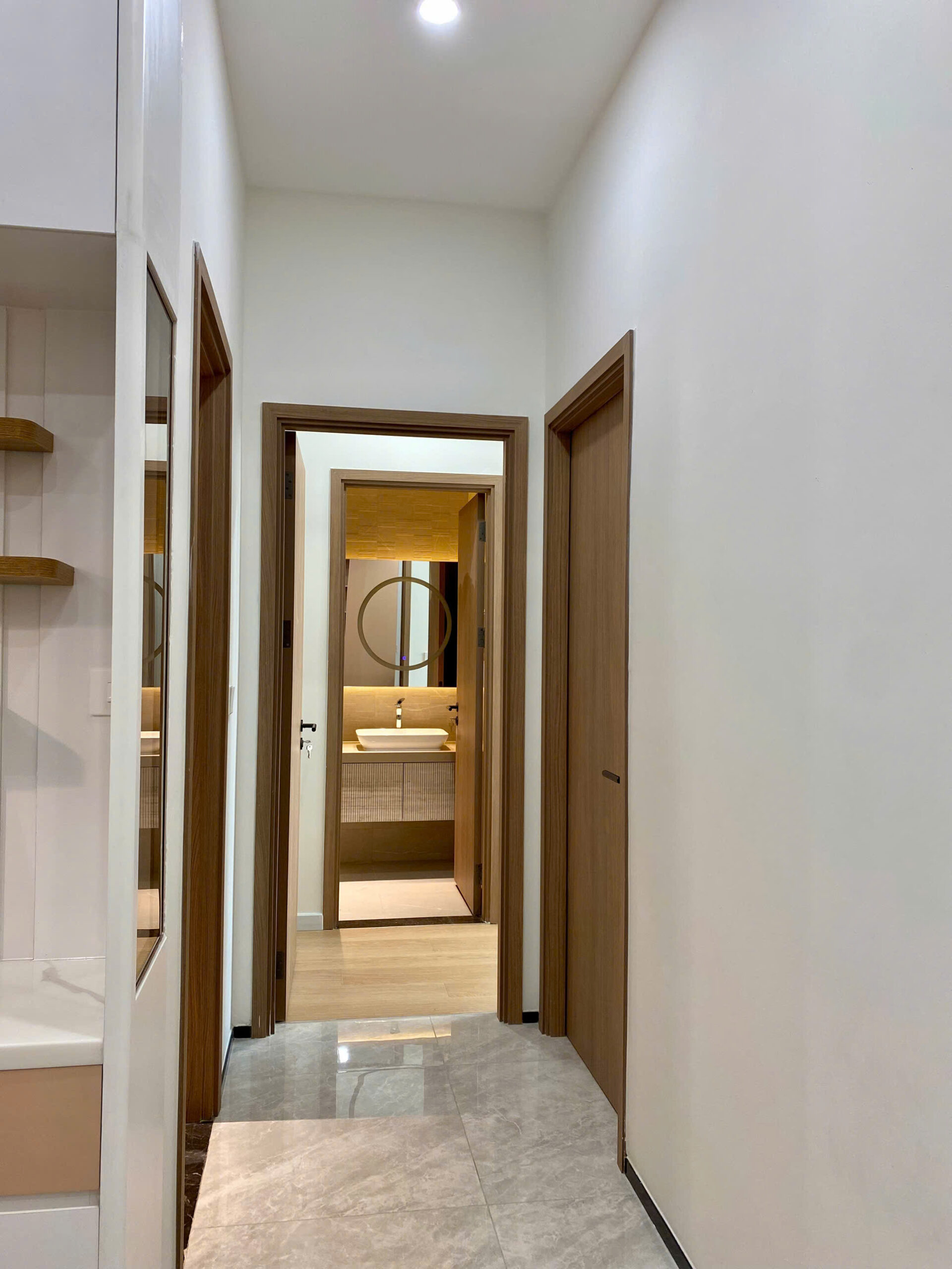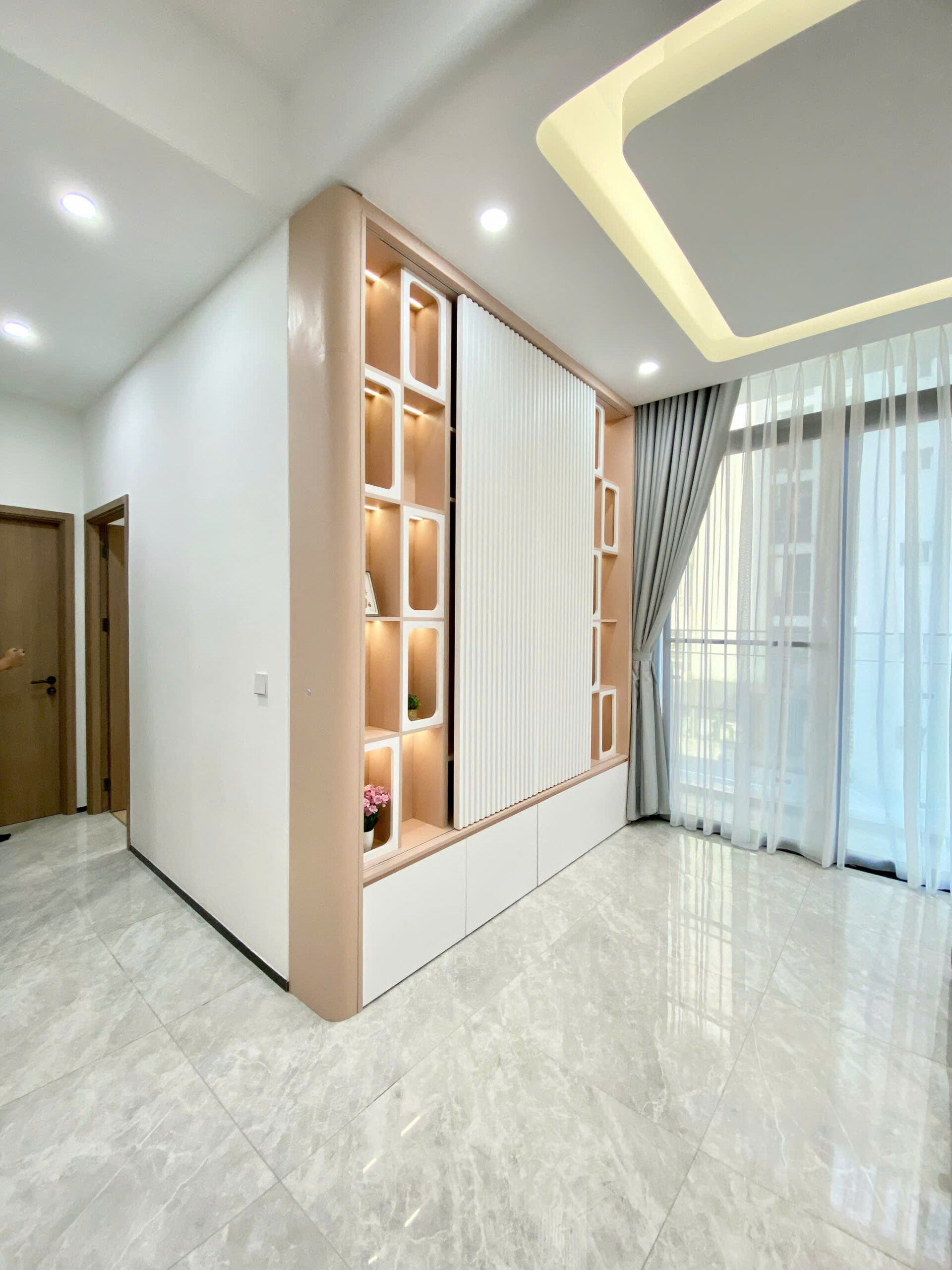 Bước qua cửa là ánh sáng mở ra toàn bộ không gian. Các bề mặt được hoàn thiện gọn gàng, chi tiết lắp ghép chính xác, tạo nên một tổng thể sẵn sàng cho cuộc sống bắt đầu ngay lập tức. Đây là dự án thiết kế và thi công nội thất trọn gói căn hộ The Aurora – Phú Mỹ Hưng dành cho chủ đầu tư Chị Tuyền.