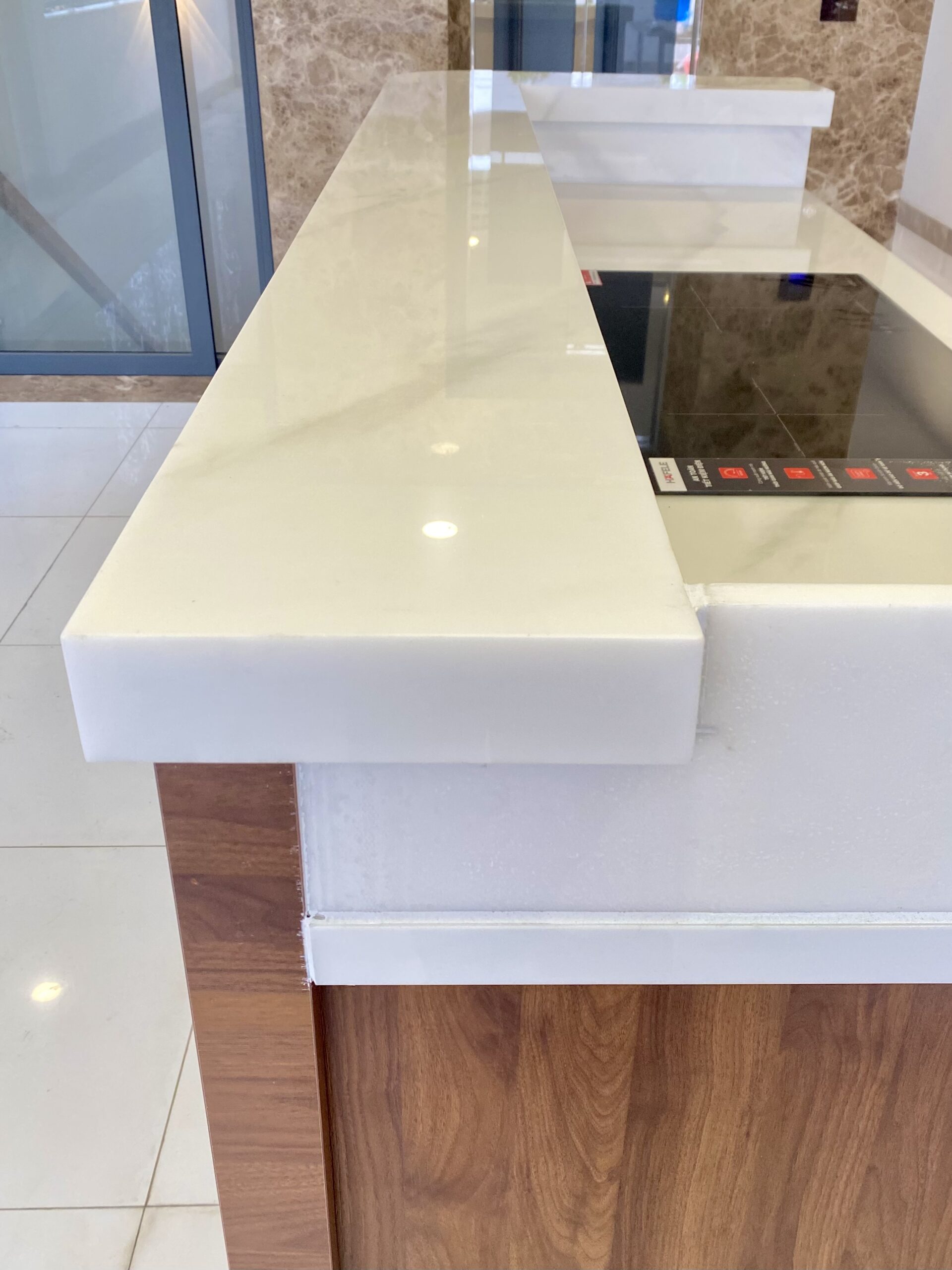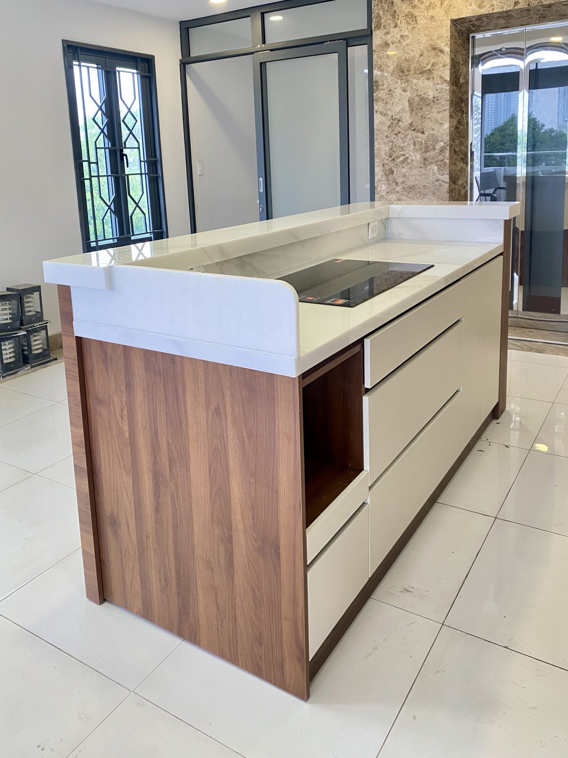 Các khu vực như mặt bàn, bếp và một số chi tiết trang trí được sử dụng đá Lamar và đá trắng sứ dày 18mm.