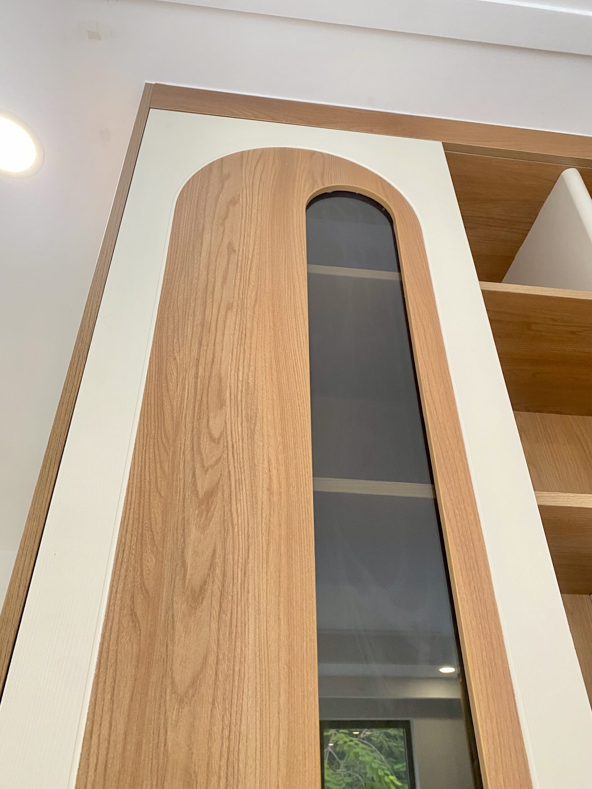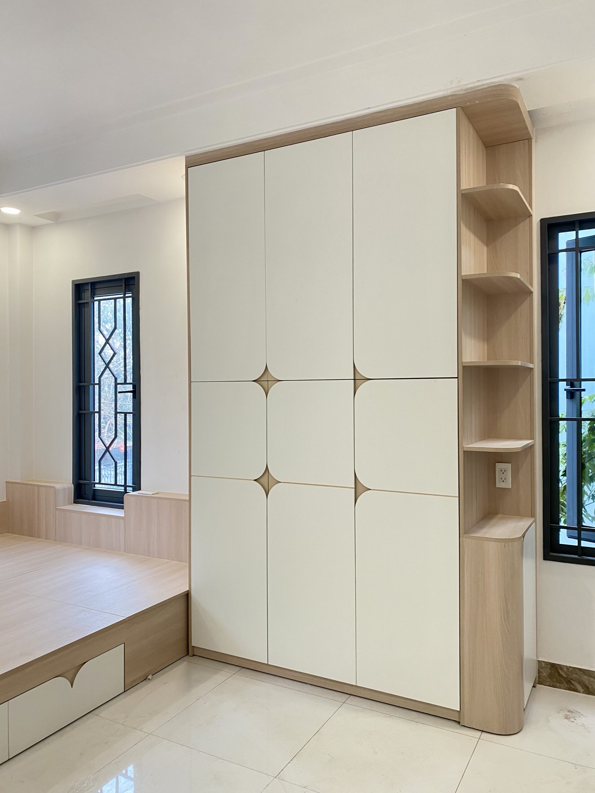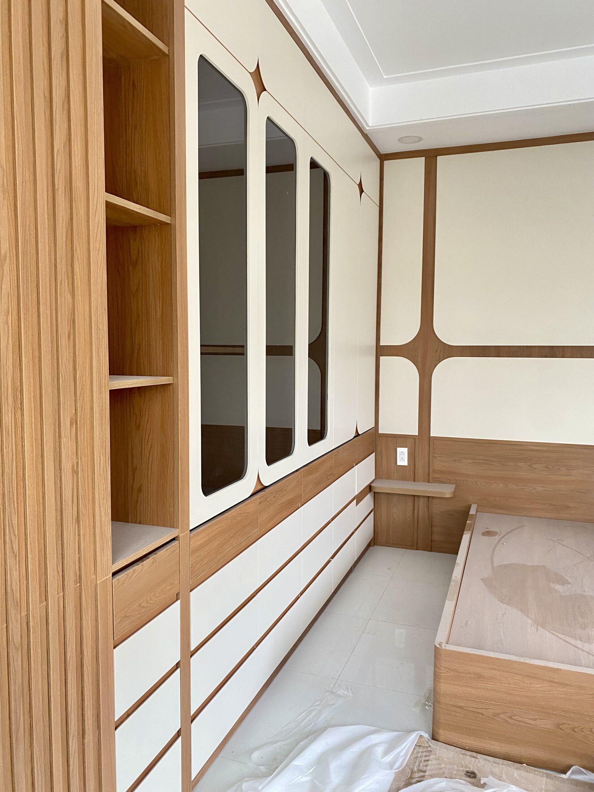 Toàn bộ hệ tủ và nội thất trong nhà được sản xuất từ gỗ Á Châu đạt tiêu chuẩn E0, giúp hạn chế phát thải formaldehyde và gần như không có mùi keo.