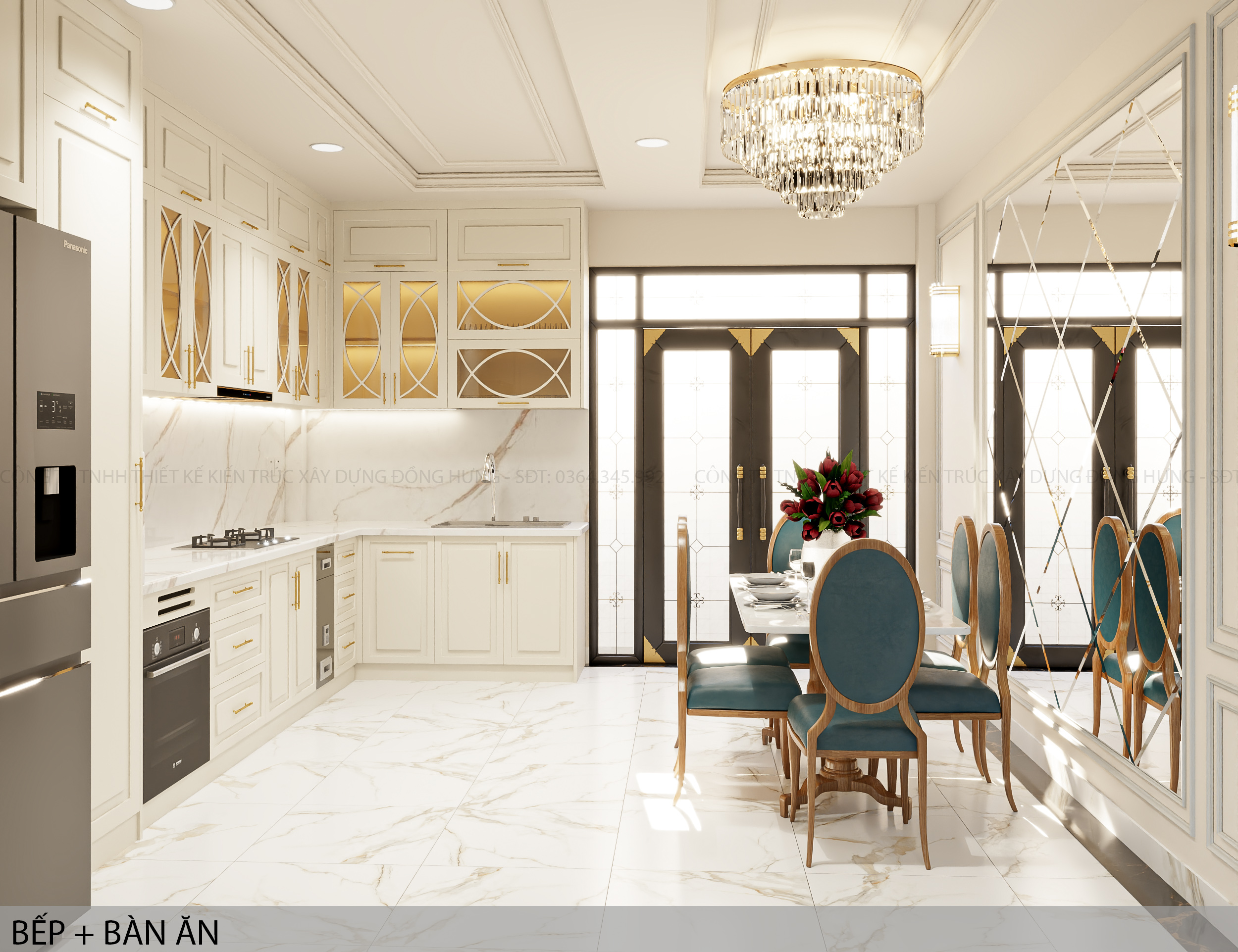Tone trắng chủ đạo hòa cùng ánh đèn vàng ấm, mang lại cảm giác vừa quý phái vừa gần gũi, chuẩn tinh thần Tân cổ điển hiện đại.