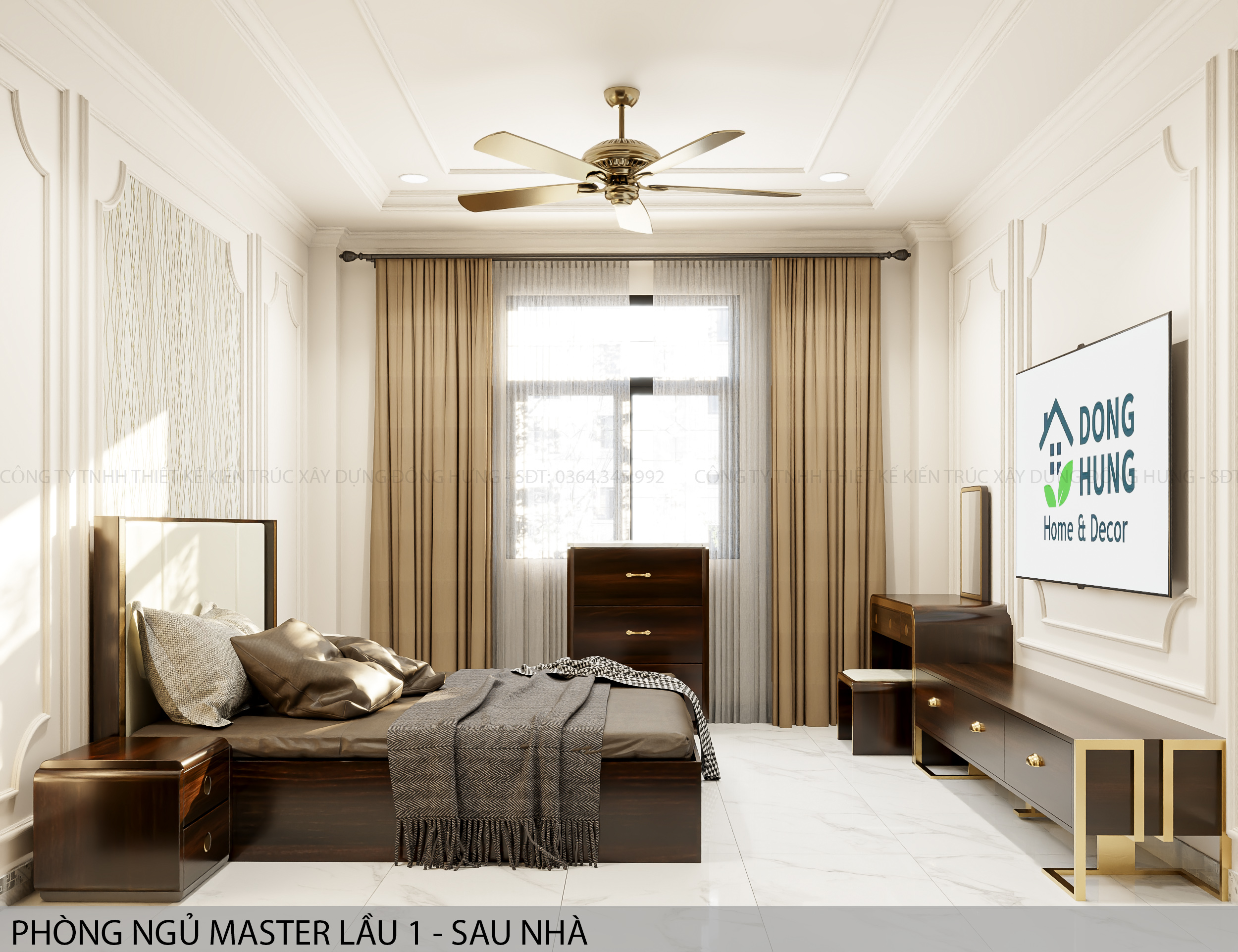 Phía sau nhà là phòng ngủ Master, nơi phong cách Tân cổ điển được thể hiện rõ qua các đường phào mềm mại, đầu giường bọc da sang trọng và ánh sáng dịu nhẹ.