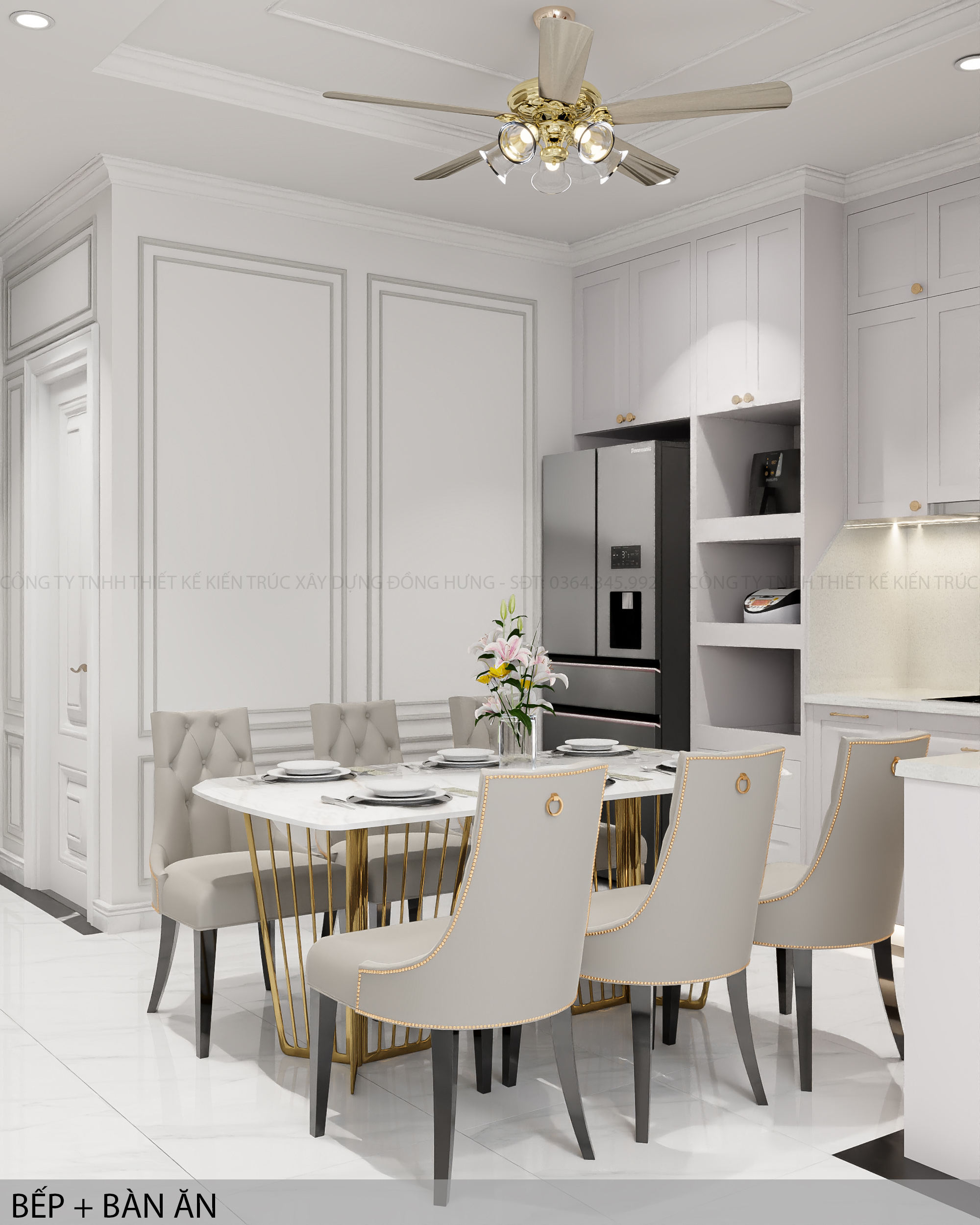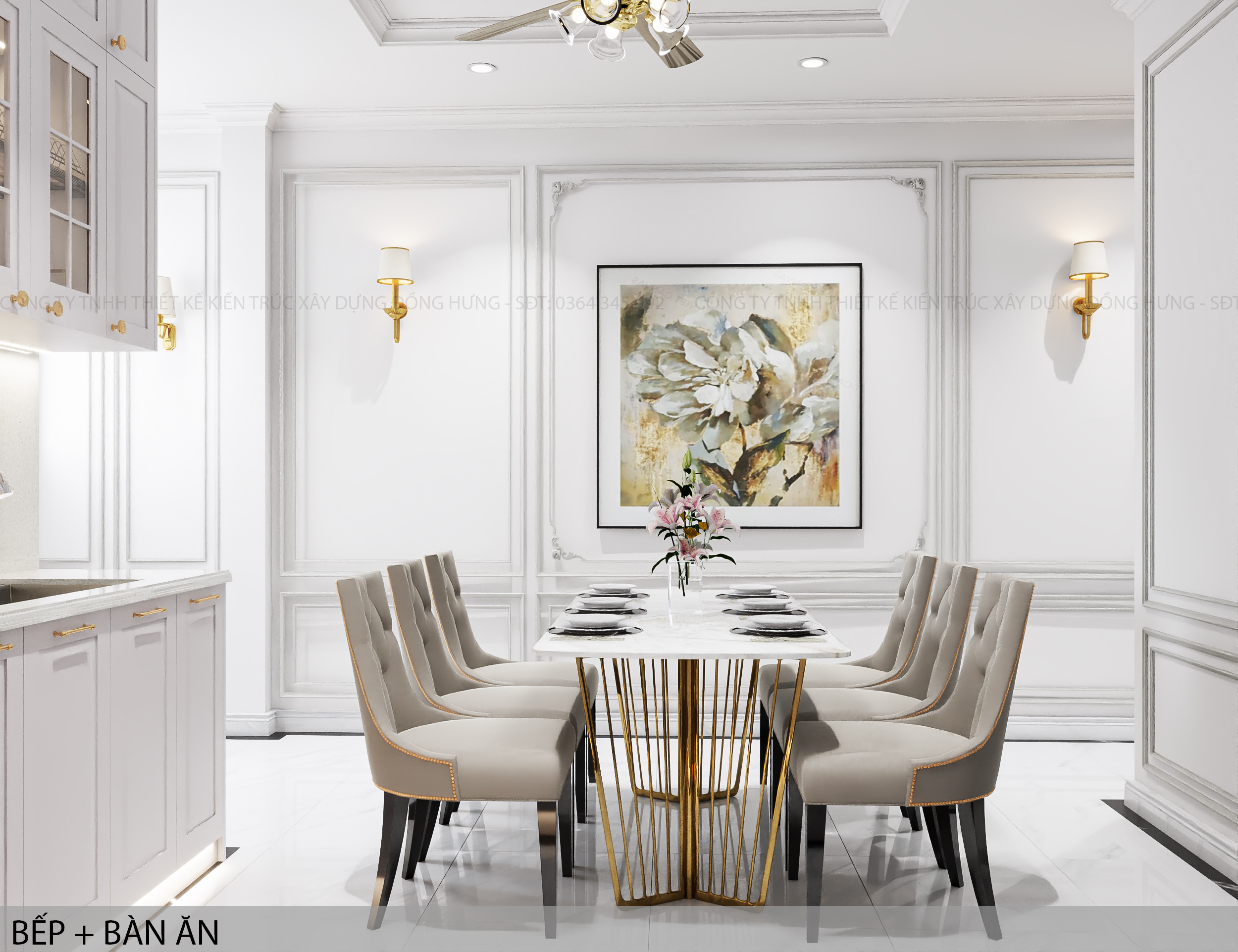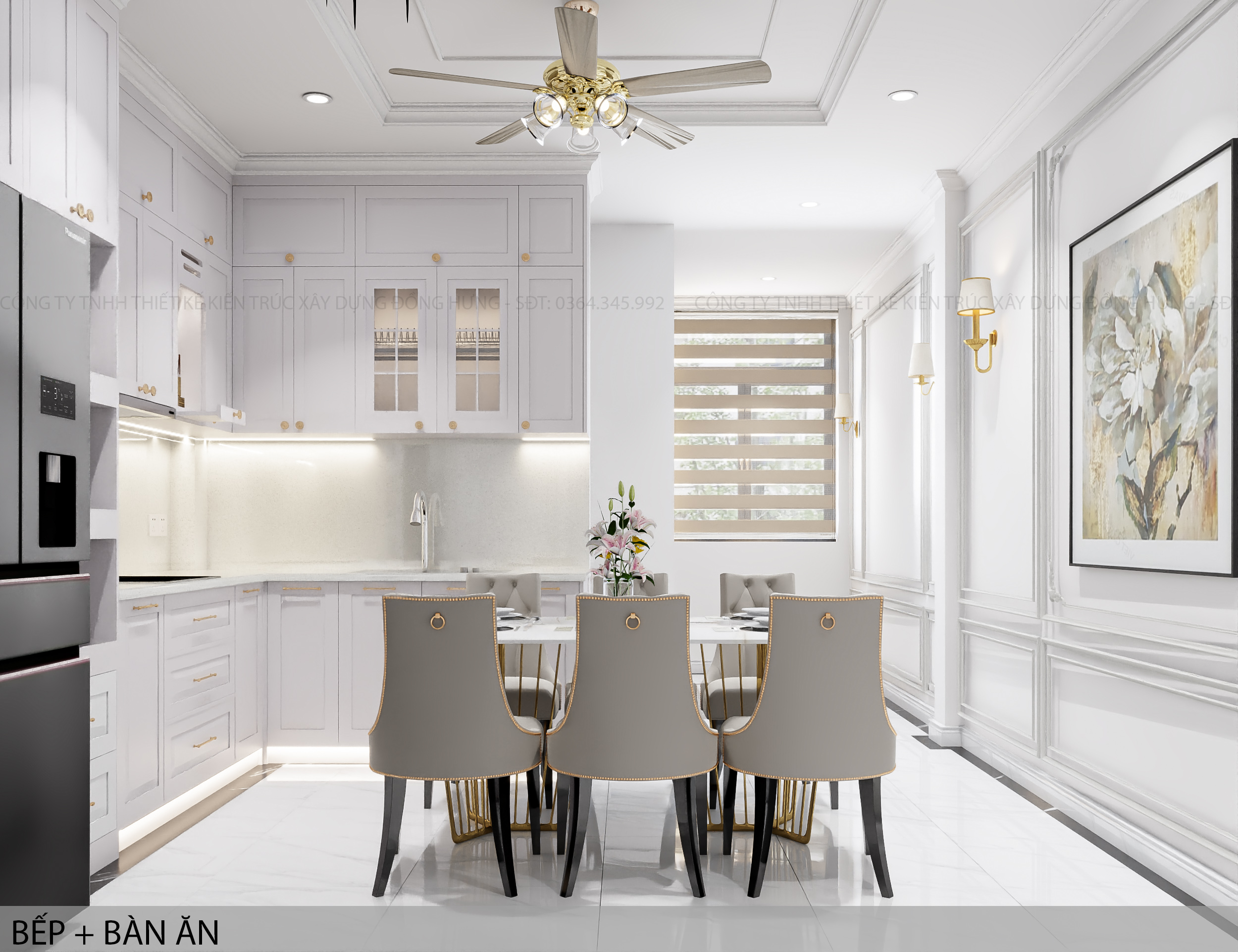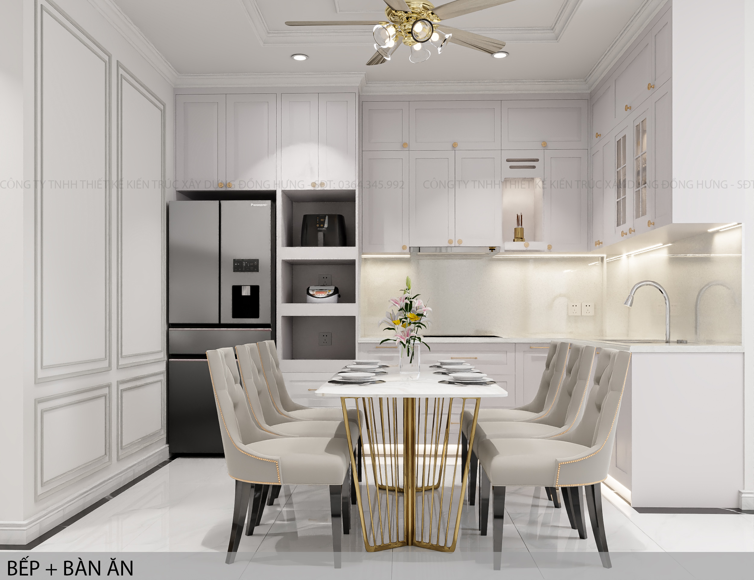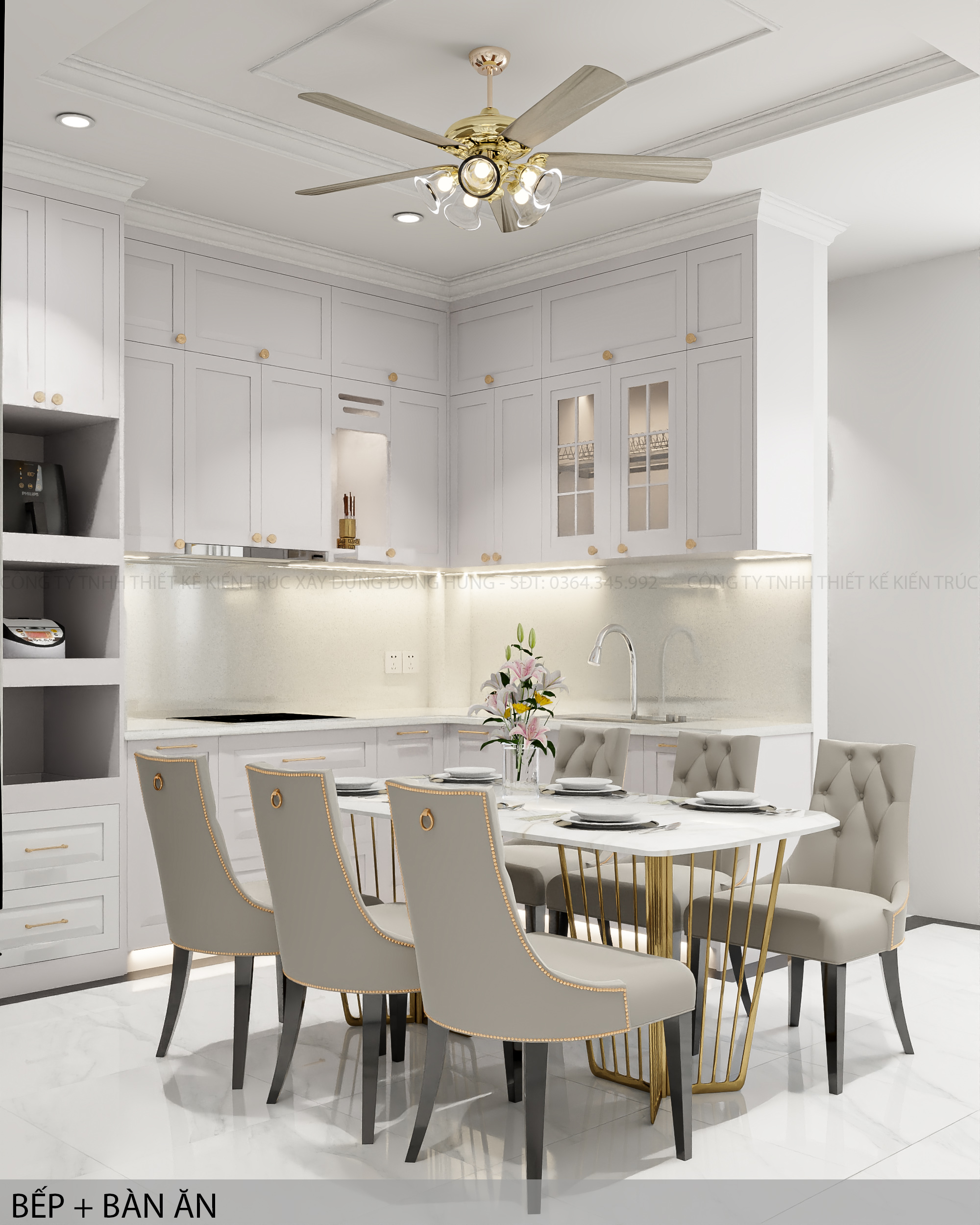 Từ cầu thang ôm trọn thang máy bước lên tầng 2, khu bếp hiện ra đầu tiên – gọn gàng và tinh tế. Cách bố trí khéo léo giúp không gian nấu nướng trở nên ấm cúng, thuận tiện di chuyển, đồng thời vẫn giữ được nét sang trọng của phong cách Tân cổ điển.