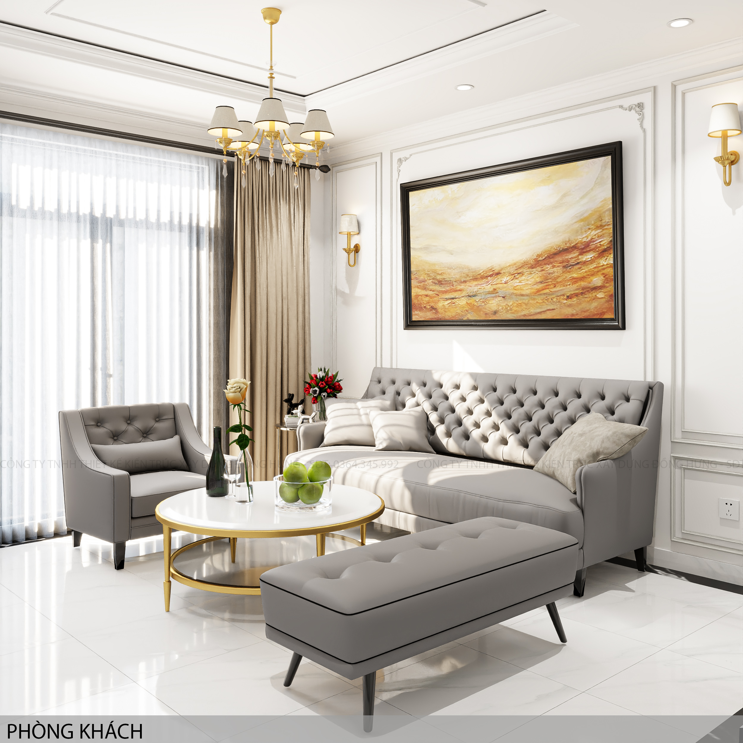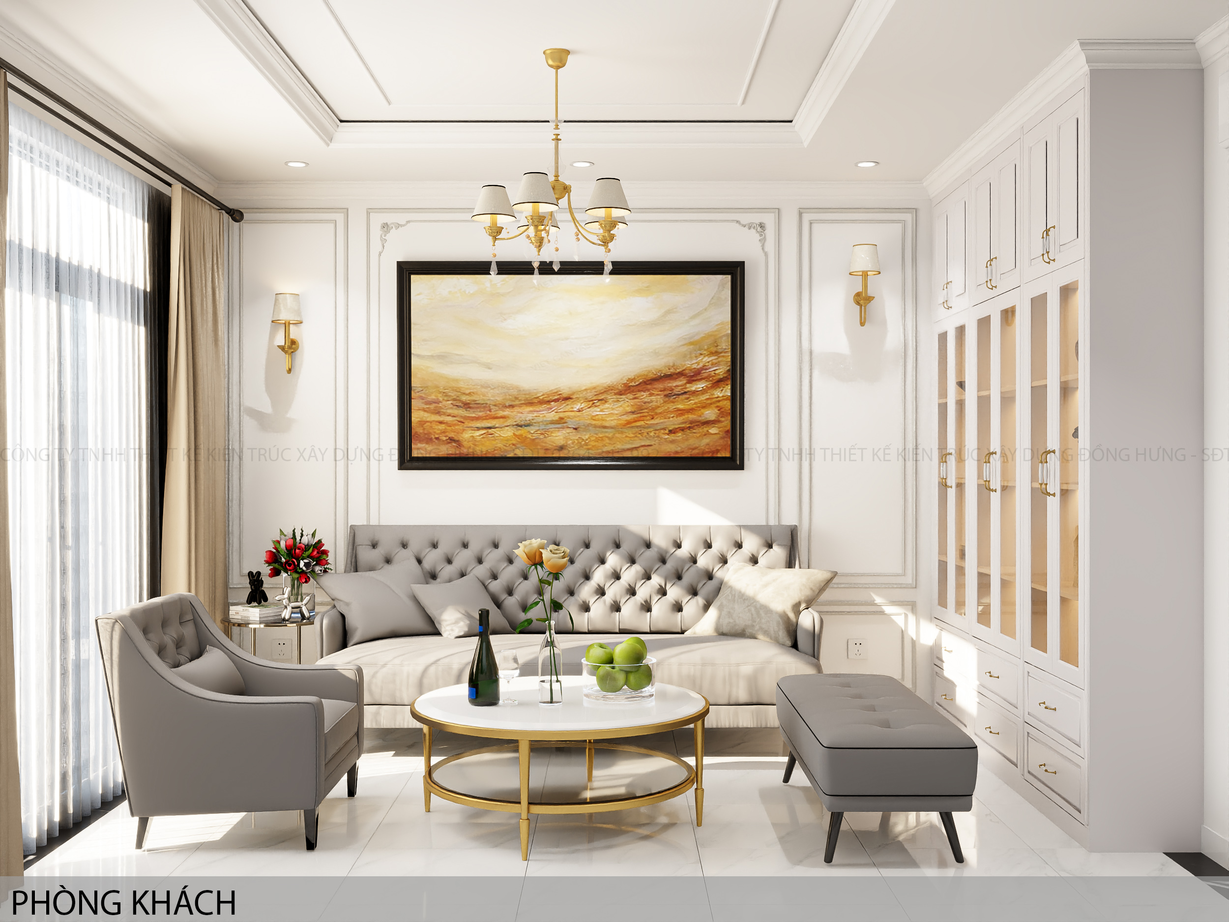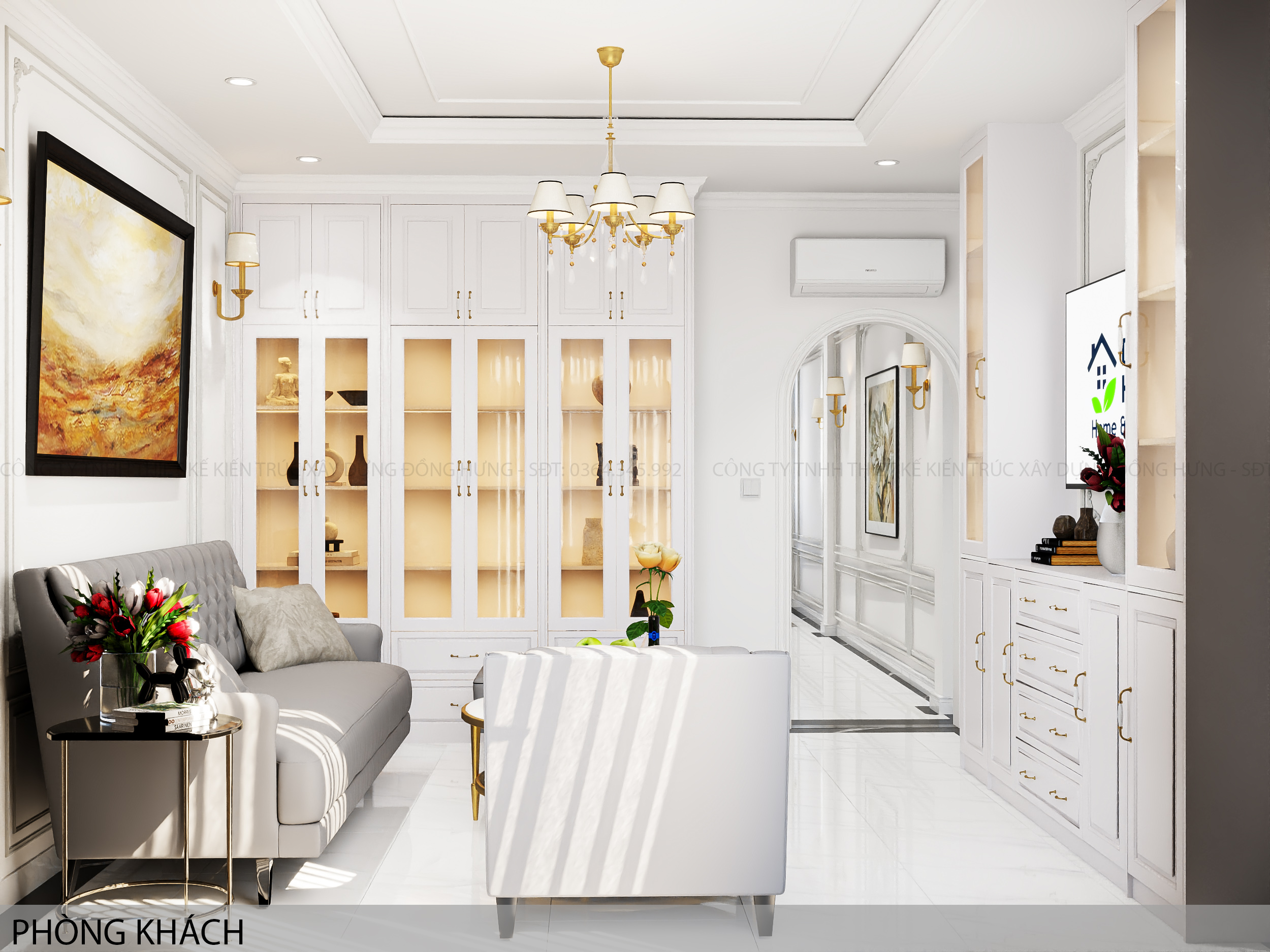 Đi dọc về phía trước là phòng khách, nơi tone trắng được tôn lên bởi ánh sáng tự nhiên tràn ngập. Những đường phào chỉ tinh tế, bộ sofa cổ điển, và ánh đèn vàng nhẹ nhàng tạo nên không gian tiếp khách đẳng cấp nhưng vẫn gần gũi, thân tình.