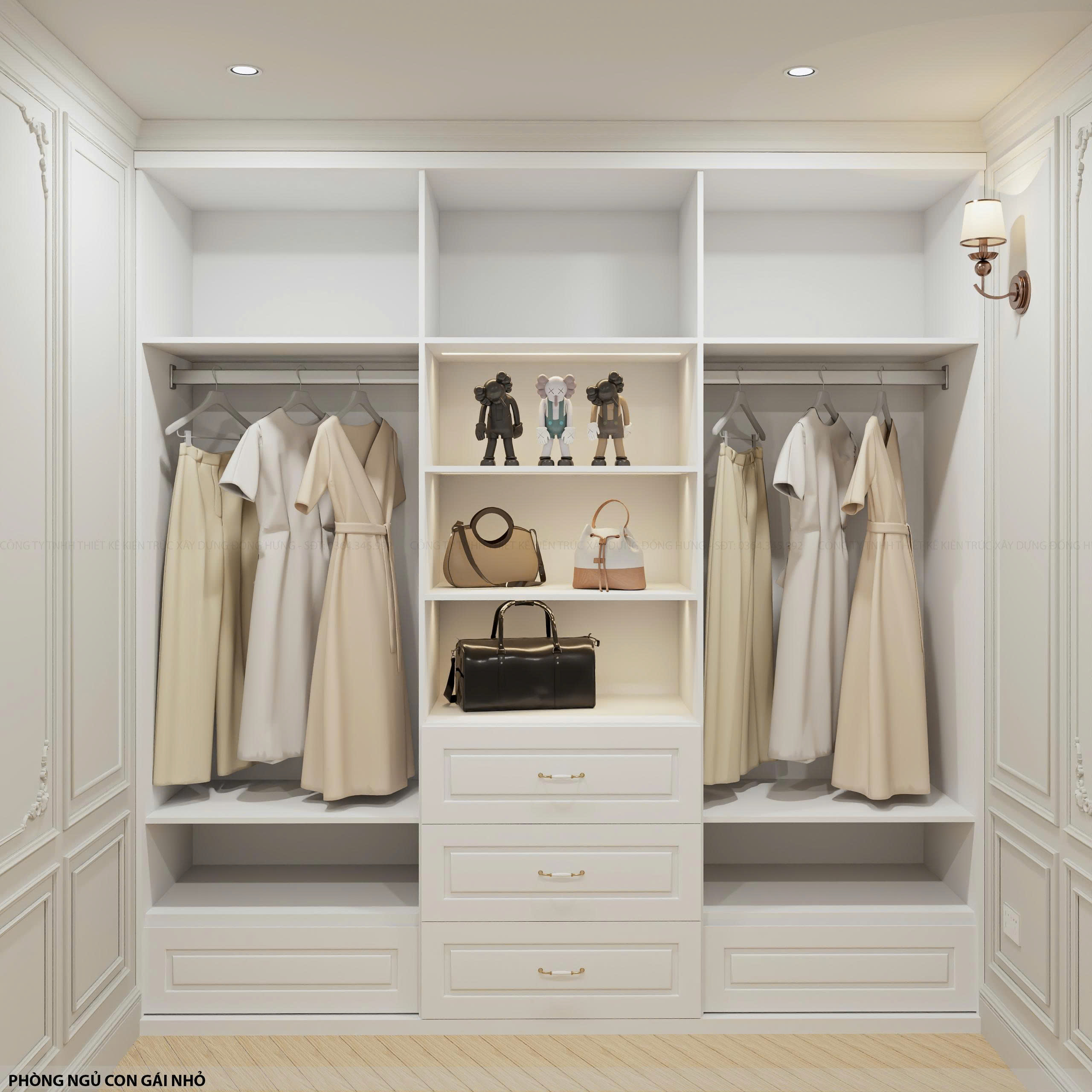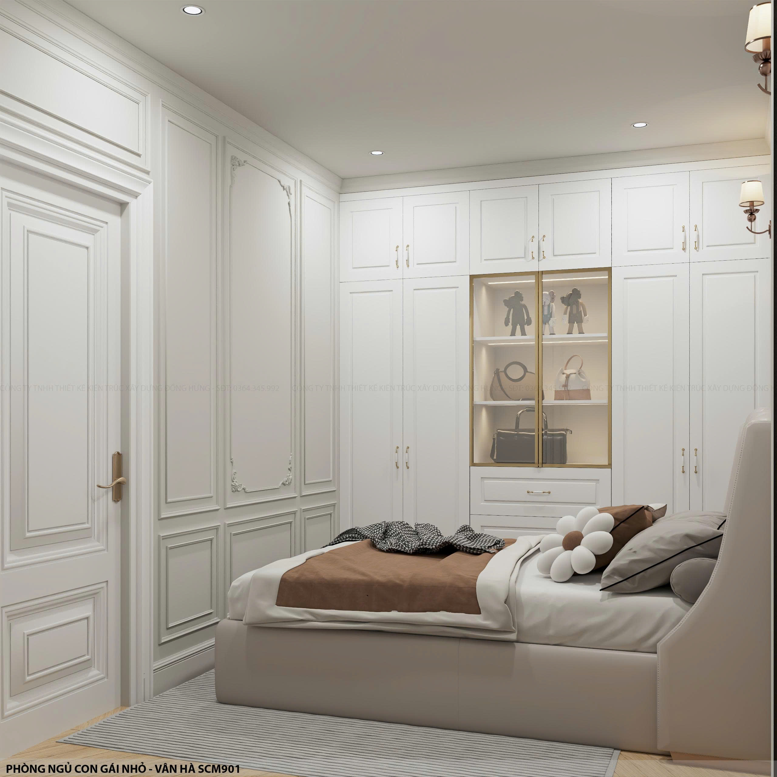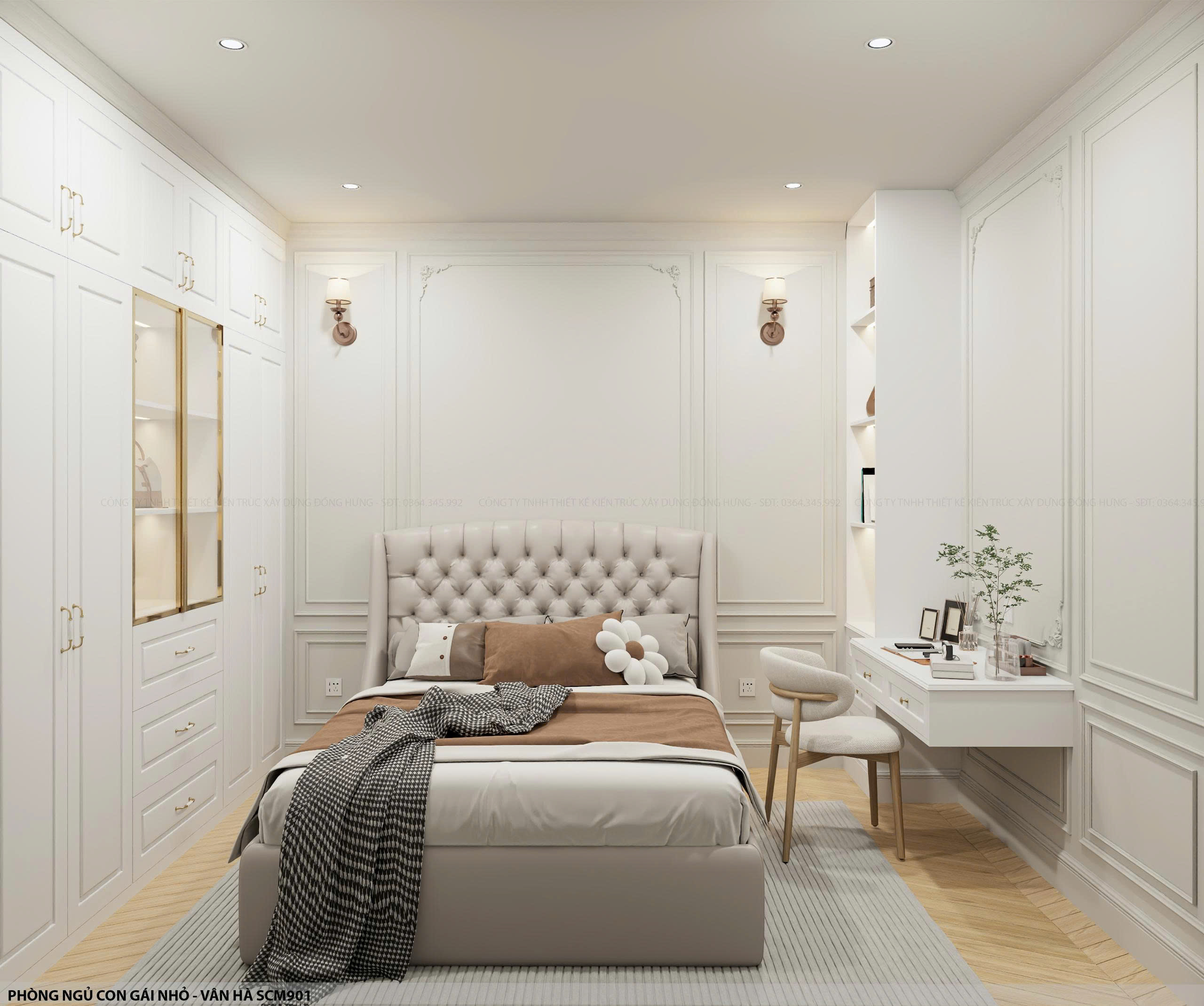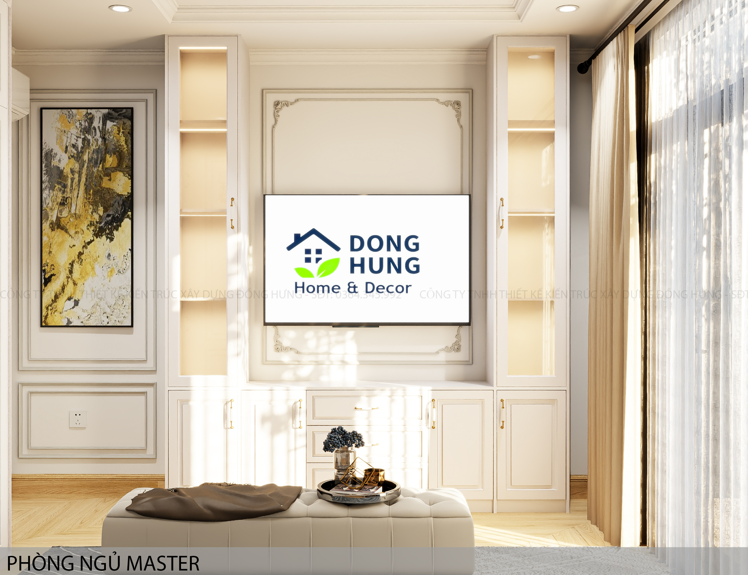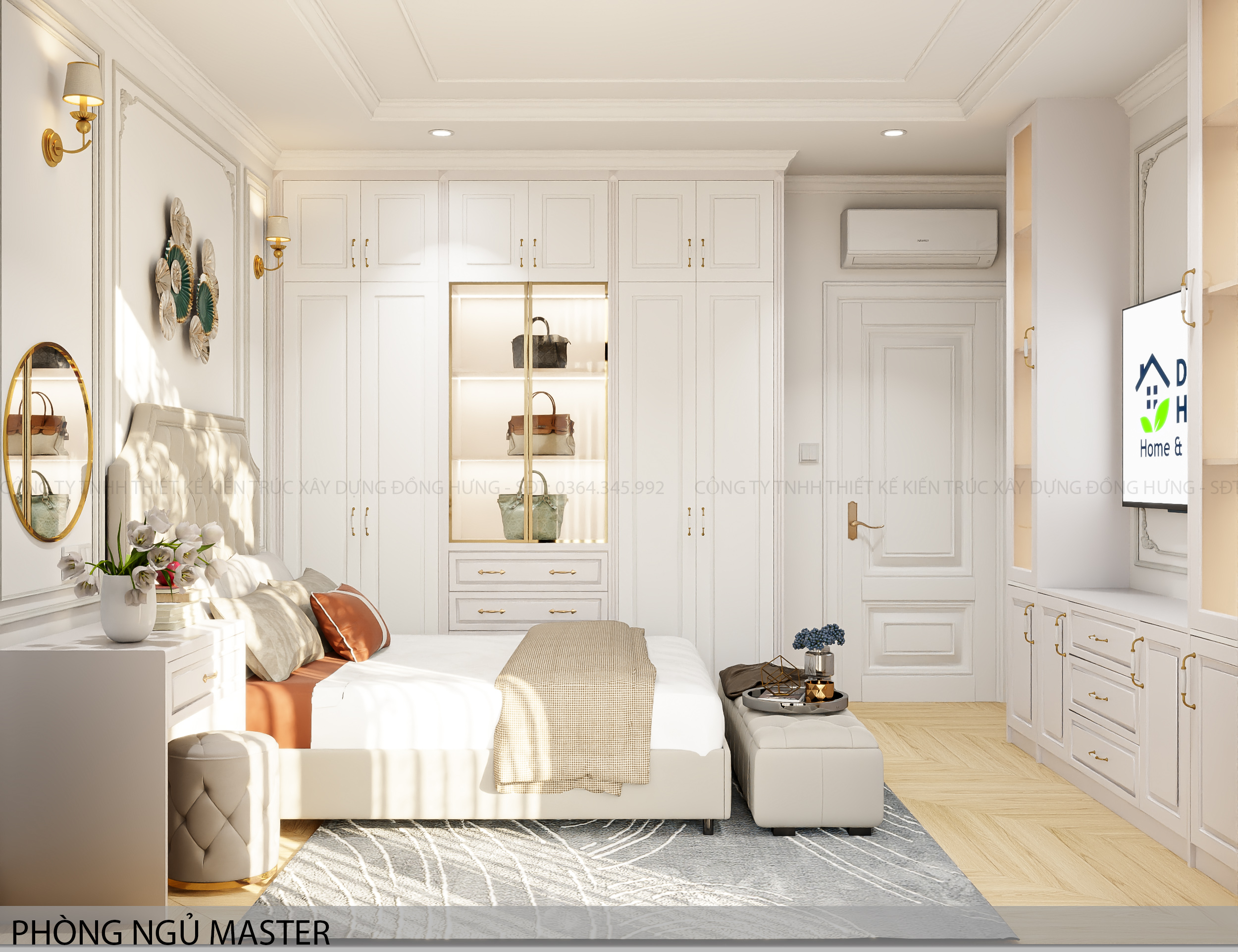 Phía sau là phòng kho nhỏ, gọn gàng và tiện dụng. Đi dọc hành lang ra phía trước, không gian mở ra là phòng ngủ Master – nơi tinh thần Tân cổ điển thể hiện rõ nét nhất.