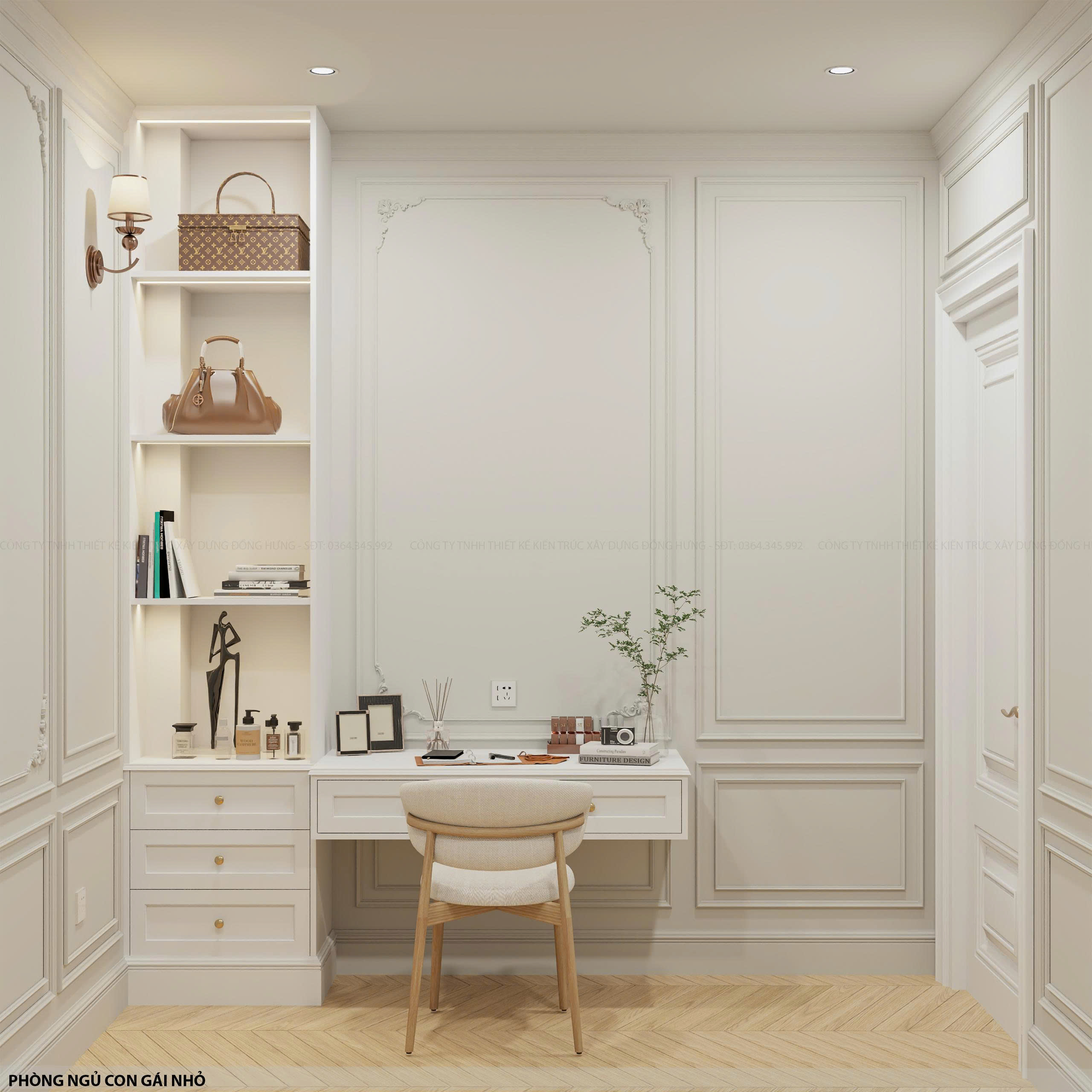 Tone trắng chủ đạo xuyên suốt không gian, kết hợp cùng trần thạch cao giật cấp và phào chỉ tường mềm mại, mang lại cảm giác thoáng đãng, thanh lịch mà vẫn đầy khí chất quý phái.