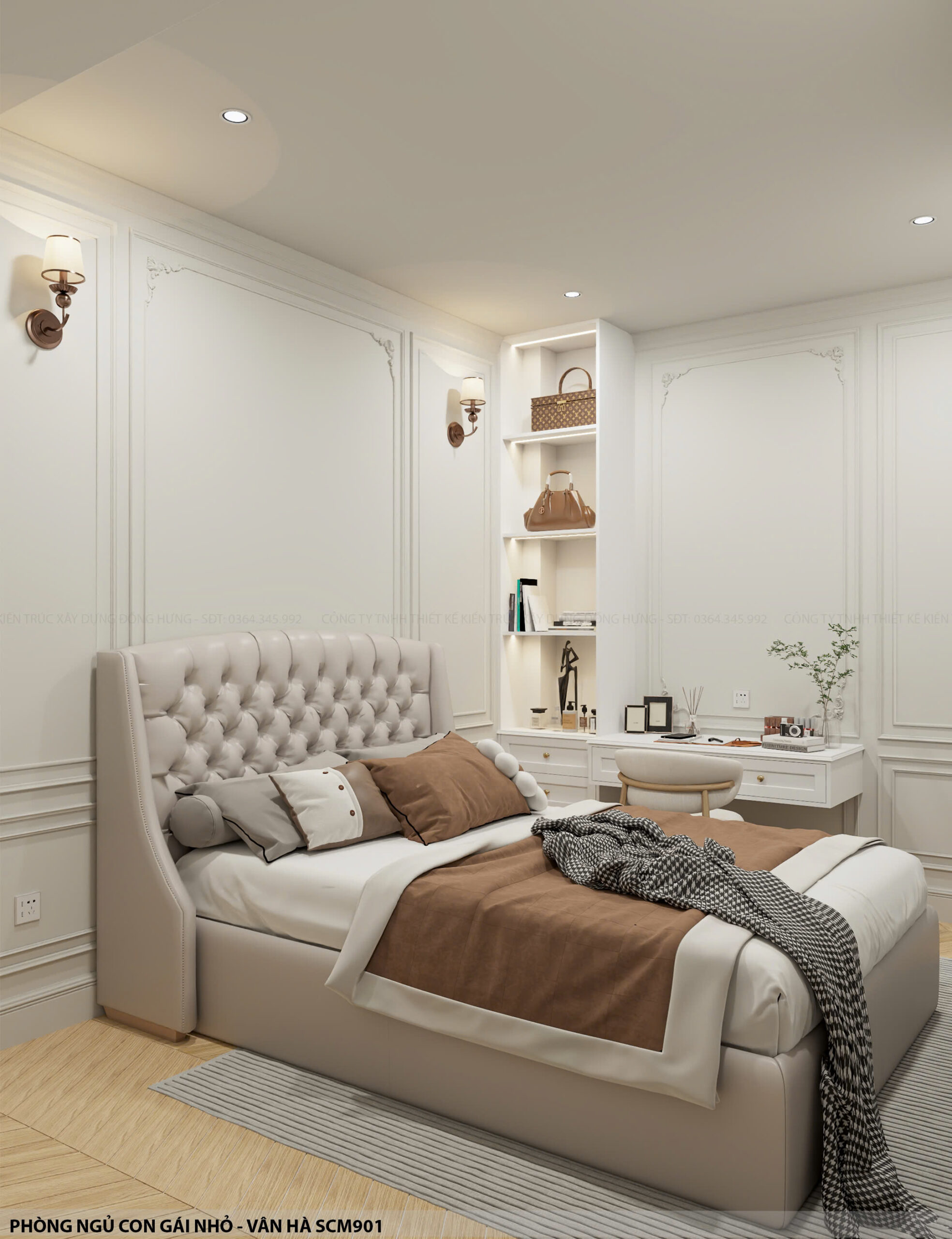 Các chi tiết phào chỉ, đầu giường bọc da, đèn ngủ kim loại ánh đồng kết hợp cùng tông trắng – kem chủ đạo khiến căn phòng toát lên vẻ sang trọng, quyền quý nhưng vẫn đầy cảm xúc riêng tư và ấm áp.