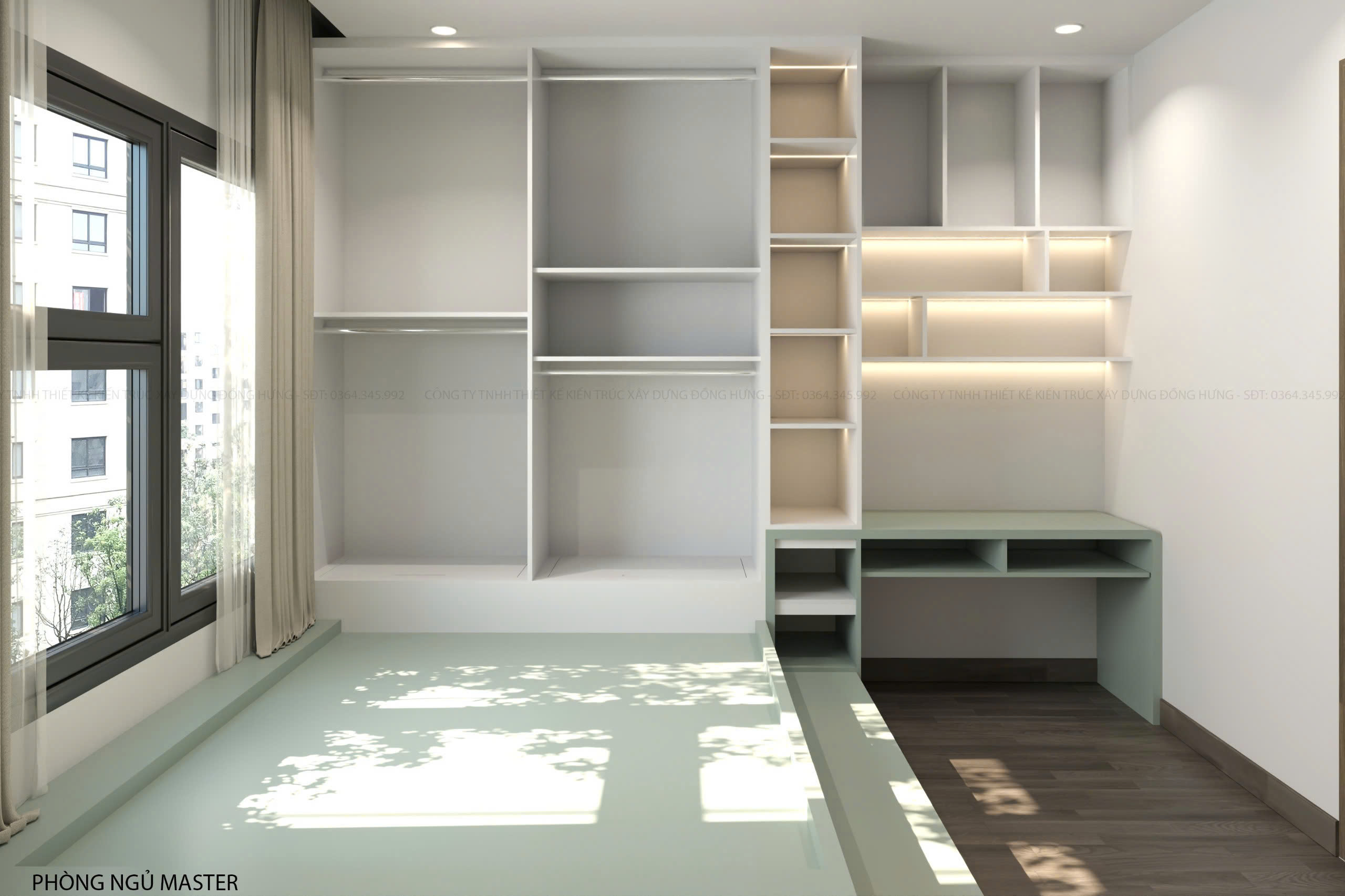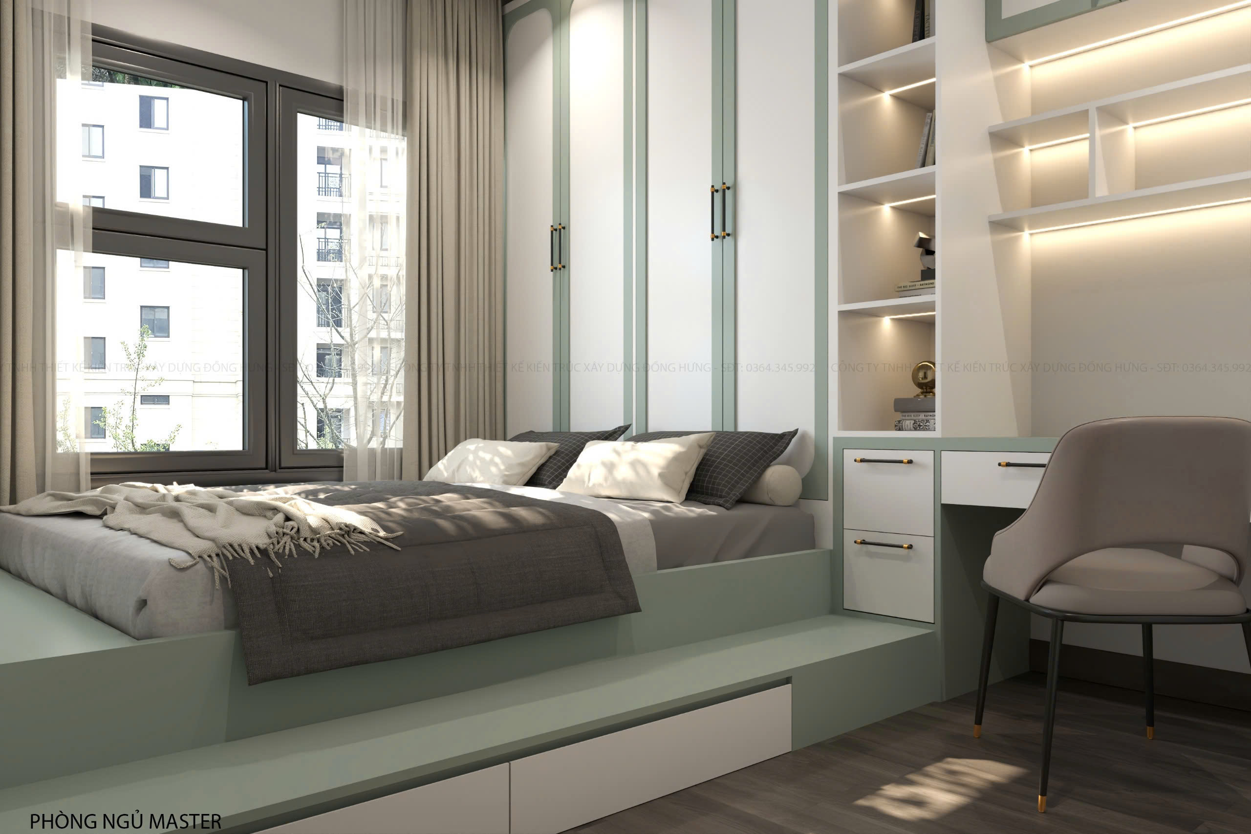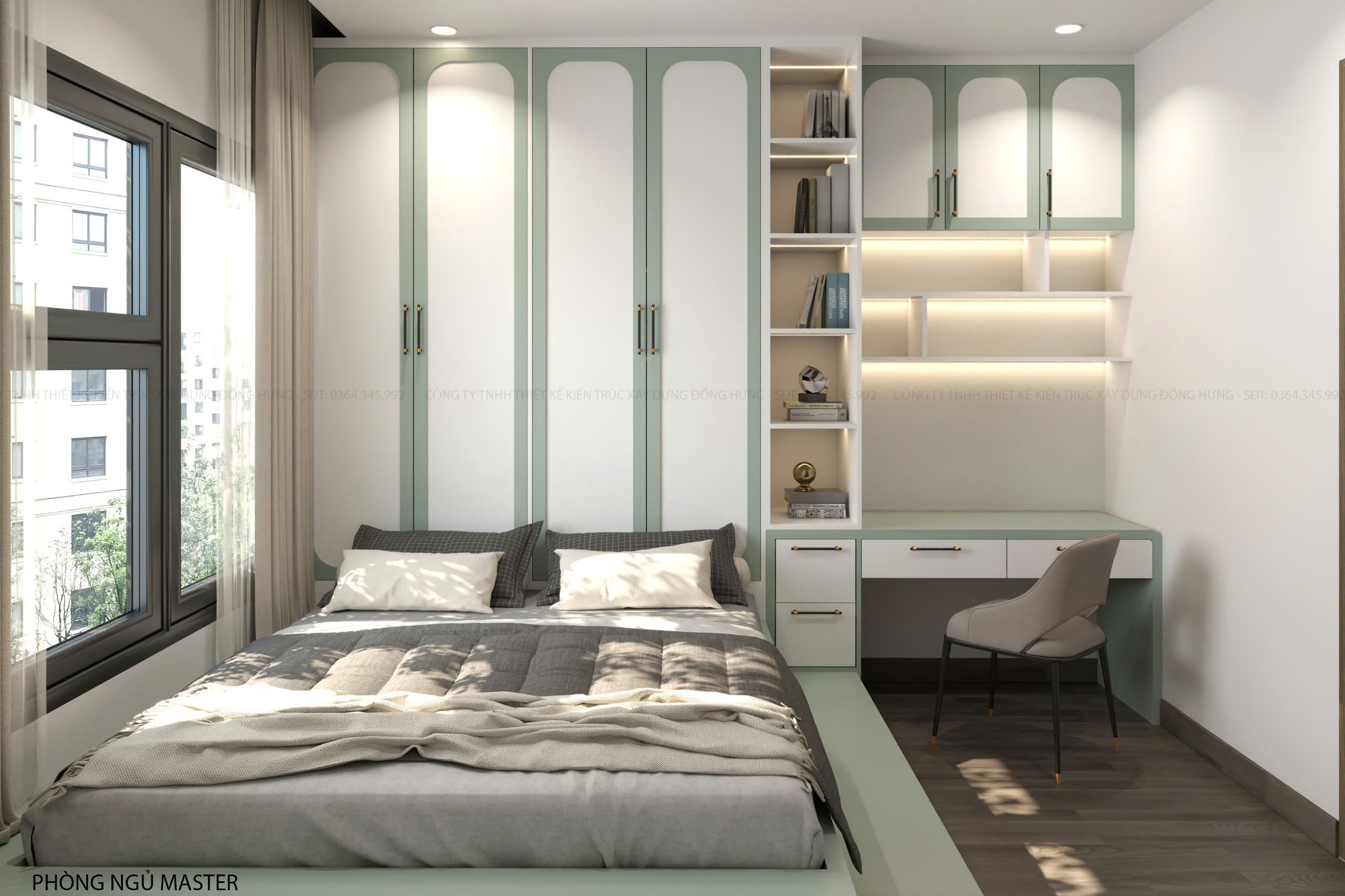 2. Phòng ngủ master ấm áp với tone màu xanh