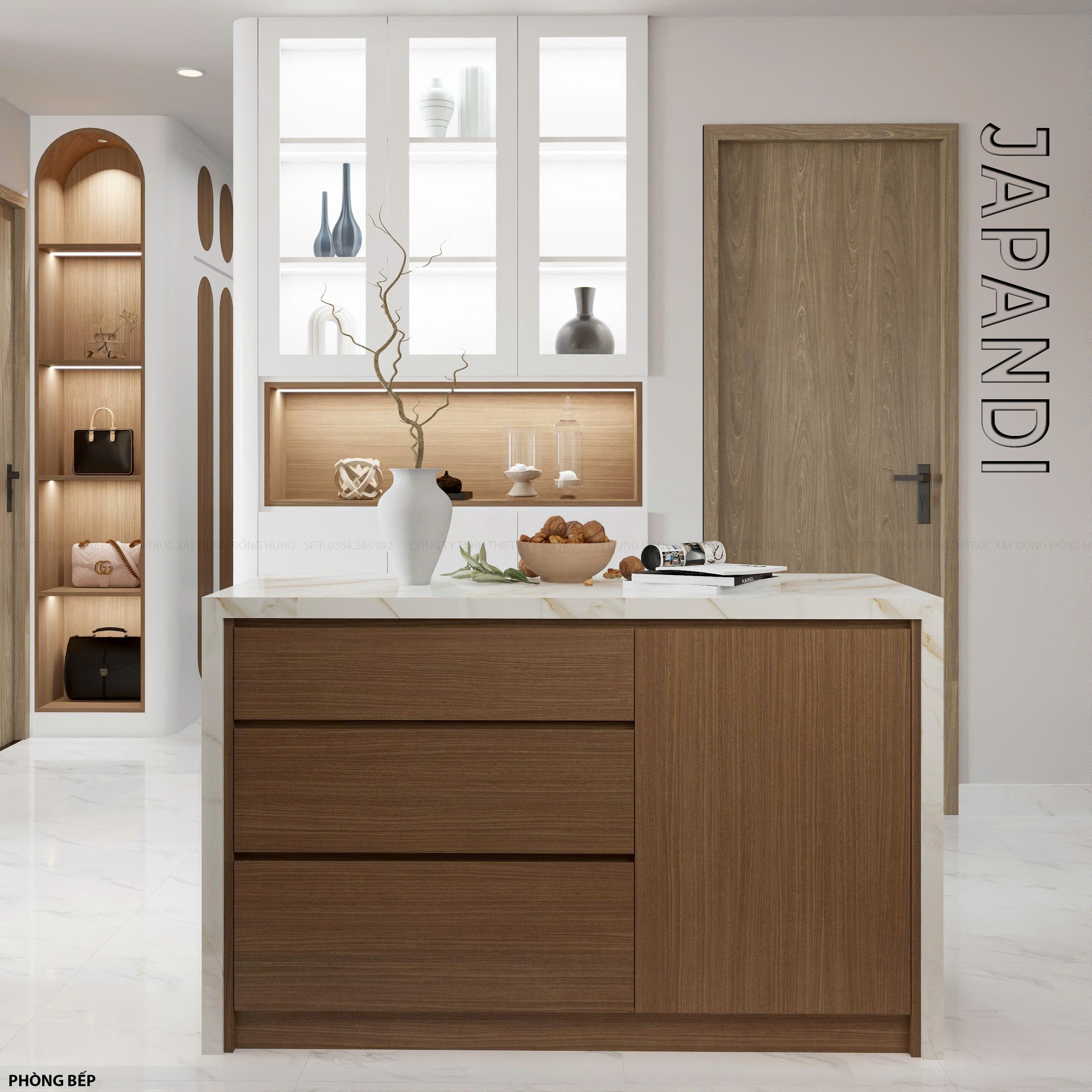 Tone màu trắng – nâu gỗ: Đặc trưng của phong cách Japandi, kết hợp vân đá marble vân vàng kem nhẹ nhàng, sang trọng.