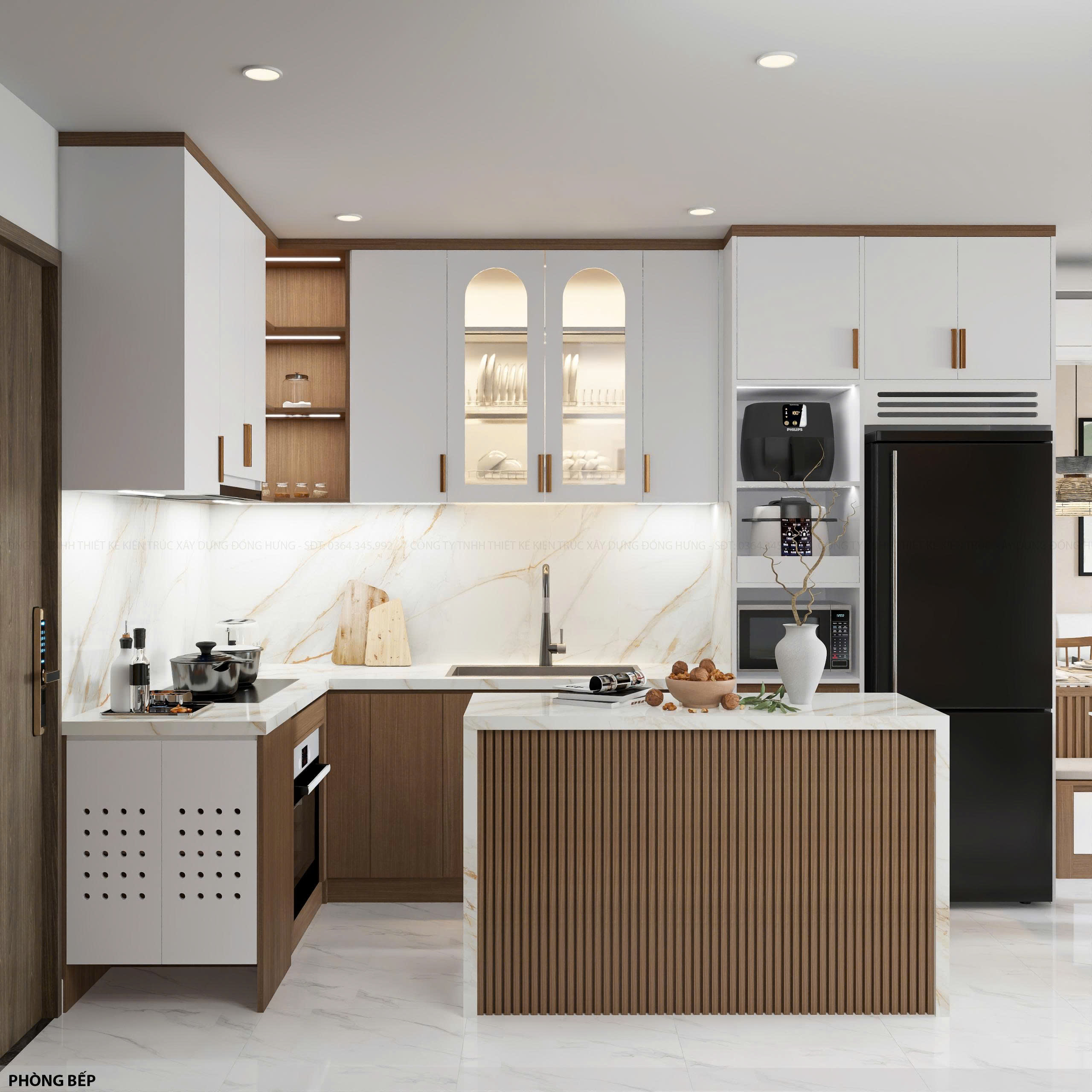 Tủ bếp chữ L kết hợp đảo bếp: Tối ưu diện tích căn hộ nhỏ, dễ di chuyển khi nấu nướng.