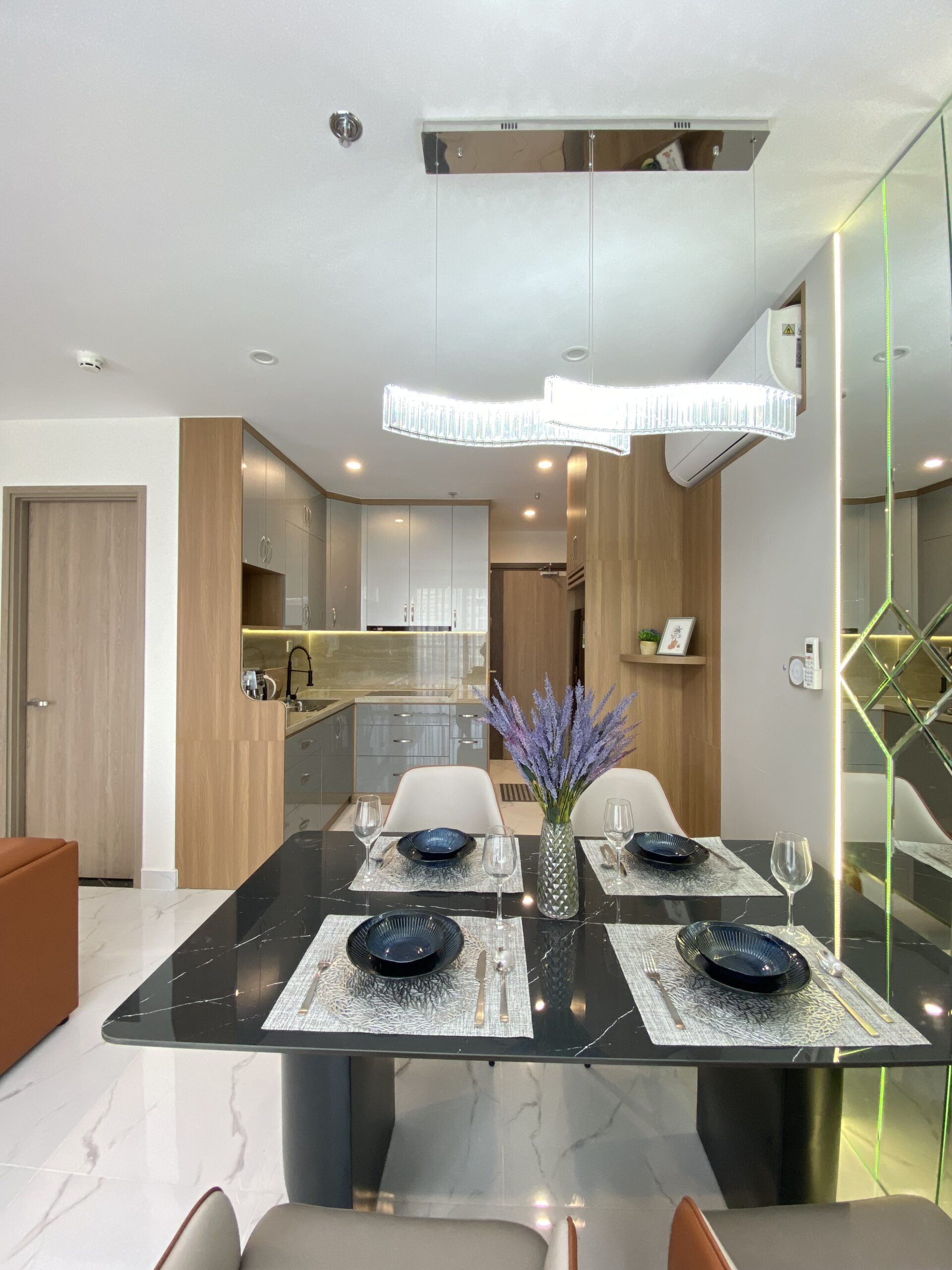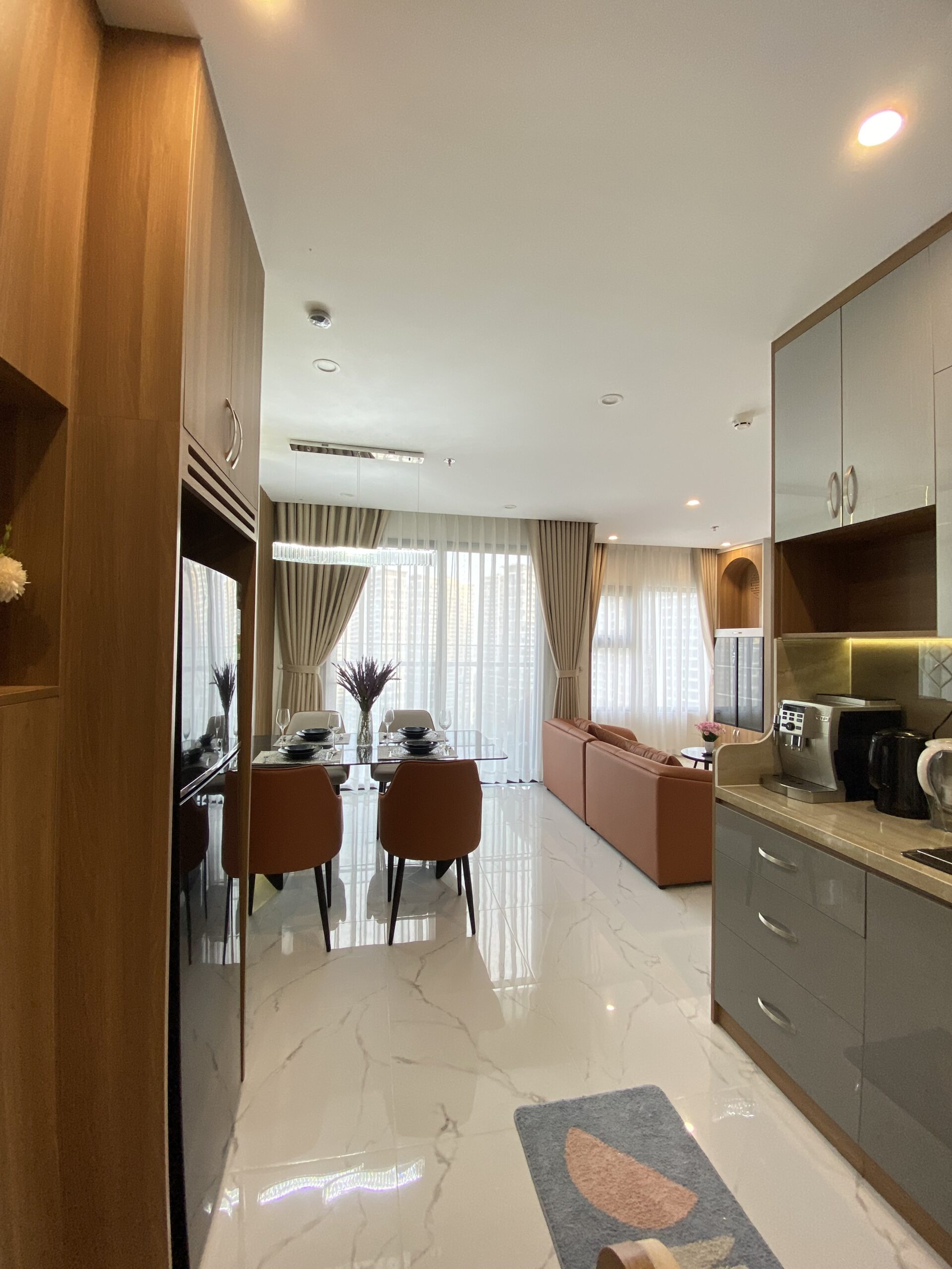 Không gian phòng khách – bếp – ăn được bố trí liên thông, hạn chế vách ngăn nhằm mở rộng tầm nhìn và tận dụng tối đa ánh sáng tự nhiên từ ban công. Tông màu trung tính kết hợp vật liệu cao cấp giúp căn hộ giữ được vẻ sang trọng và bền đẹp theo thời gian.