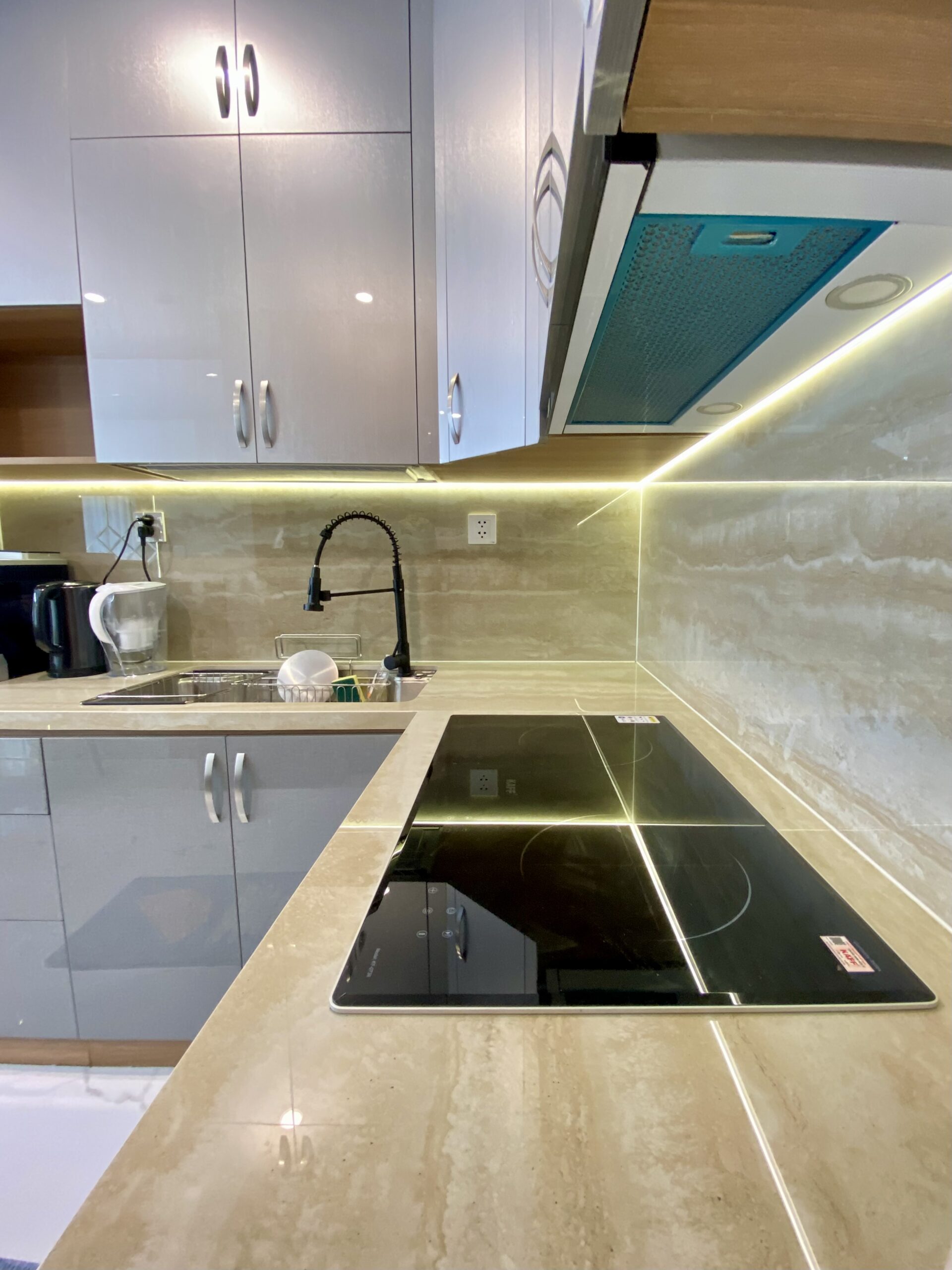 Các thiết bị và phụ kiện bếp đến từ Kaff, Eurogold… được lựa chọn đồng bộ, đảm bảo tiêu chuẩn sử dụng, tính thẩm mỹ và độ bền lâu dài.