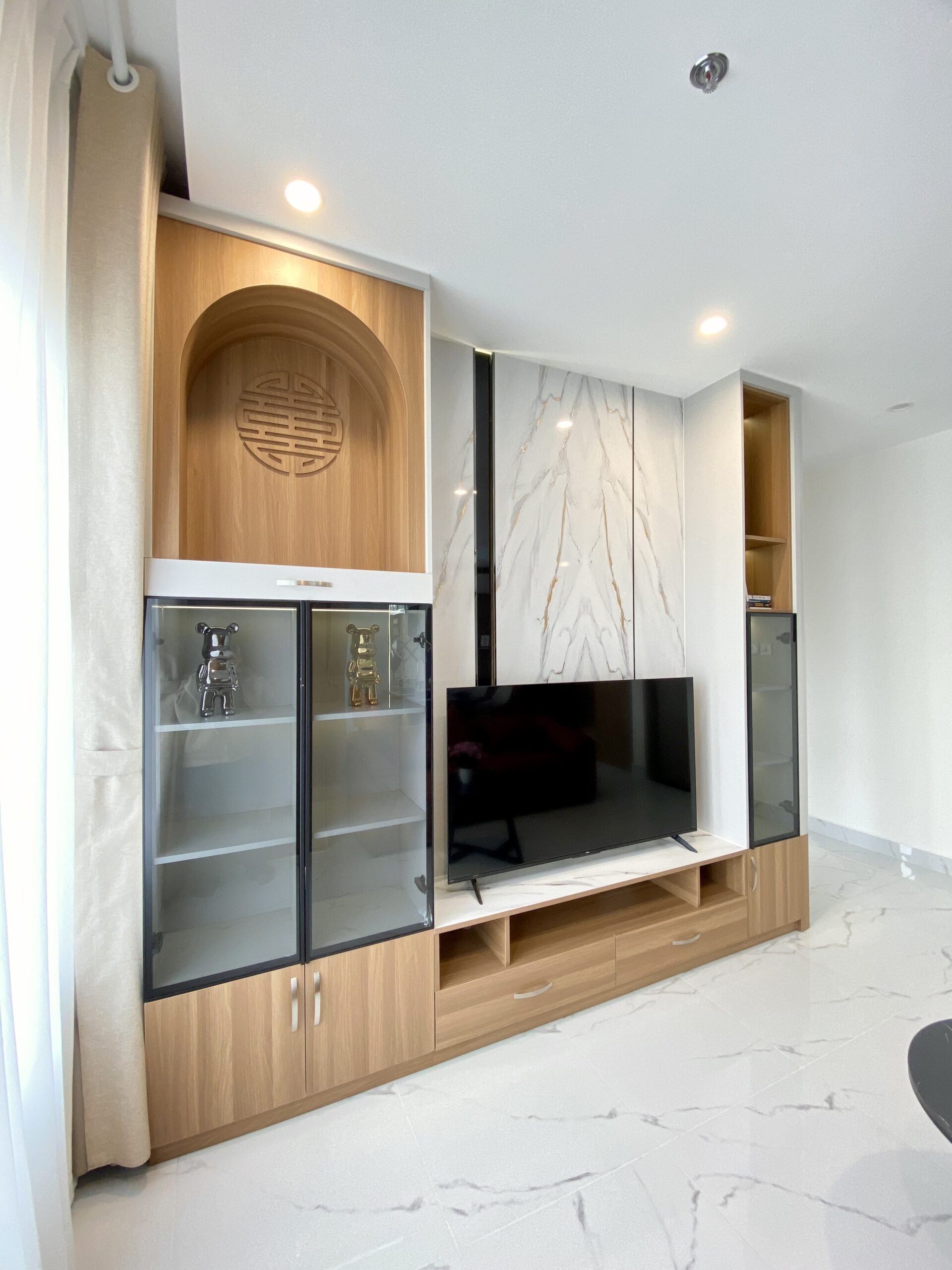 Toàn bộ hệ tủ và nội thất gỗ trong căn hộ sử dụng gỗ Á Châu, được xử lý kỹ lưỡng, đảm bảo độ bền, chống cong vênh và mang lại bề mặt hoàn thiện sắc nét.