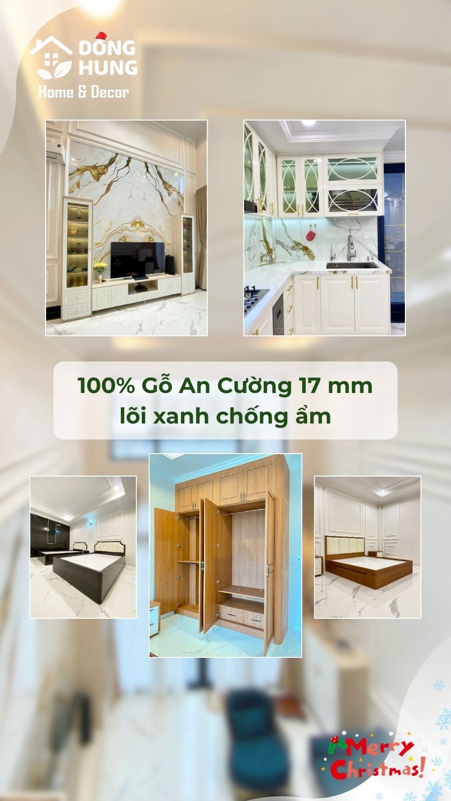 Toàn bộ nội thất trong công trình sử dụng 100% gỗ An Cường dày 17mm lõi xanh chống ẩm, phù hợp với điều kiện khí hậu nóng ẩm và cường độ sử dụng cao của nhà phố nhiều tầng.