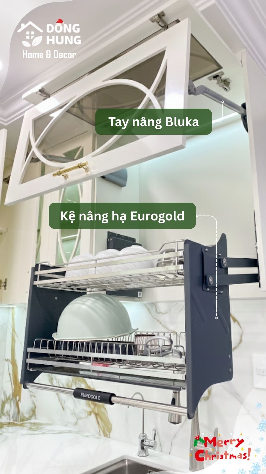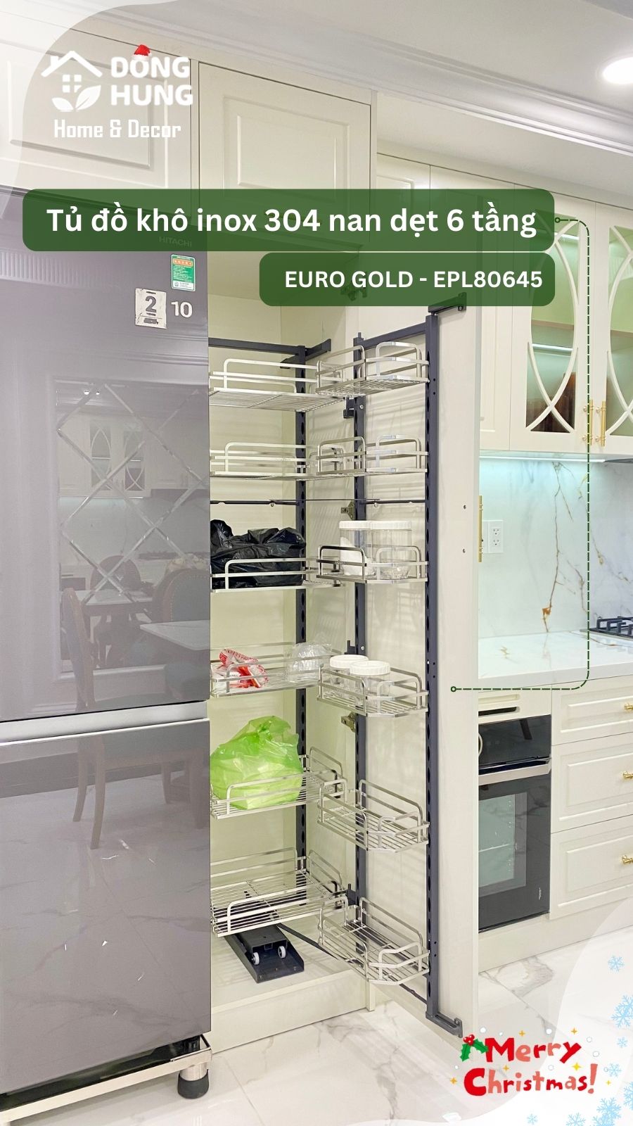 Phụ kiện Eurogold cao cấp gồm kệ nâng hạ, tủ đồ khô inox 304, thùng gạo, khay chia thìa nĩa…