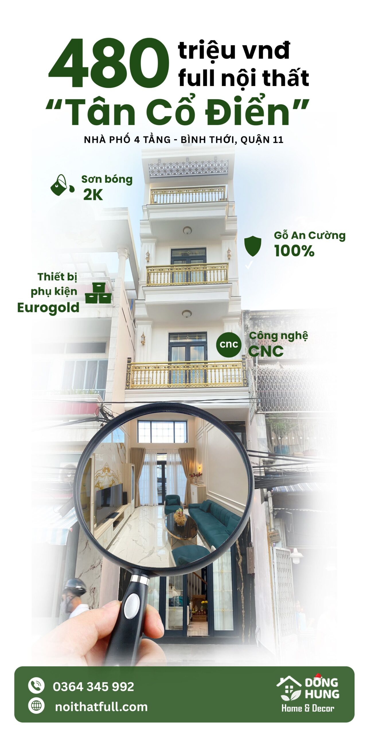 Công trình nhà phố 4 tầng tại Bình Thới, Quận 11 do Nội thất Đồng Hưng thiết kế và thi công trọn gói là một ví dụ tiêu biểu cho việc kết hợp hài hòa giữa thẩm mỹ Tân cổ điển và công năng sử dụng bền vững theo thời gian. Không gian được nghiên cứu kỹ lưỡng từ bố cục, vật liệu đến chi tiết hoàn thiện, nhằm mang lại trải nghiệm sống tiện nghi, sang trọng và lâu dài cho gia chủ.