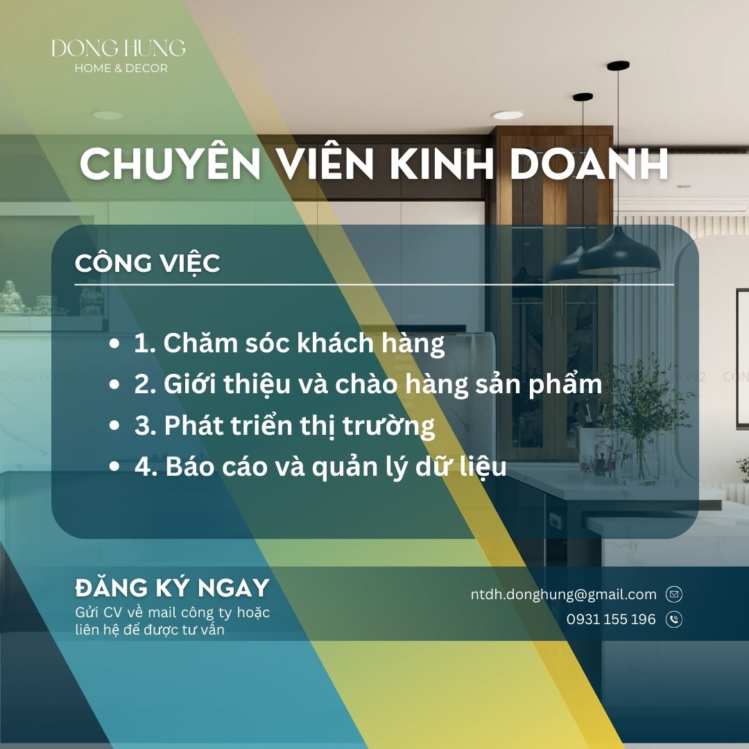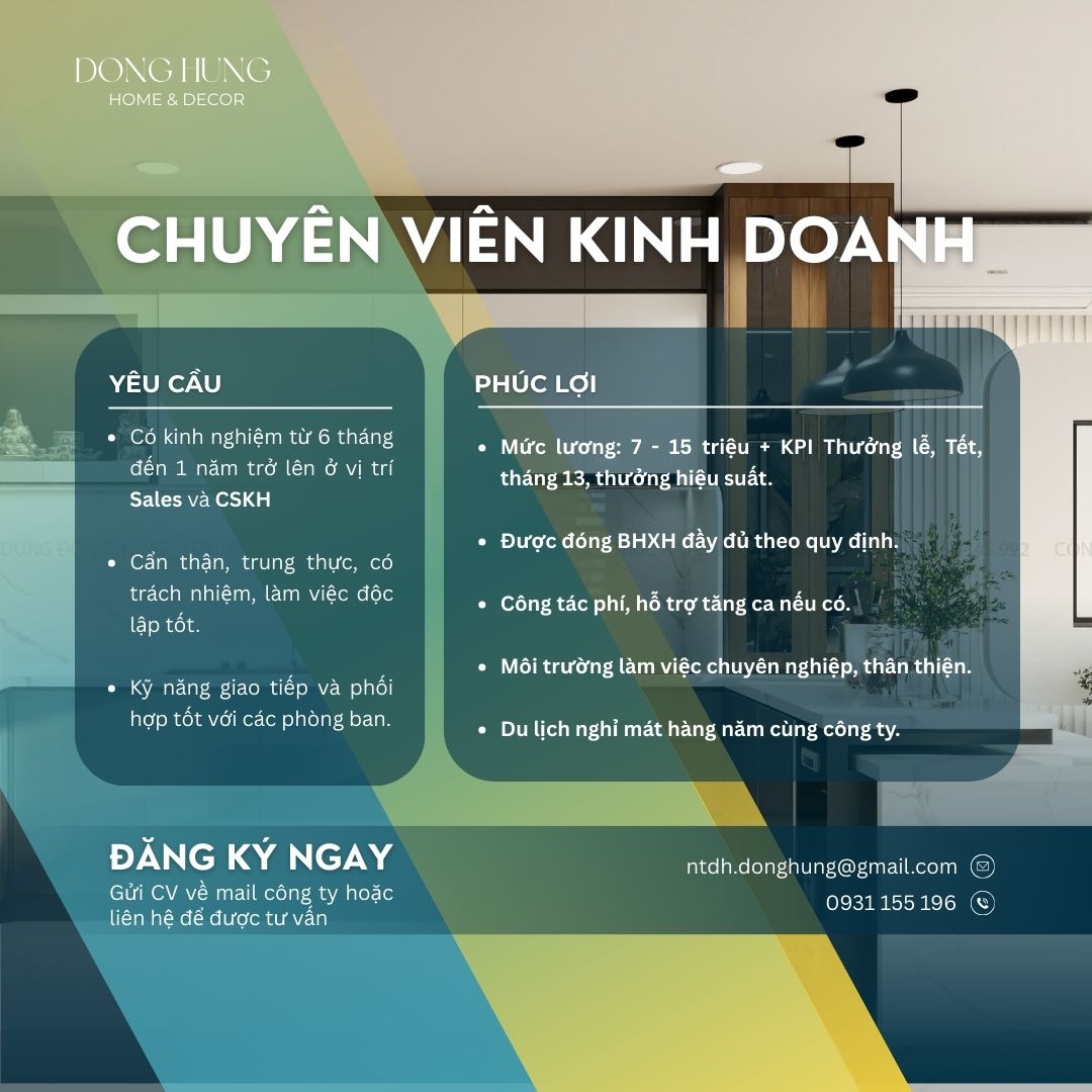 Bạn đang tìm kiếm việc làm chăm sóc khách hàng nội thất trong môi trường năng động, chuyên nghiệp và có nhiều cơ hội phát triển? Công ty Nội thất Đồng Hưng hiện đang tuyển dụng vị trí Sales – Chăm sóc khách hàng, phù hợp cho những ứng viên yêu thích giao tiếp, đam mê kinh doanh và mong muốn gắn bó lâu dài với ngành nội thất.