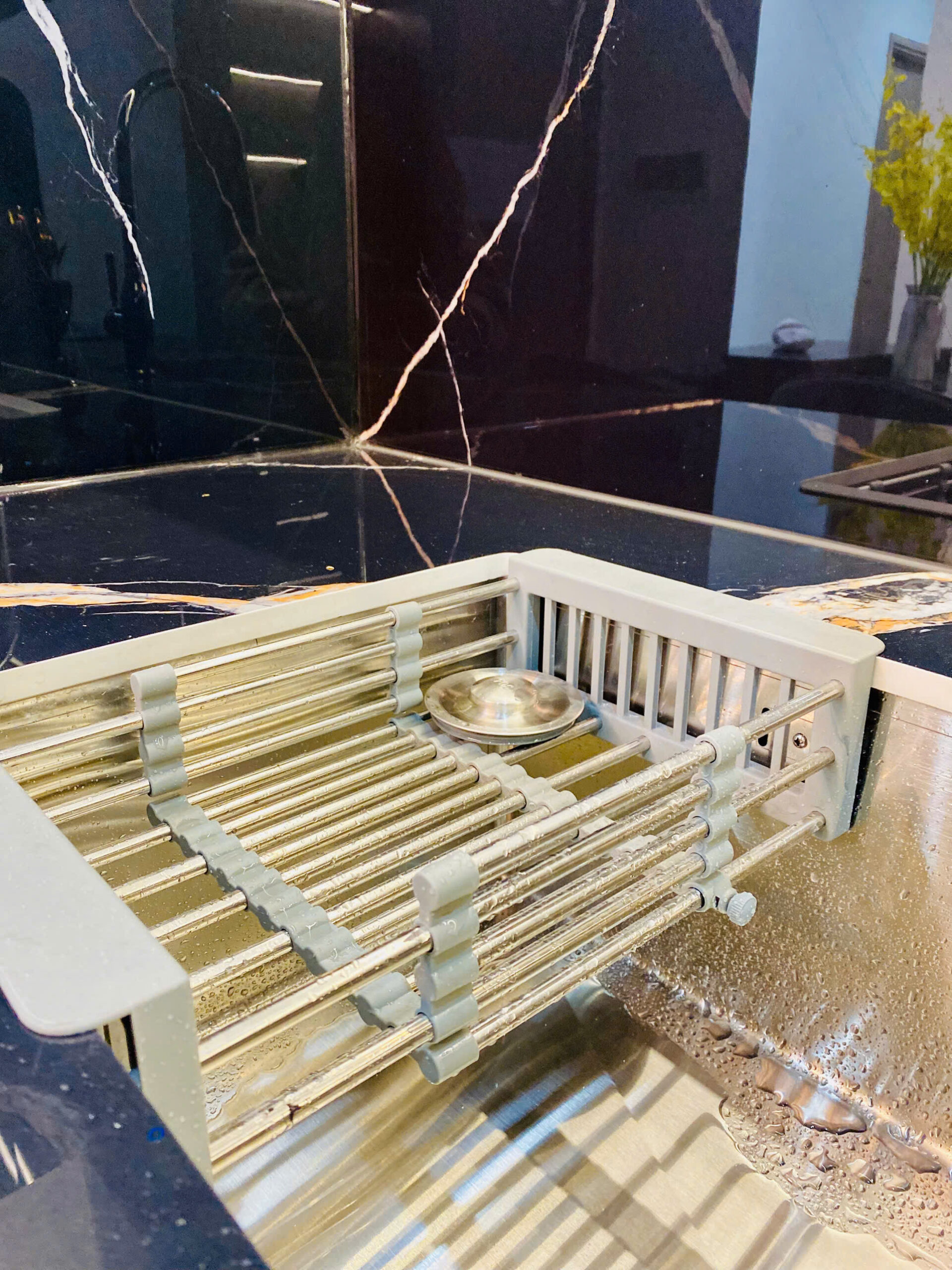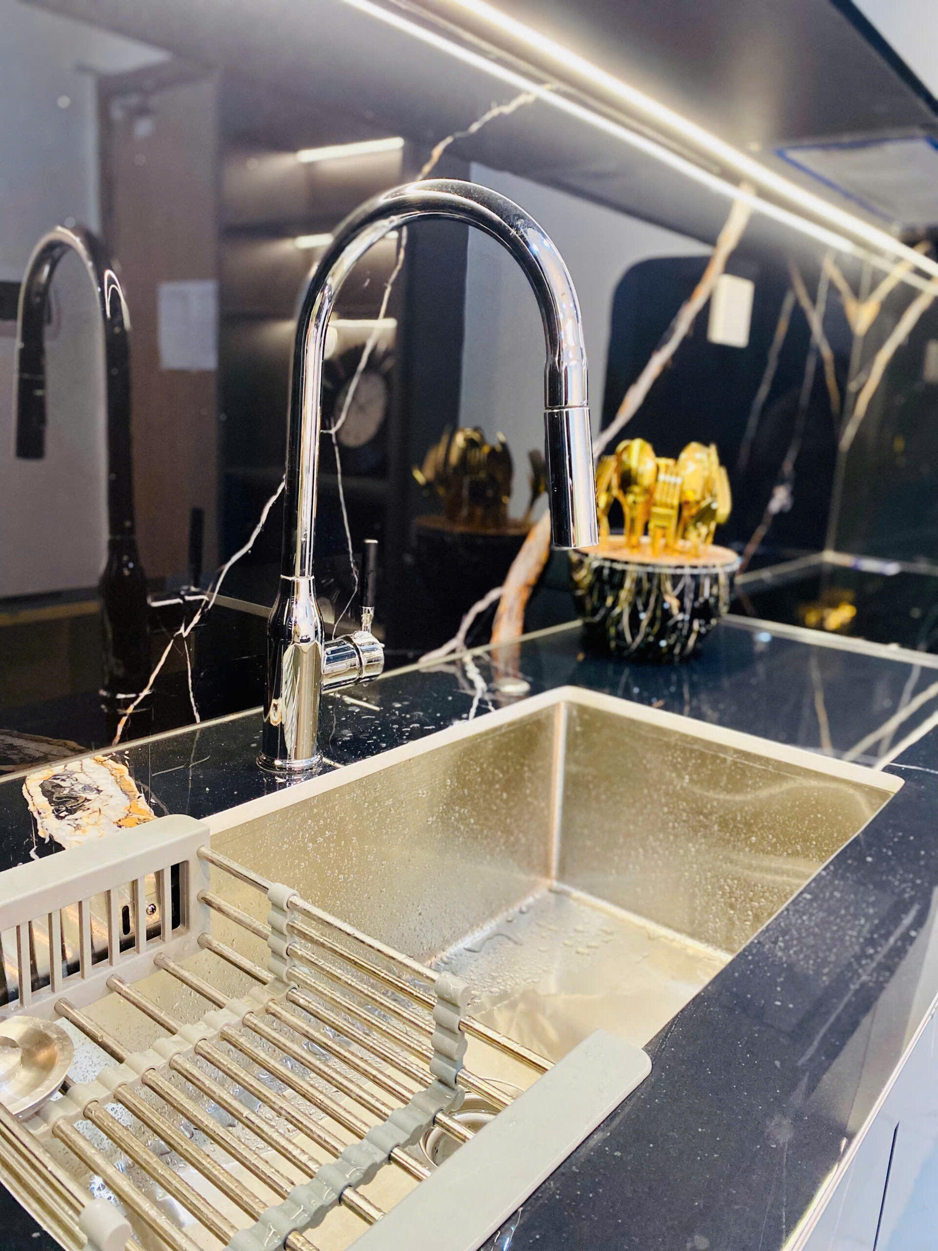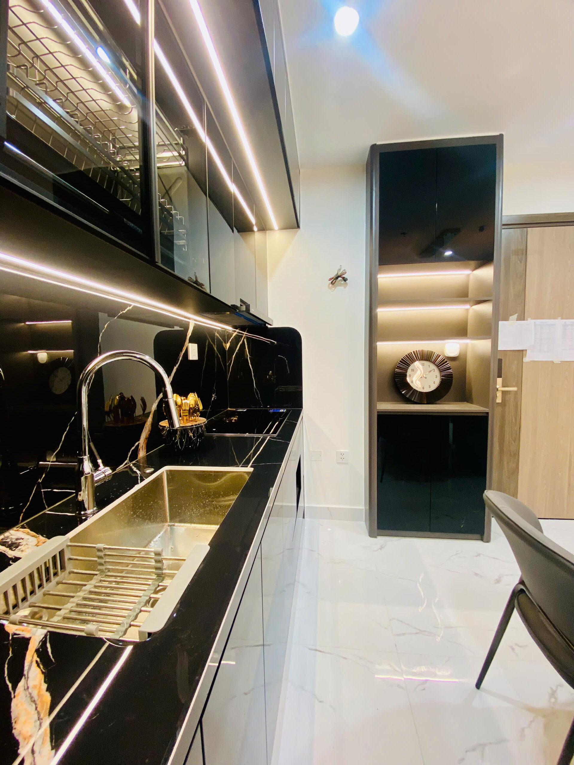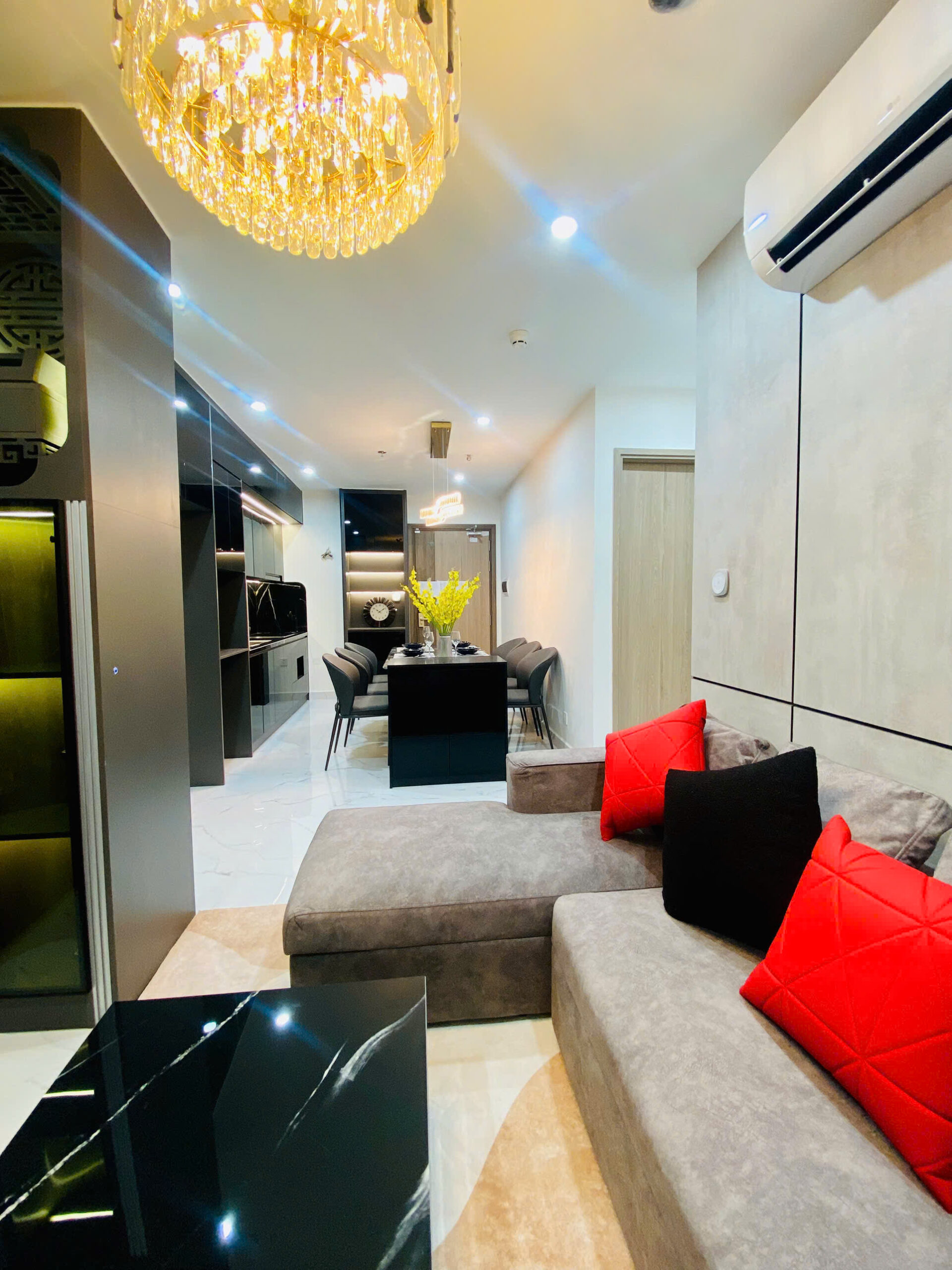 Tông màu: Đen quyền lực làm nền, vàng gold làm điểm nhấn – tạo nên không gian sống vừa ấm cúng, vừa đẳng cấp