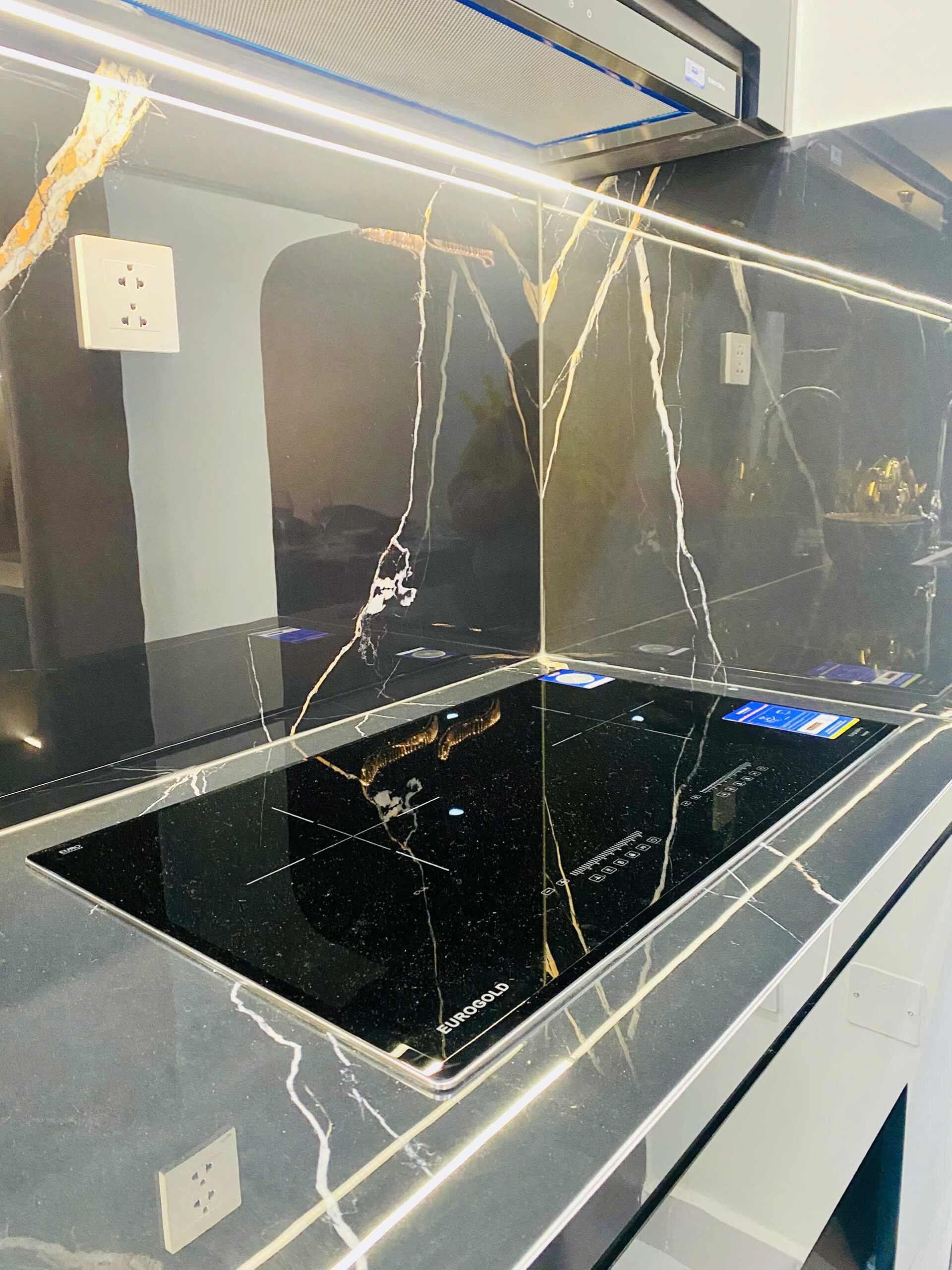 Không gian bếp sử dụng tone đen chủ đạo với mặt bếp ốp đá nhân tạo. Hệ tủ bếp trên – dưới sử dụng gỗ An Cường phủ melamine, bố trí tối ưu diện tích. Thiết bị bếp Eurogold cao cấp được tích hợp gọn gàng: bếp âm, máy hút mùi, chậu rửa inox lớn.