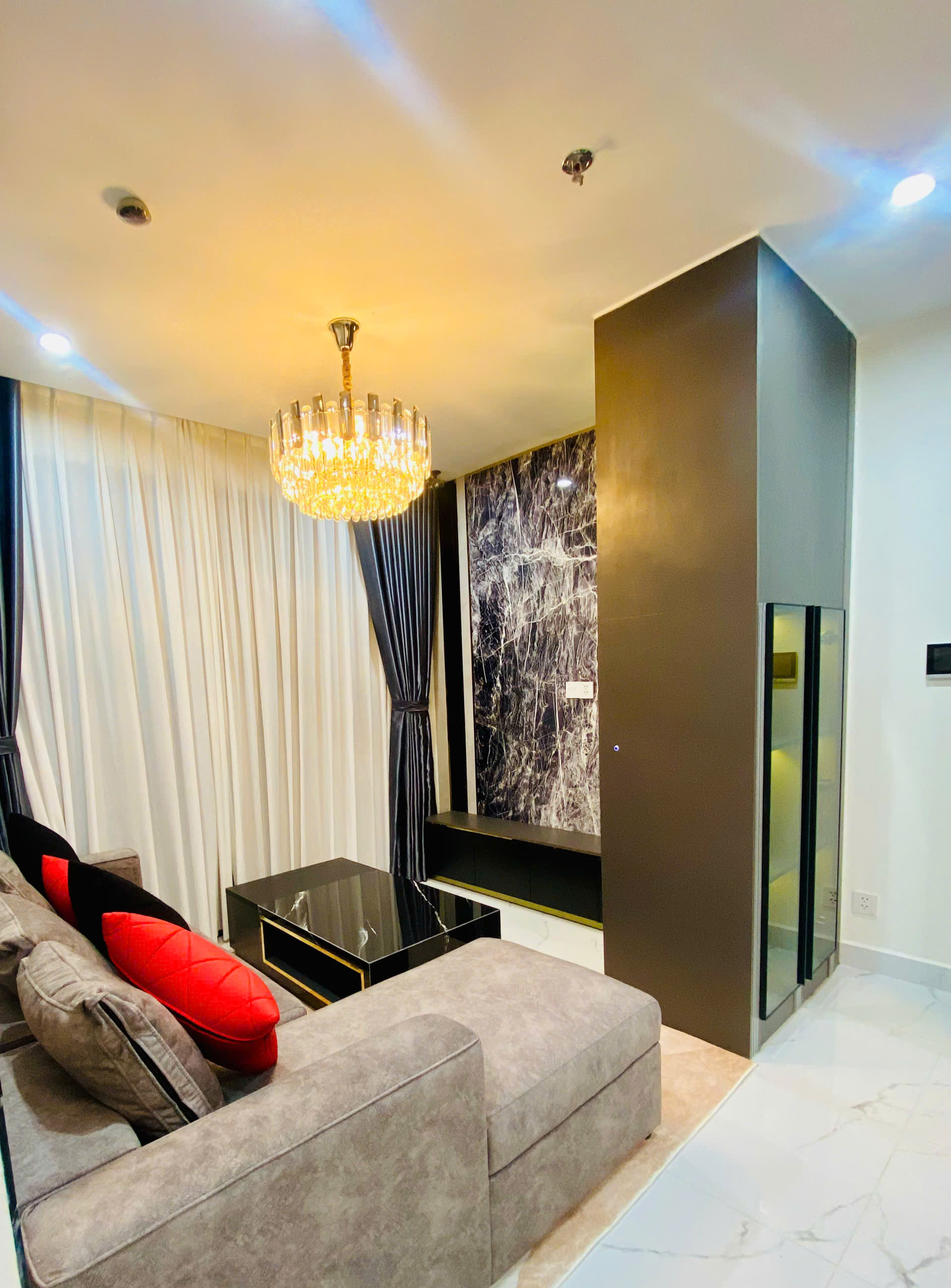 Sofa thấp dáng hiện đại, đèn lpha lê thả trần, và kệ tivi có hộc kéo, đá ốp tường nổi bật giúp giữ sự tối giản mà vẫn cực kỳ sang. Rèm bóng cao cấp điều chỉnh ánh sáng vừa phải, tăng chiều sâu cho không gian.