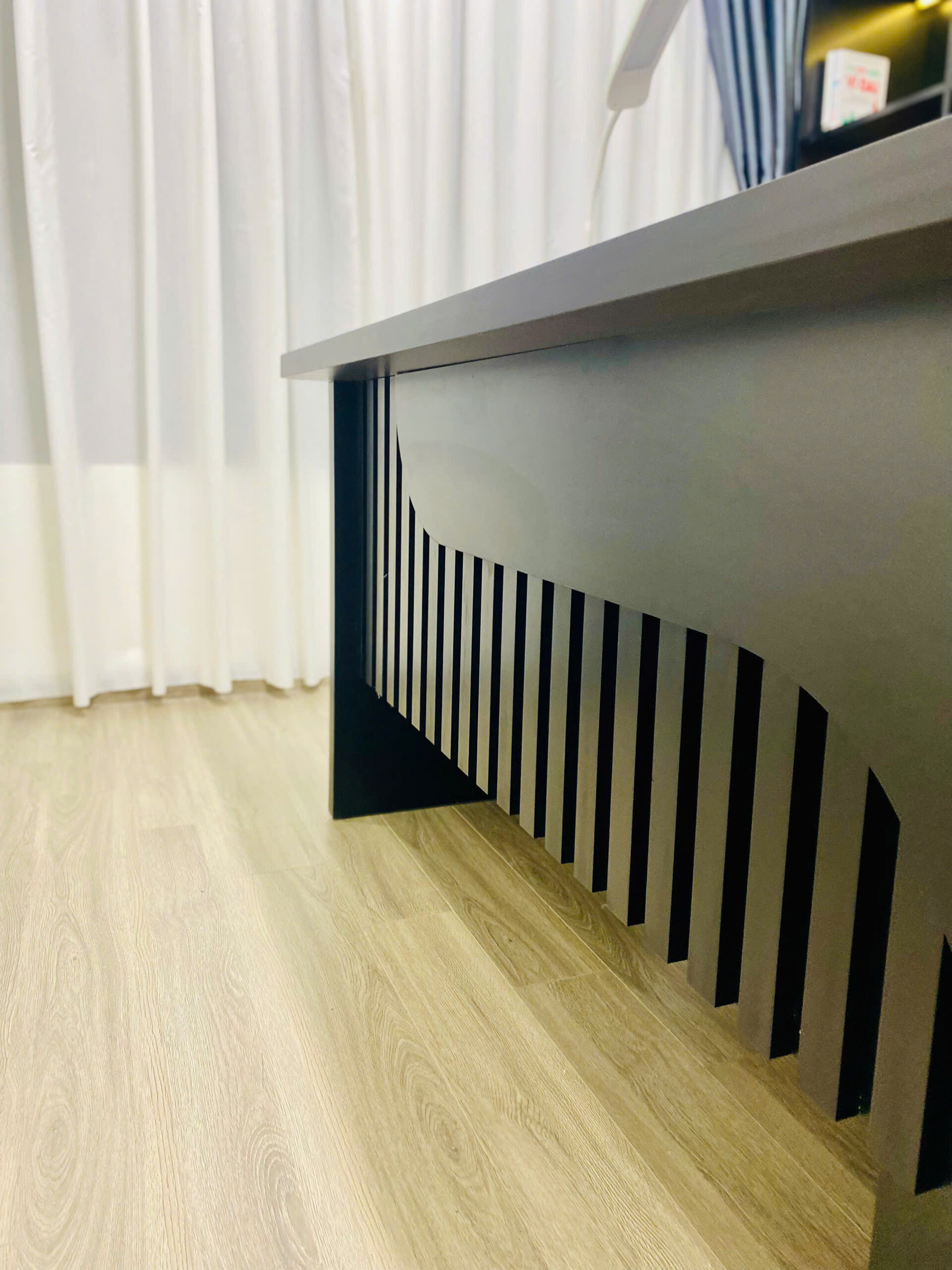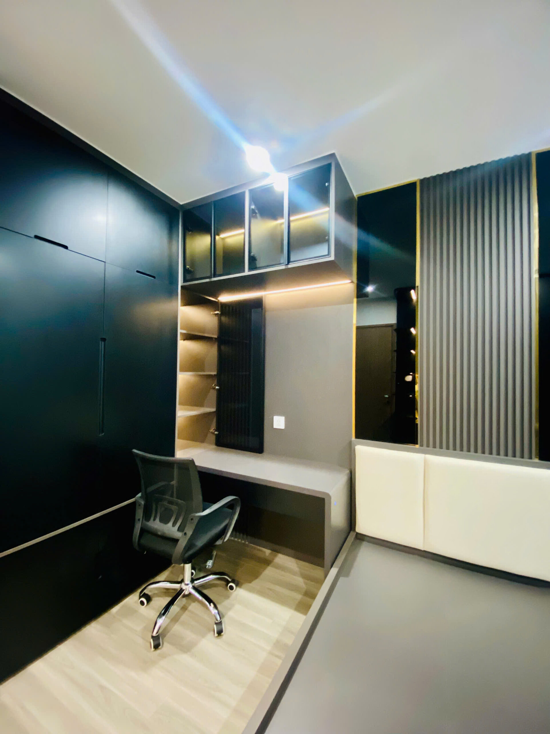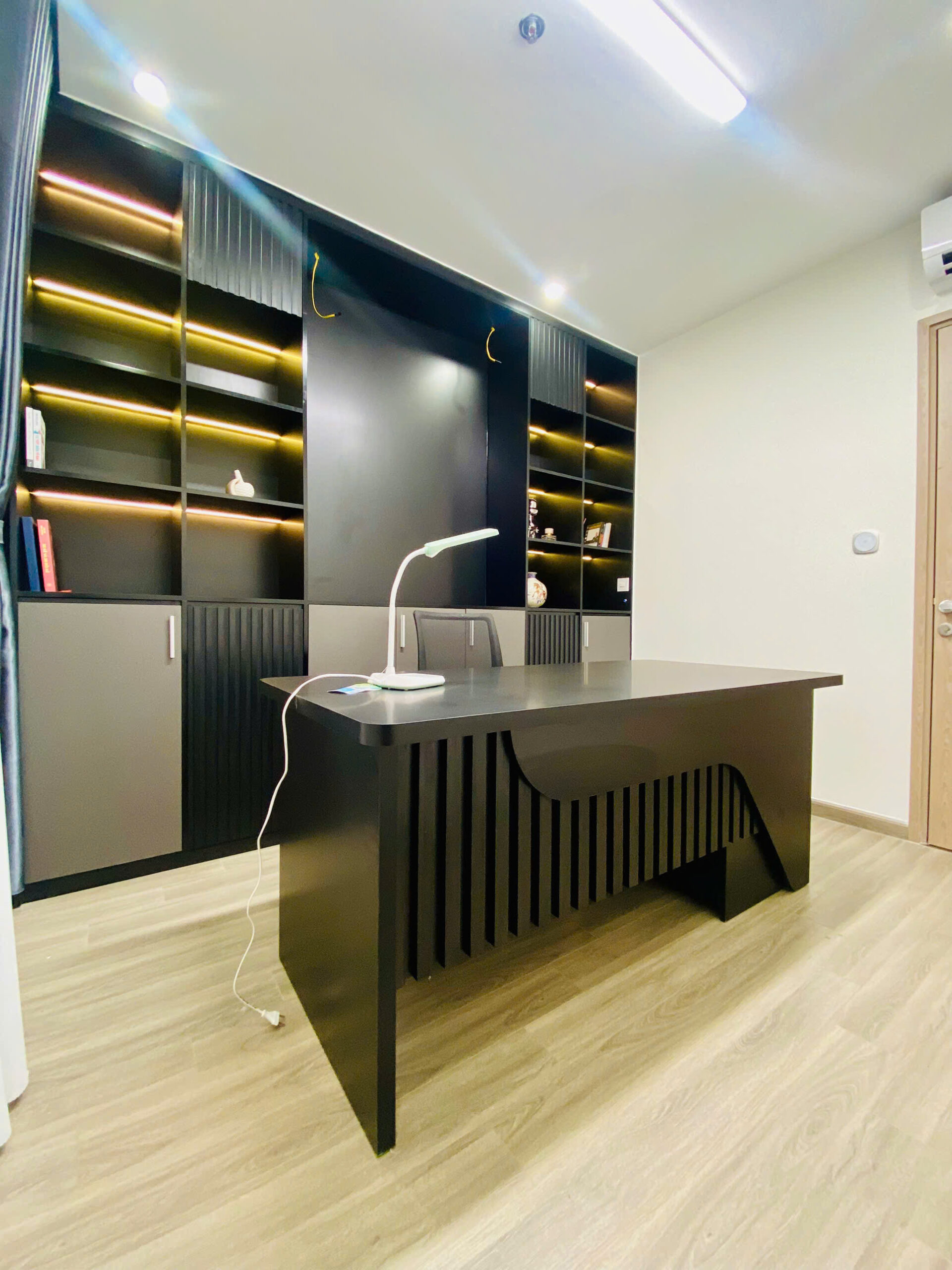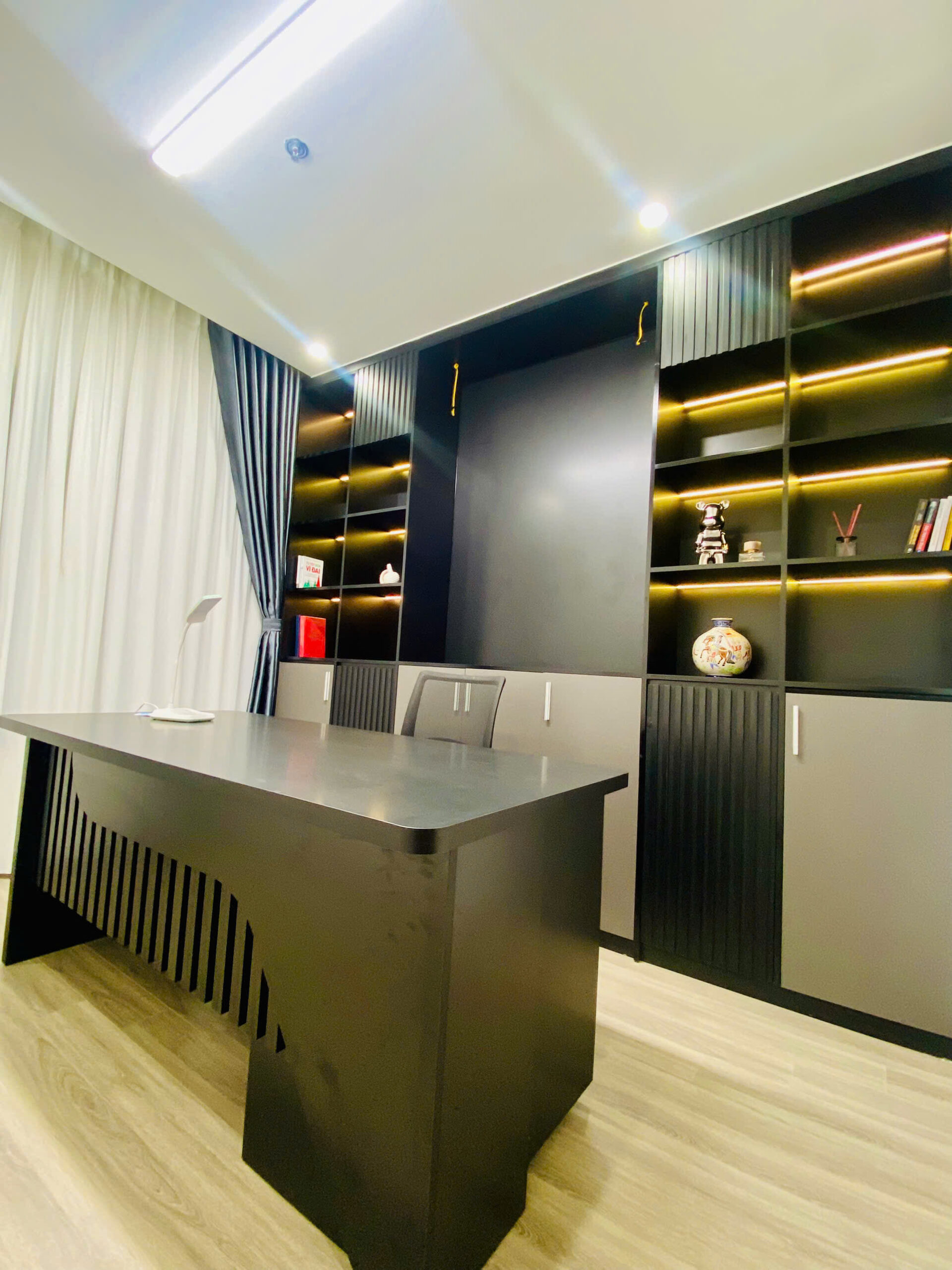 Một điểm cộng lớn cho căn hộ này là có phòng làm việc riêng biệt, khép kín, không bị ảnh hưởng bởi sinh hoạt chung. Không gian này được thiết kế theo tinh thần “executive office” – với bàn làm việc gỗ đen, tường ốp đá, đèn trần led siêu sáng.