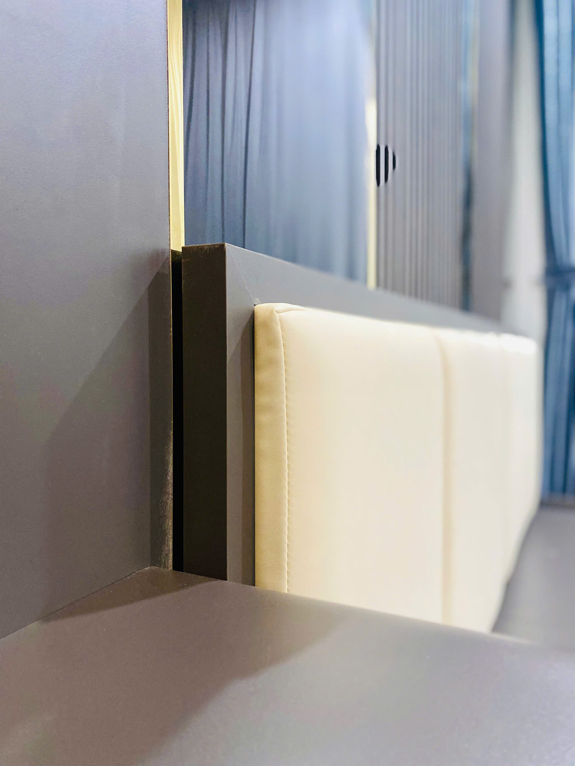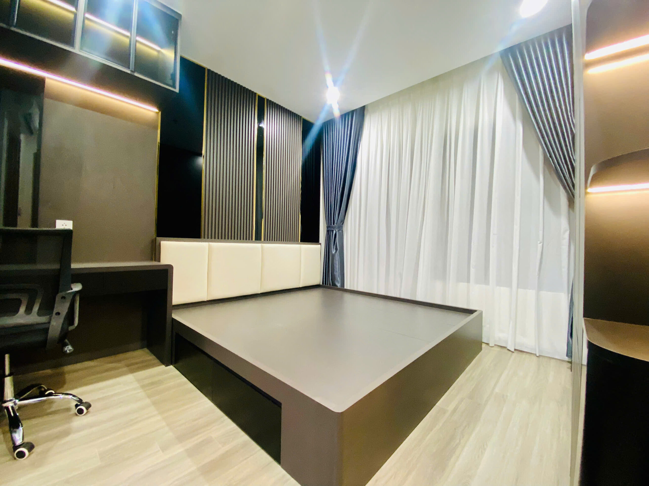 Giường bọc da cao cấp, tủ quần áo kịch trần, kết hợp rèm bóng che nắng 2 lớp, vừa sang vừa riêng tư.
