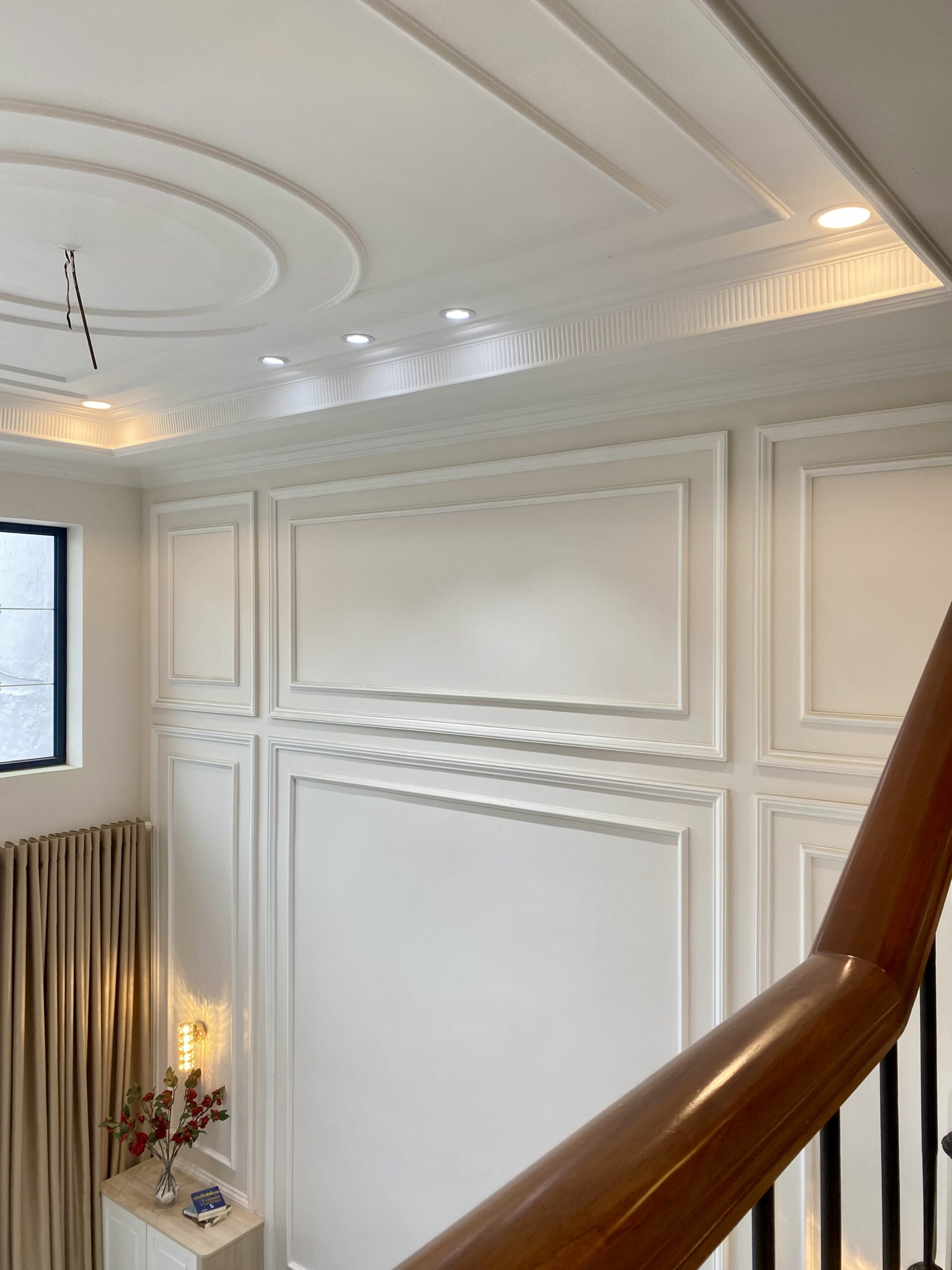 Phần kiến trúc và xây dựng là điểm nhấn nổi bật với phào chỉ tân cổ điển được thi công chỉn chu trên trần và tường. Hệ đà – trần thạch cao, các mảng trang trí cầu thang và phần mái được xử lý kỹ, đảm bảo thẩm mỹ và độ bền theo thời gian. Cầu thang sắt mỹ thuật, tay vịn gỗ đỏ, kết hợp đá hoa cương vân vàng hoàng gia tạo điểm nhấn mạnh mẽ cho không gian trung tâm. Toàn bộ cửa phòng ngủ và cửa WC sử dụng gỗ đỏ, chắc chắn và sang trọng.