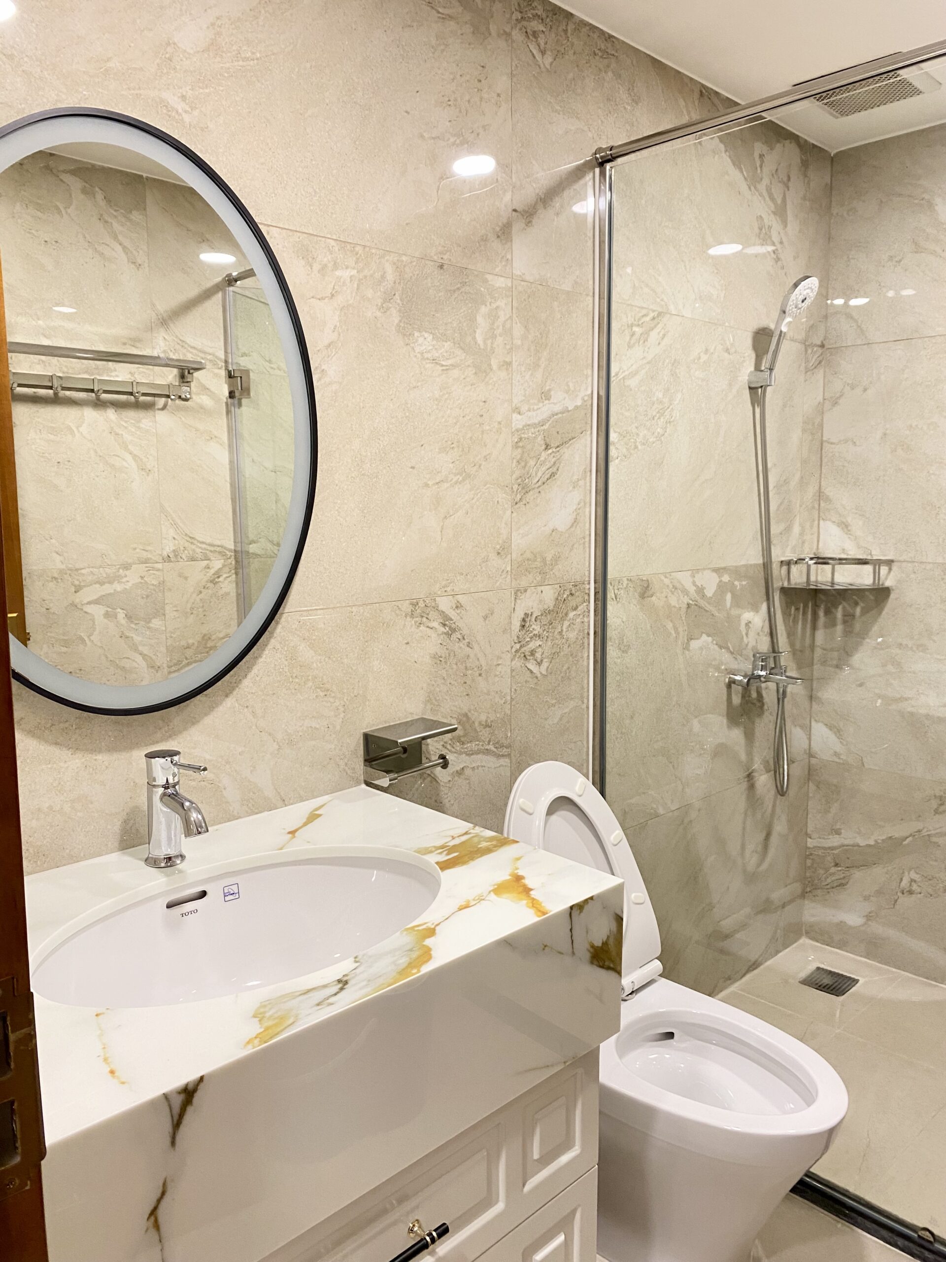 Công trình trang bị 100% thiết bị vệ sinh Toto Nhật Bản, bình năng lượng mặt trời Tân Á Đại Thành và bình nước inox 316 đặt sân thượng, đảm bảo độ bền cao khi sử dụng ngoài trời. Khu vực sân thượng được lát gạch chống trơn và ốp gạch toàn bộ tường, giúp hạn chế thấm, bong tróc, bền bỉ hơn nhiều so với sơn nước thông thường.