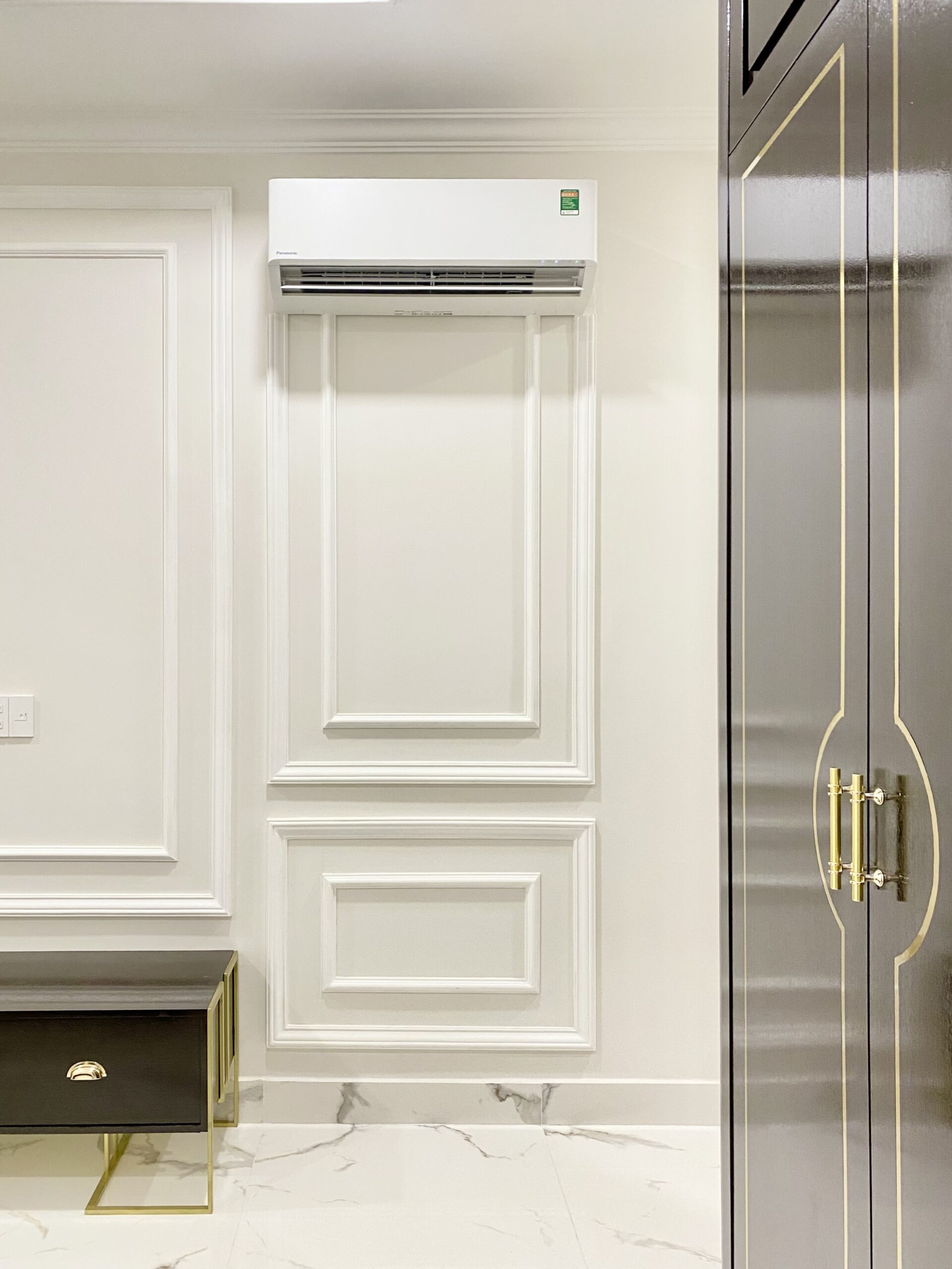 Phần lan can – cửa – kính được thi công đồng bộ đúng tinh thần tân cổ điển. Tất cả lan can các tầng dùng nhôm đúc hoa văn nghệ thuật, tạo điểm nhấn cho mặt đứng công trình. Toàn bộ khung cửa sử dụng nhôm Xingfa kết hợp kính cường lực 2 lớp, tăng khả năng cách âm – cách nhiệt. Điểm nhấn họa tiết nhôm màu vàng ở giữa kính vừa trang trí vừa nâng tầm tổng thể kiến trúc. Hệ đèn trang trí và tay nắm cửa được lựa chọn đúng phong cách, tạo sự thống nhất từ ngoài vào trong.
