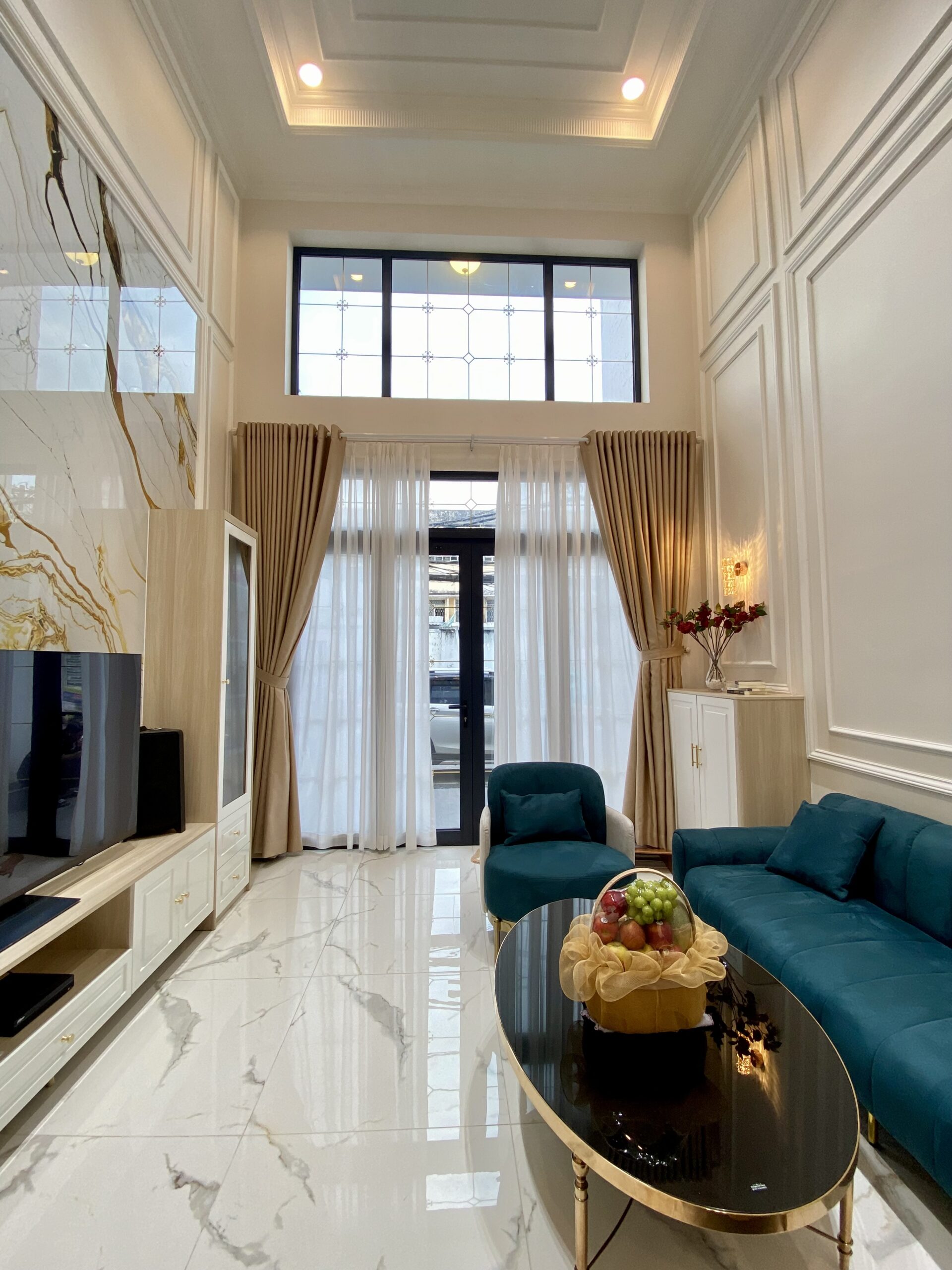 Công trình có diện tích sàn 4 x 16m, quy mô 1 trệt 3 lầu, tổng mức đầu tư trọn gói 2,9 tỷ đồng. Tầng trệt thiết kế thông tầng cao 6m, bố trí phòng khách phía trước, phía sau là bếp và không gian sinh hoạt – ăn uống, mang lại cảm giác cao ráo, thông thoáng và sang trọng ngay từ khi bước vào nhà.