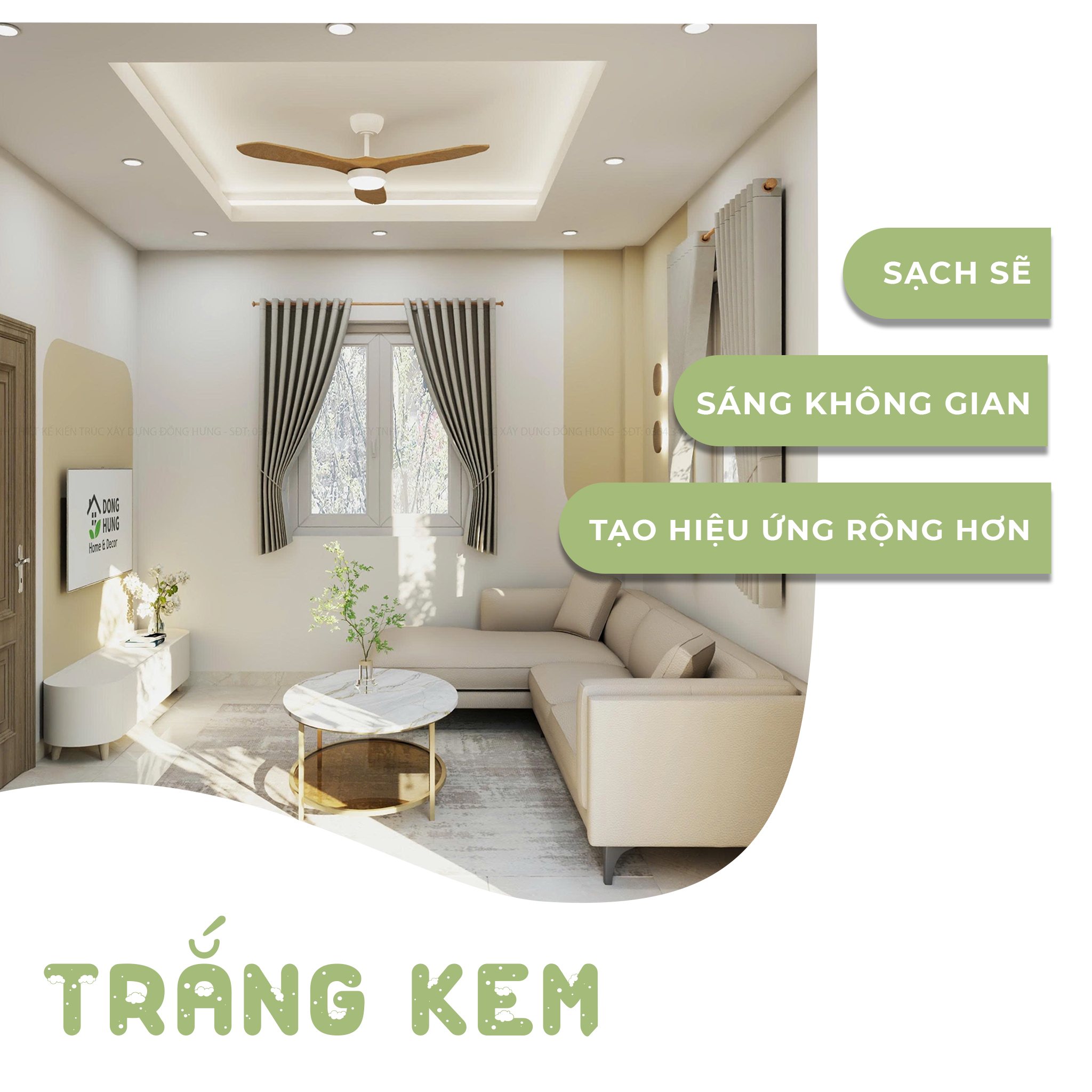 Trắng kem là phiên bản ấm áp hơn của trắng truyền thống. Màu sắc này giúp không gian trở nên sáng sủa nhưng không tạo cảm giác lạnh hay chói mắt.