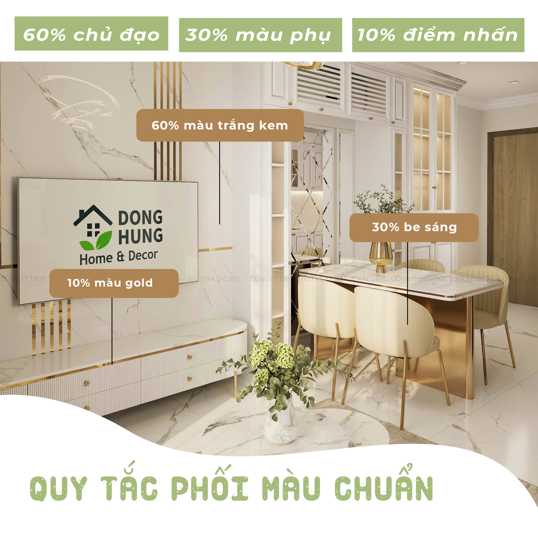 - 60%: Màu chủ đạo (trắng kem, be hoặc xanh nhạt)